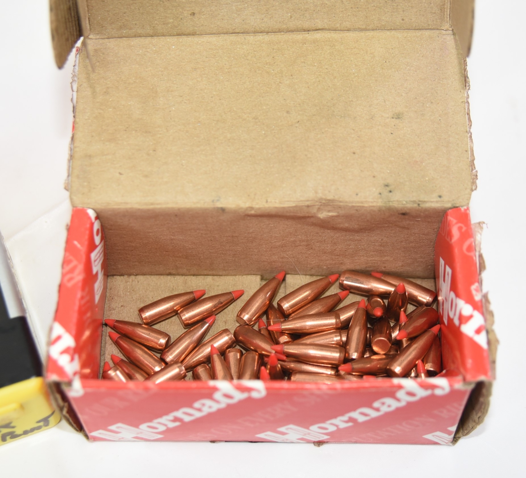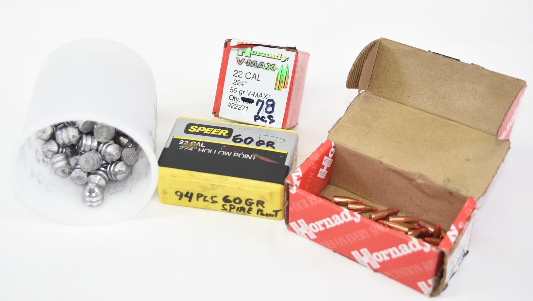 - Hornady 22 Caliber (.224"), 55 grain V-Max reloading bullets