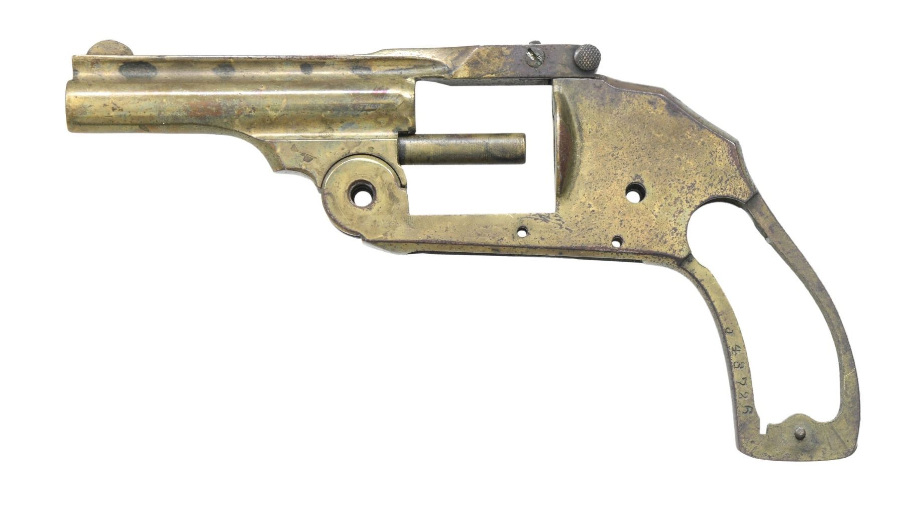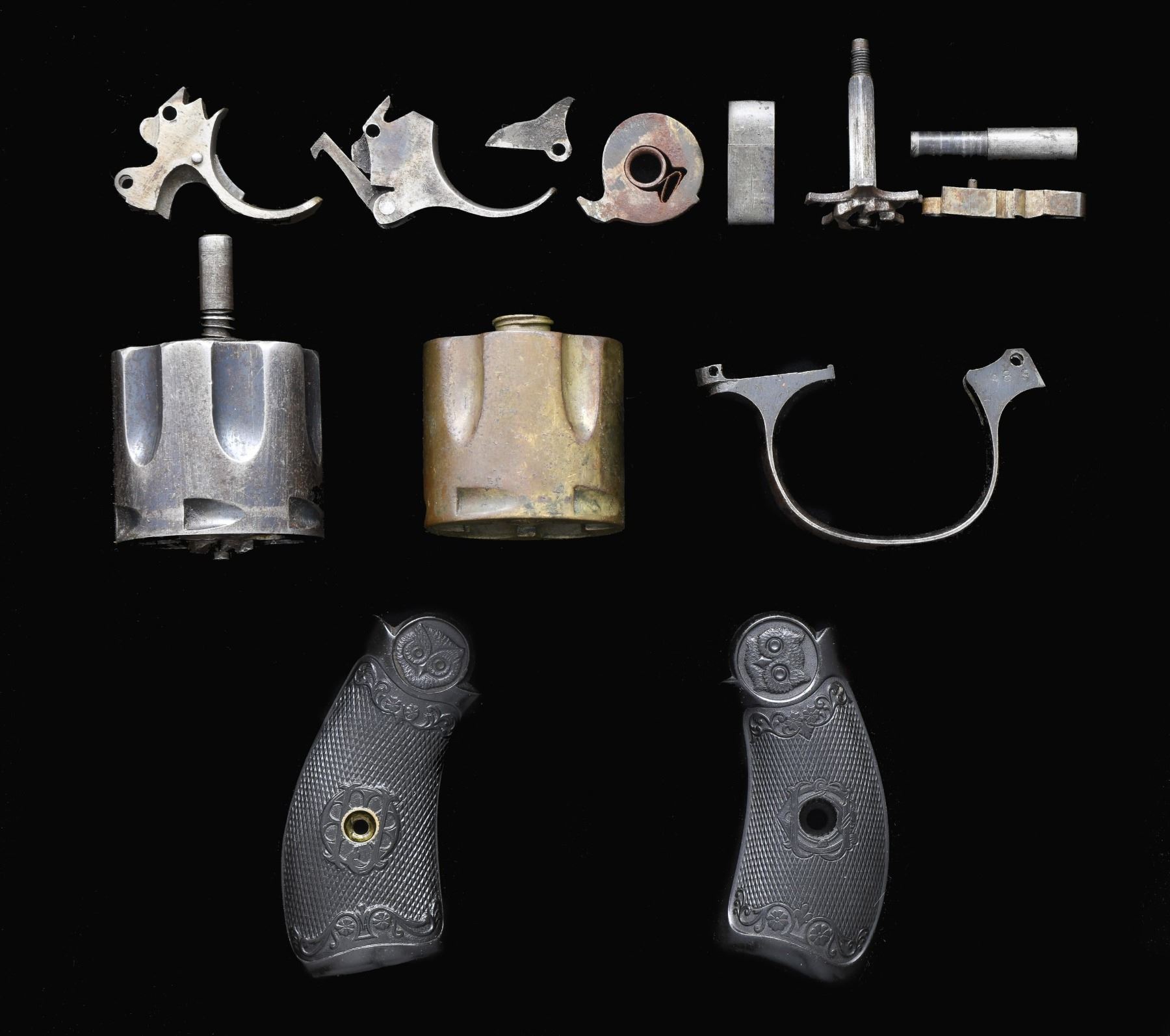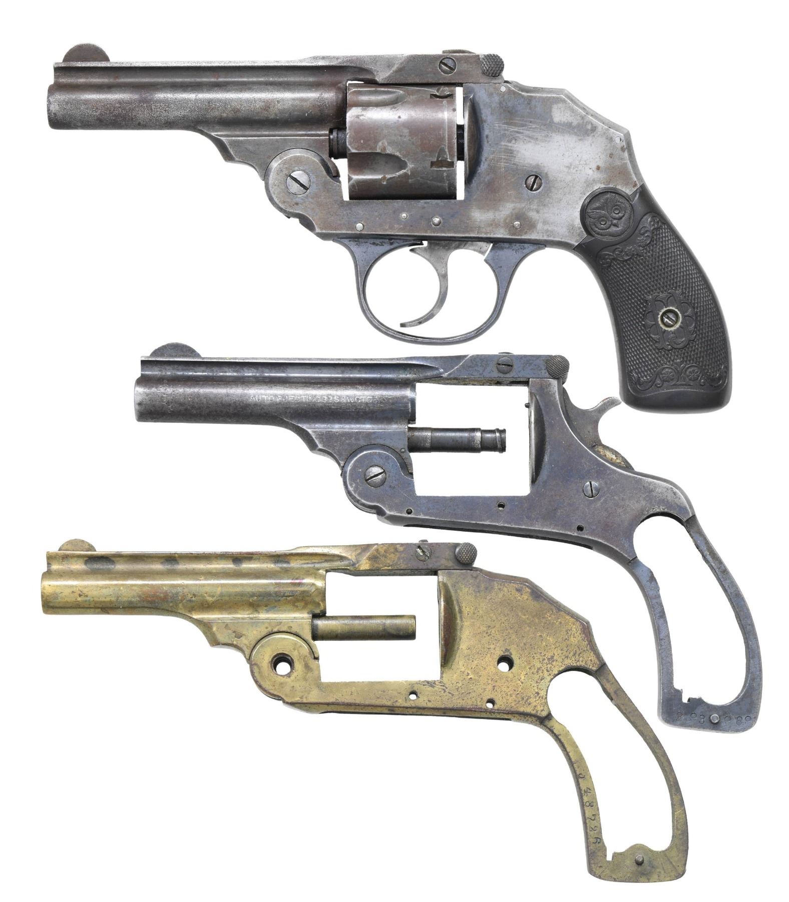 UNATTACHED ACCESSORIES: bag of accessories for revolvers #2 & 3 that include 2 cyls., Iver Johnson grips & various small parts. 1) IVER JOHNSON 3RD MODEL SAFETY AUTOMATIC HAMMERLESS. Cal. 38 S&W. S# D29911 (under grips). Mfg. 1911. Bbl. 3 1/4". Fixed sights. 5 shot fluted cyl. Two piece hard rubber grips. CONDITION: metal has gray/brown patina appearance with faded blue, marks & scratches. Good grips. Bore shows strong rifling & light pitting. (25-4107/MD). CURIO. 2) PARTS HARRINGTON & RICHARDSON AUTOMATIC EJECTING THIRD MODEL. Cal. 32 S&W. S# 293989. Bbl. 3 1/4". Fixed sights. CONDITION: Various parts are either included in bag or not present. Metal shows traces of blue mixed with gray patina, peppery oxidation & pitting. Bore shows strong rifling with spots of pitting. (25-4108/MD). MODERN. 3) PARTS IVER JOHNSON 2ND MODEL SAFETY AUTOMATIC HAMMERLESS. Cal. 38 S&W. S# J43726. originally mfg. 1903. Bbl. 3 1/4"; muzzle portion of bore appears to have been milled for 22 cal. insert. Fixed sights. CONDITION: some small parts in accessories bag or missing. Metal has bronze appearance with spots of corrosion & peppery patina. Pitted bore. (25-4109/MD). MODERN. $300-500.