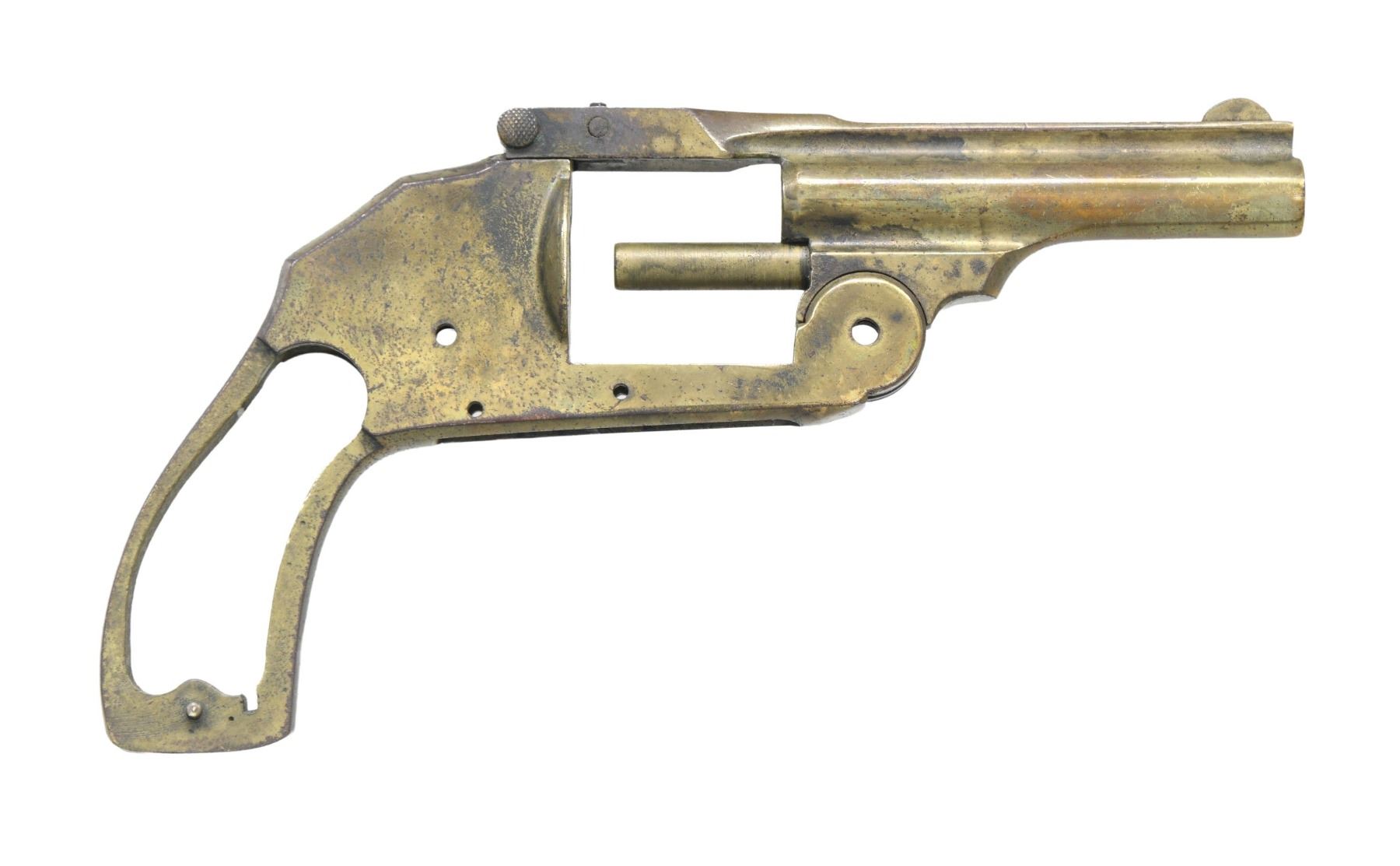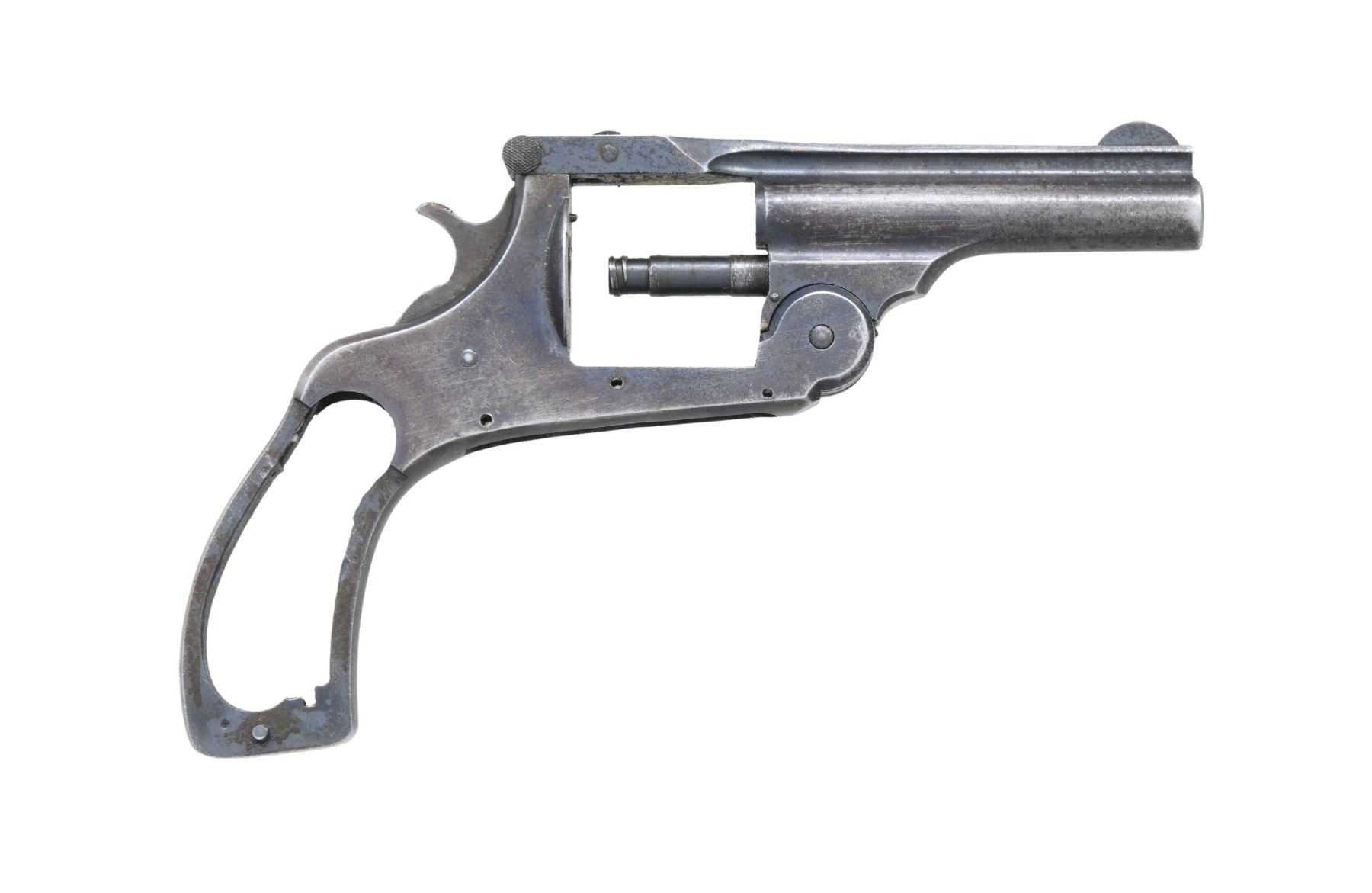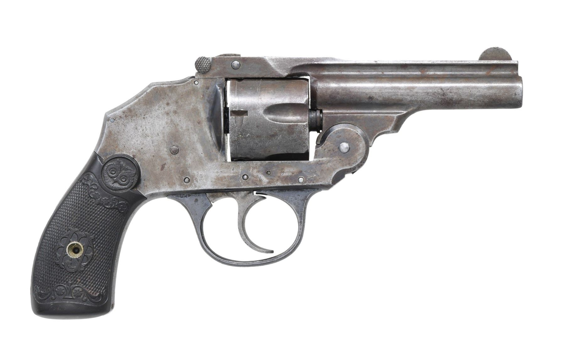 UNATTACHED ACCESSORIES: bag of accessories for revolvers #2 & 3 that include 2 cyls., Iver Johnson grips & various small parts. 1) IVER JOHNSON 3RD MODEL SAFETY AUTOMATIC HAMMERLESS. Cal. 38 S&W. S# D29911 (under grips). Mfg. 1911. Bbl. 3 1/4". Fixed sights. 5 shot fluted cyl. Two piece hard rubber grips. CONDITION: metal has gray/brown patina appearance with faded blue, marks & scratches. Good grips. Bore shows strong rifling & light pitting. (25-4107/MD). CURIO. 2) PARTS HARRINGTON & RICHARDSON AUTOMATIC EJECTING THIRD MODEL. Cal. 32 S&W. S# 293989. Bbl. 3 1/4". Fixed sights. CONDITION: Various parts are either included in bag or not present. Metal shows traces of blue mixed with gray patina, peppery oxidation & pitting. Bore shows strong rifling with spots of pitting. (25-4108/MD). MODERN. 3) PARTS IVER JOHNSON 2ND MODEL SAFETY AUTOMATIC HAMMERLESS. Cal. 38 S&W. S# J43726. originally mfg. 1903. Bbl. 3 1/4"; muzzle portion of bore appears to have been milled for 22 cal. insert. Fixed sights. CONDITION: some small parts in accessories bag or missing. Metal has bronze appearance with spots of corrosion & peppery patina. Pitted bore. (25-4109/MD). MODERN. $300-500.