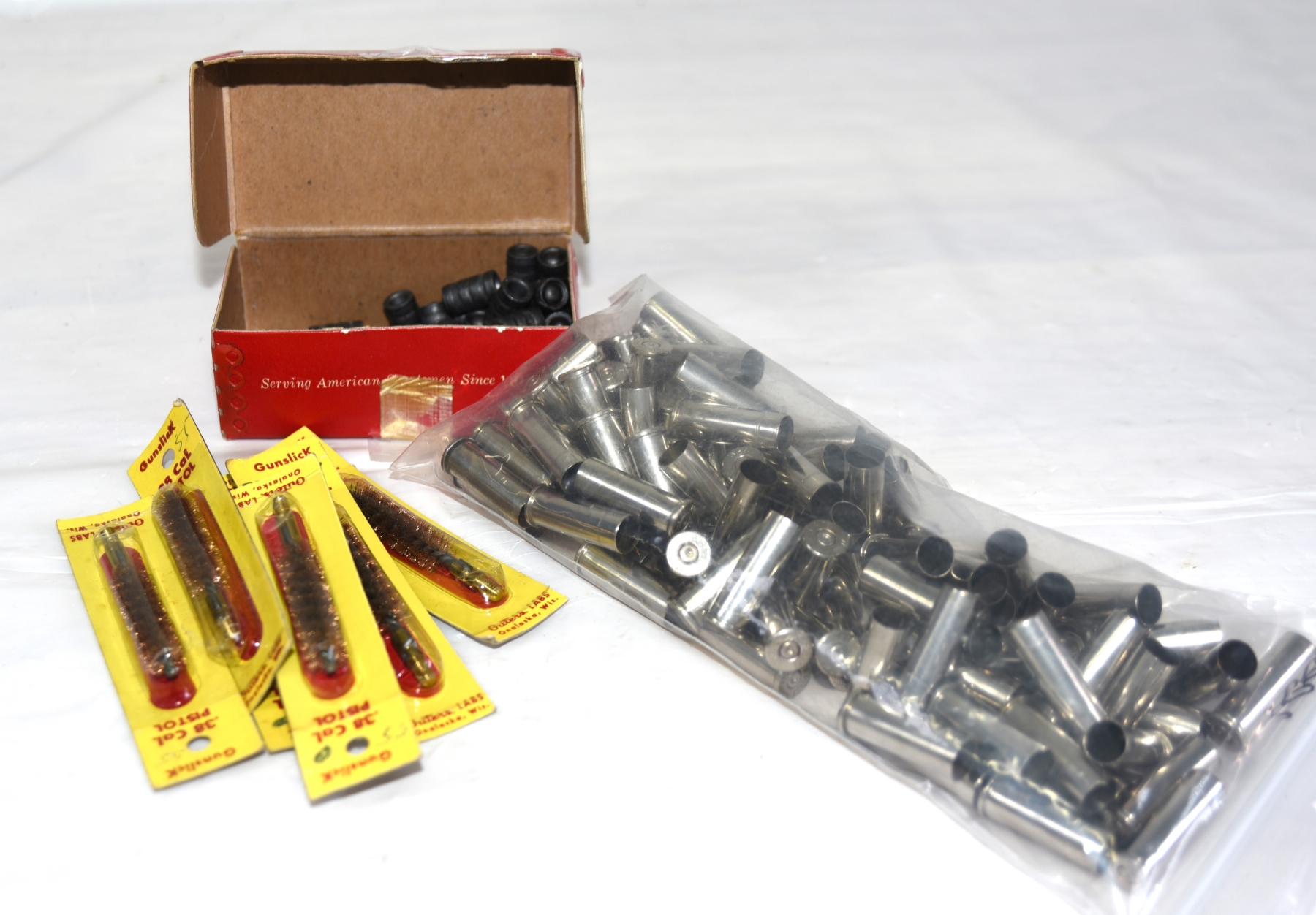 100 Pieces 38 Spec Nickle Cases, 29Pieces 38 148 gr WC Bullets, 6 Pieces 38cal Brass Brushes