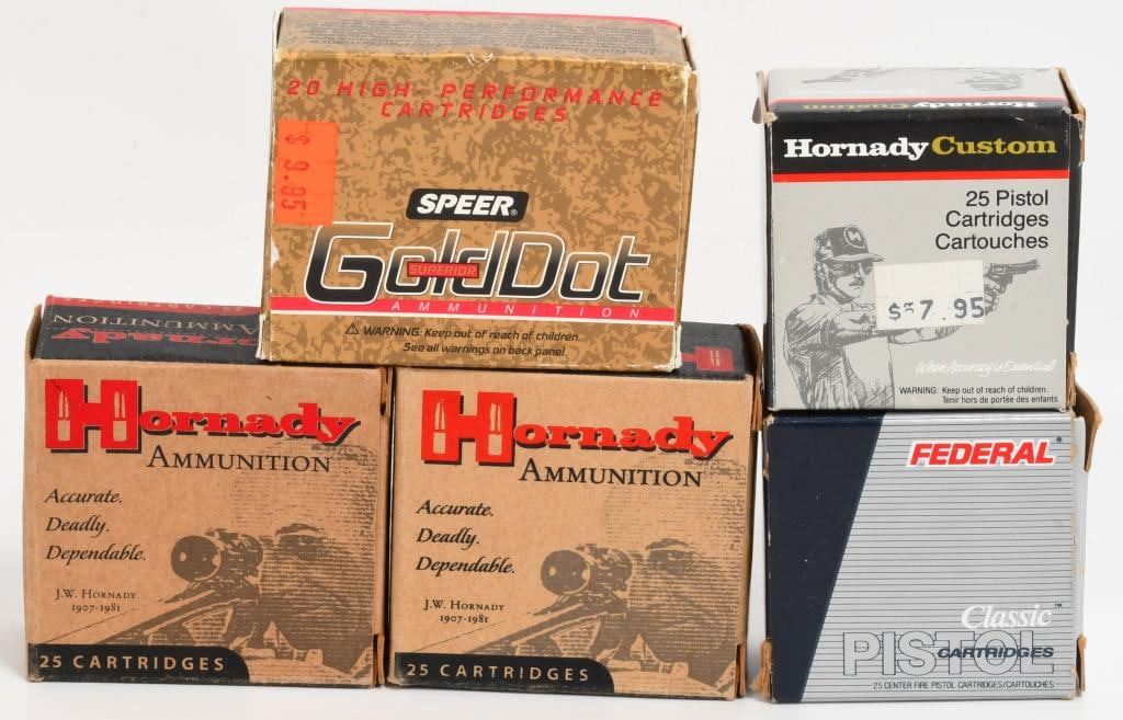 Hello, bidders! Available now are 117 rounds of .25 ACP ammunition, including 42 rounds of Hornady Custom 35-grain XTP, 25 rounds of Federal 50-grain, 25 rounds of 35-grain XTP, and 25 rounds of Speer Gold Dot 35-grain GDHP.