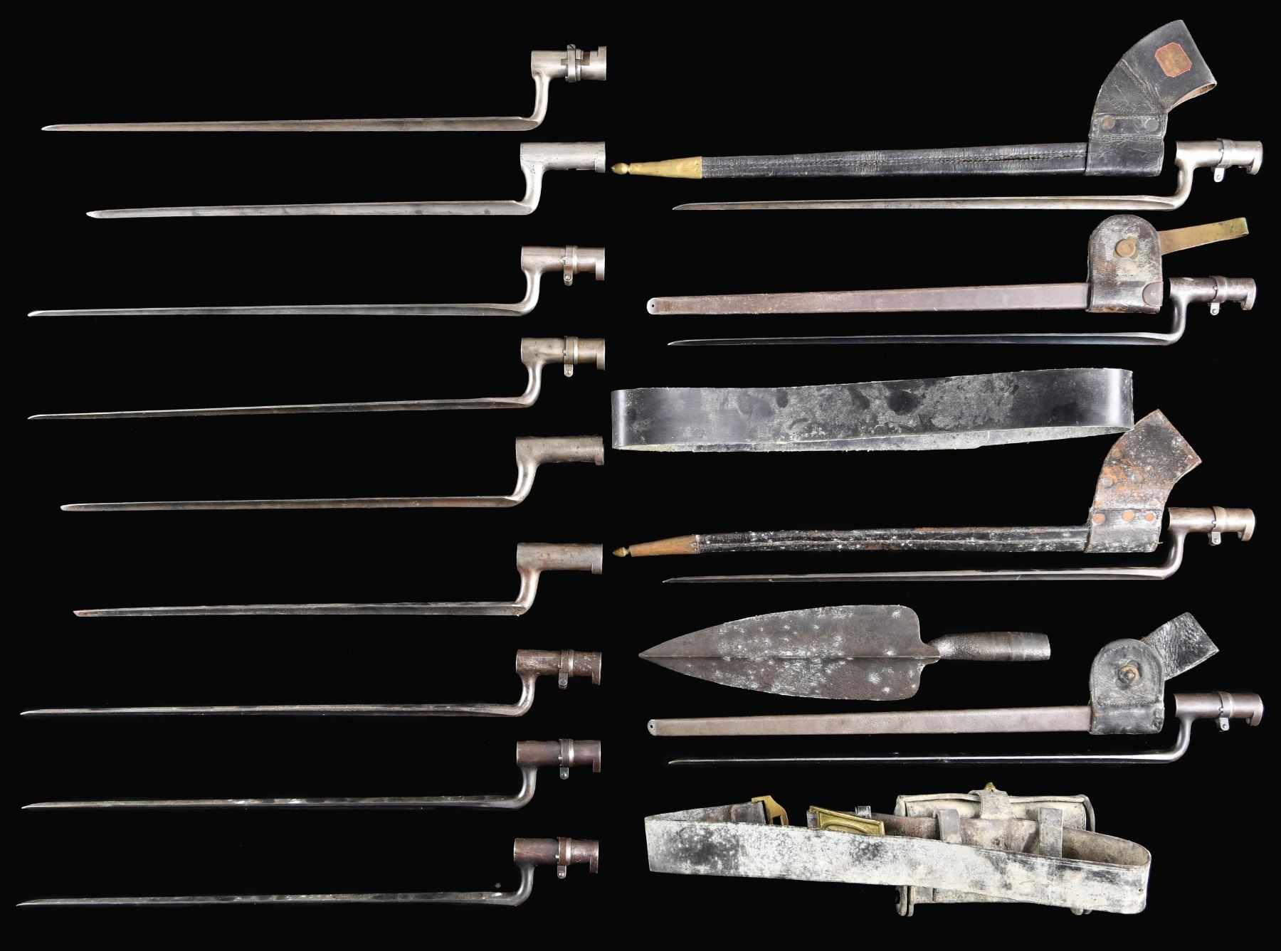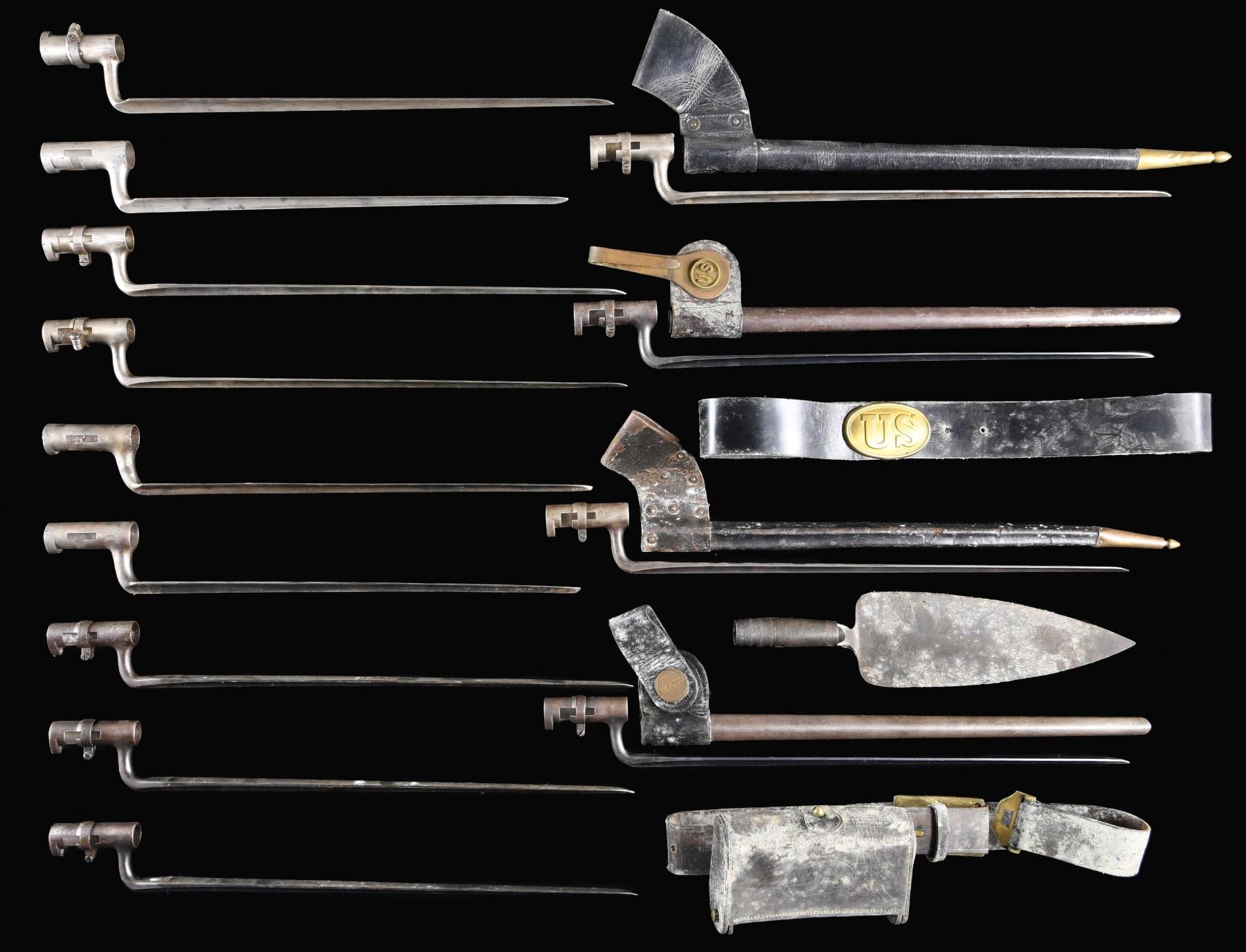 Grouping includes: 1 Pattern 1807 bayonet. 2 Model 1816 bayonets. 1 Model 1847 Artillery Musketoon bayonet. 2 Model 1855 bayonets. 1 Model 1855 bayonet w/ scabbard. 3 Model 1873 bayonets. 1 Model 1873 bayonet w/ scabbard. 1 Model 1873 bayonet w/ scabbard having "US" brass frog. 1 Model 1873 bayonet w/ scabbard having brass "MASS" medallion. 1 Model 1873 Trowel bayonet. Also includes 2 "US" brass buckle leather belts & 1 1 cartridge pouch for 45-70 rds. CONDITION: bayonets show heavy cleaning, patina, & large amounts of white mildew. (02-24461/MD). $500-800.