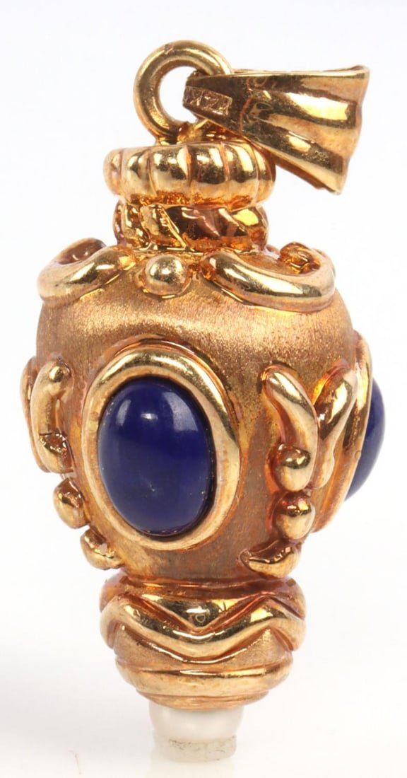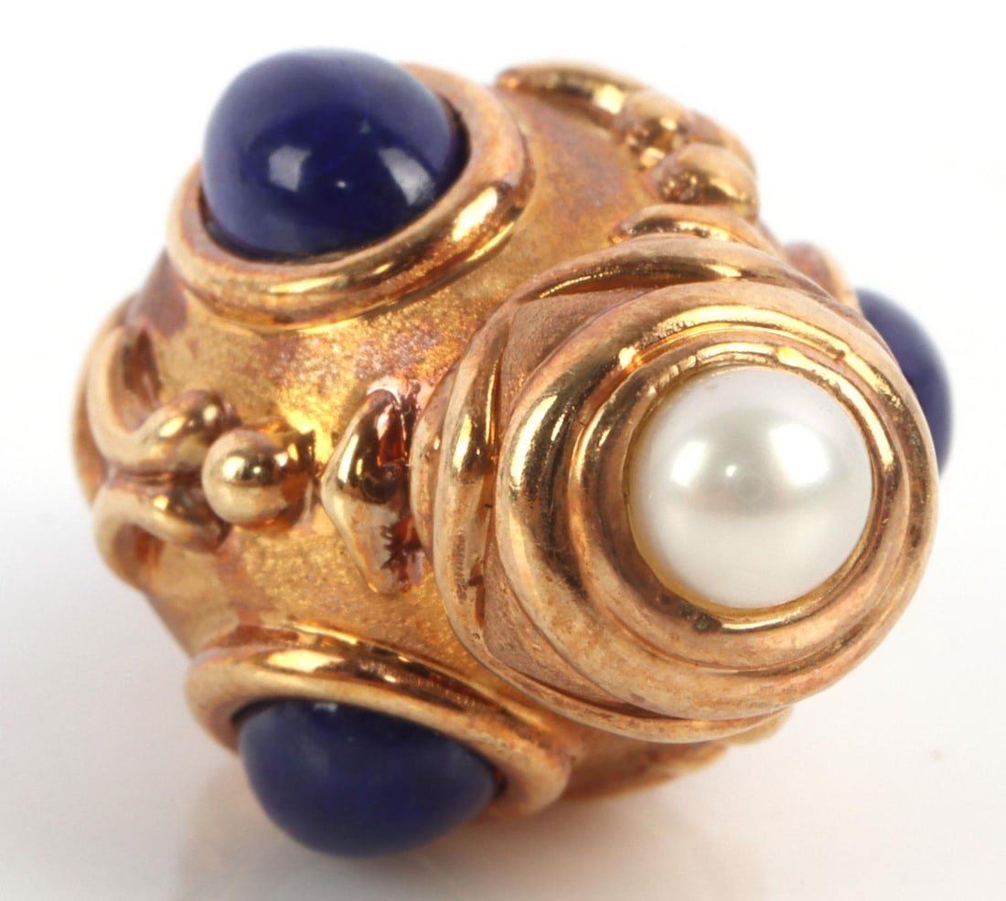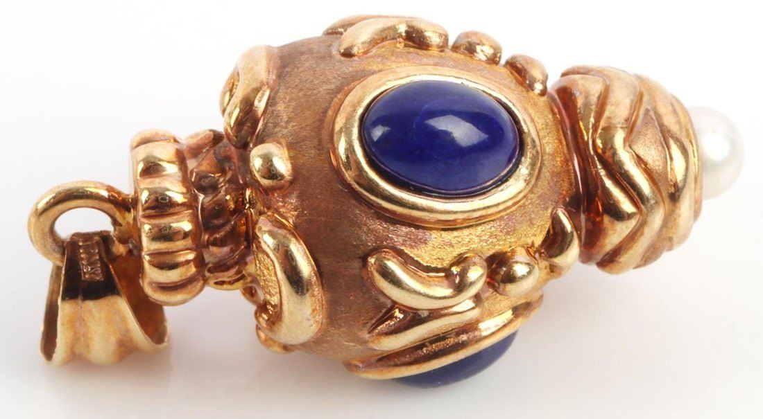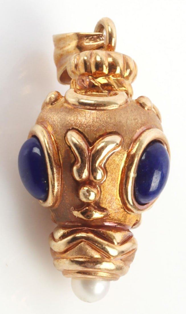 Vintage 1990's Italian Baroque style 14kt gold pendant with Lapis Lazuli and pearl cabochon. Total weight of 2.9 grams. Length of 1 3/8 inches. This lot has a reserve.