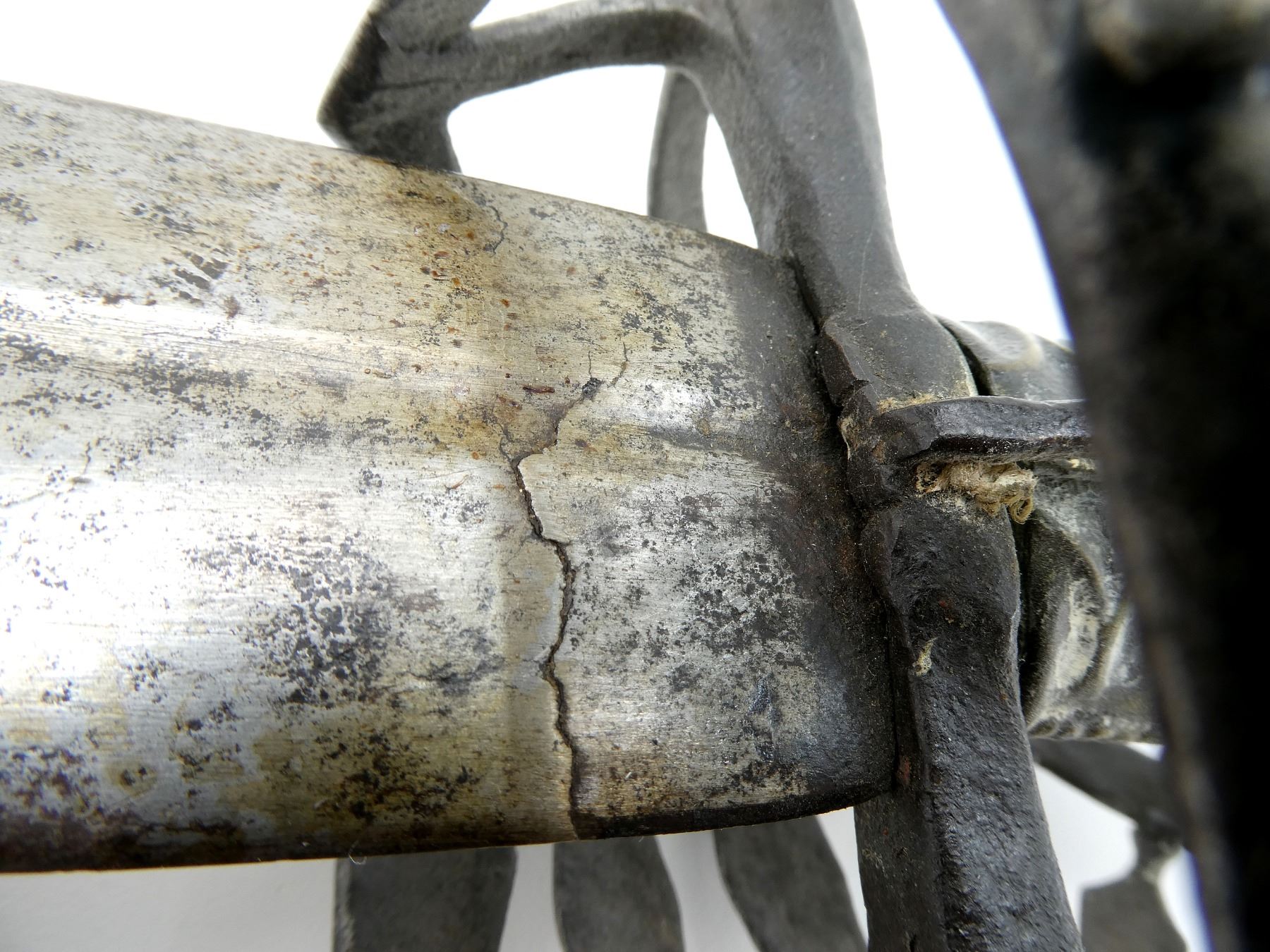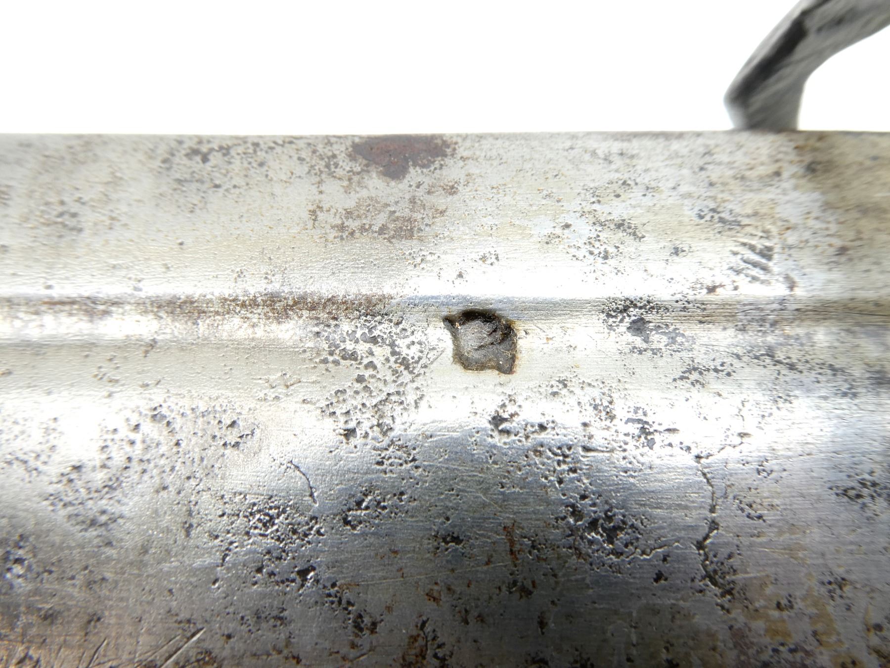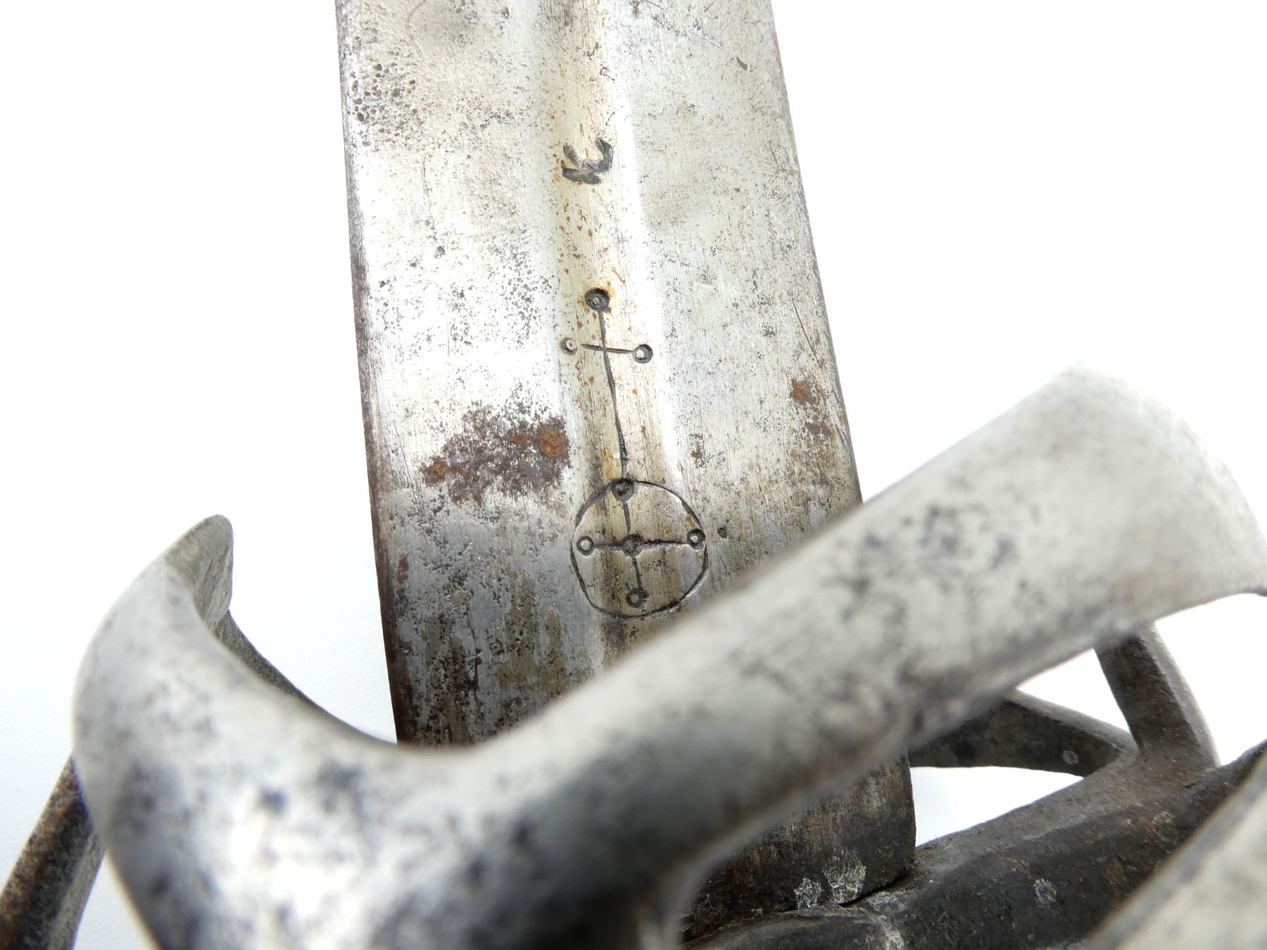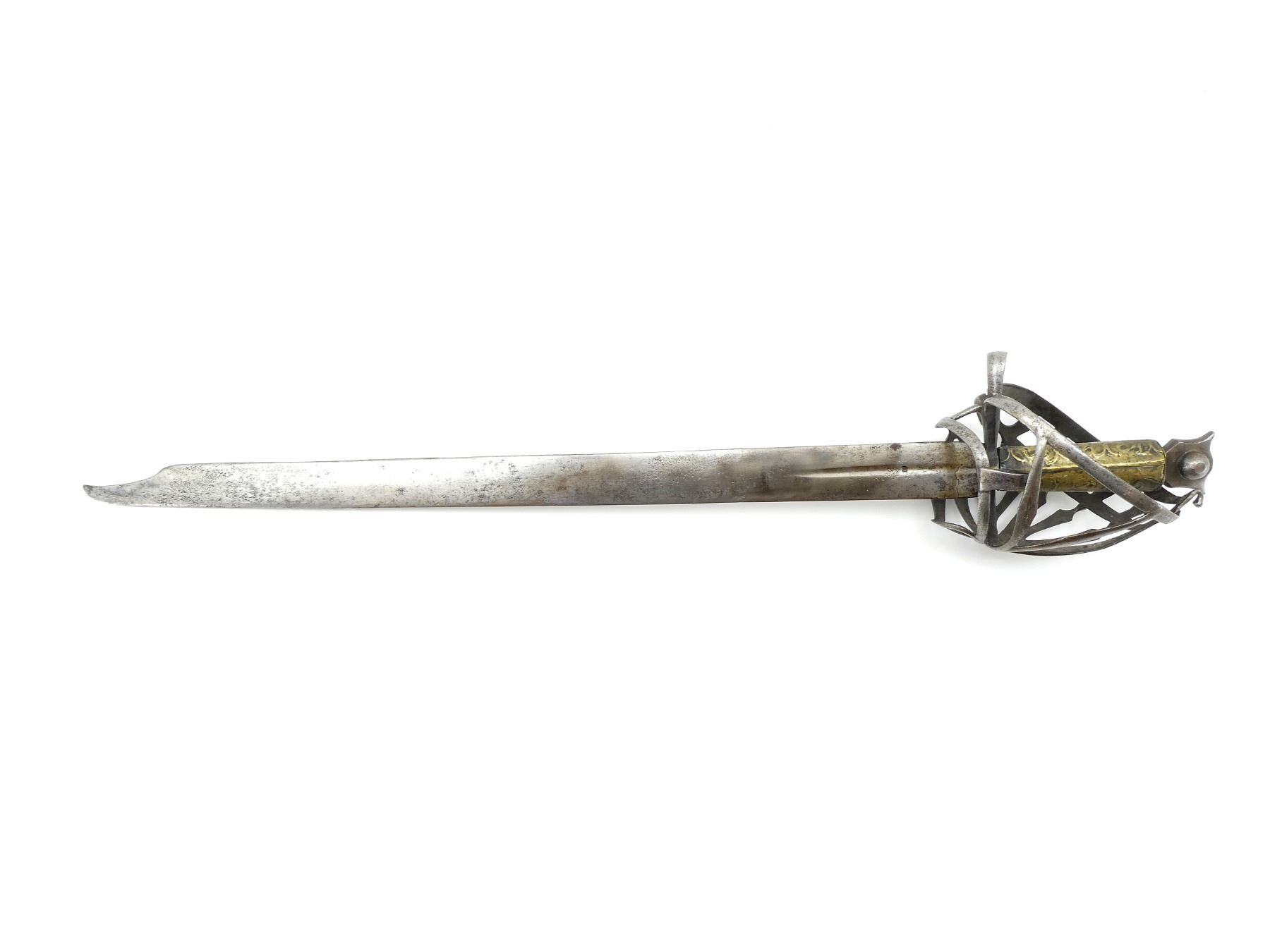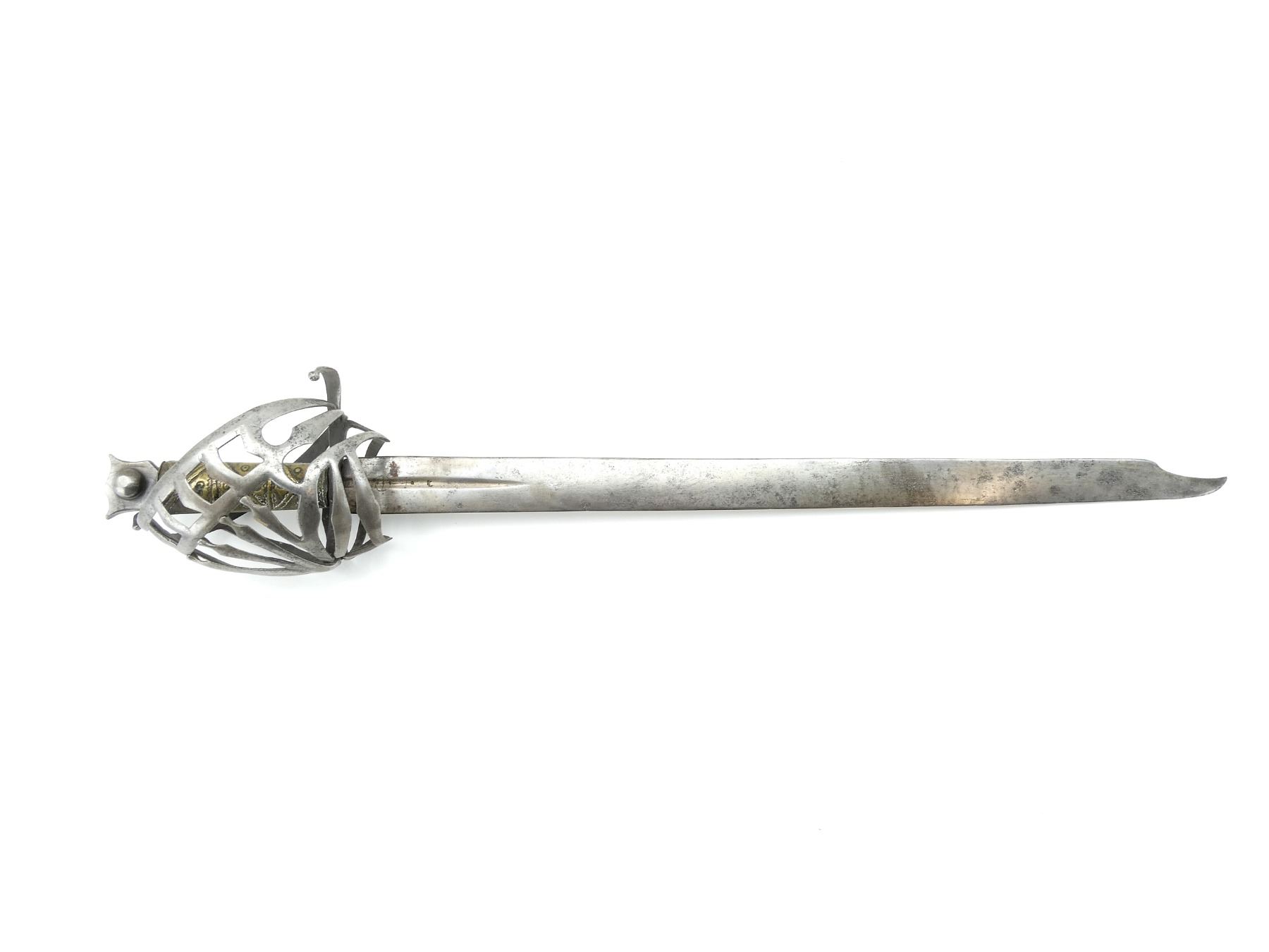 (1) STRAIGHT TAPERED DOUBLE-EDGED BLADE, BLADE HAS BEEN SHORTENED WITH CLIPPED POINT, BLADE MARKED WITH 17TH CENTURY ORB MARK, POSSIBLY GERMAN MAKER WITH ANOTHER PROOF / MAKER MARK, OTHER-SIDE MARKED WITH UN-CLEAR PROOF / MAKER'S MARK, TYPE 2 BASKET HILT, HILT IS LOOSE / WIGGLES, BRASS WRAPPED GRIP WITH VARIOUS DECORATIVE DESIGNS, METAL "CAT'S HEAD" SHAPED POMMEL, NO VISIBLE MARKINGS, NO SCABBARD, BLADE APPROX. 25" & OVERALL LENGTH APPROX. 31". SEE PHOTOS.