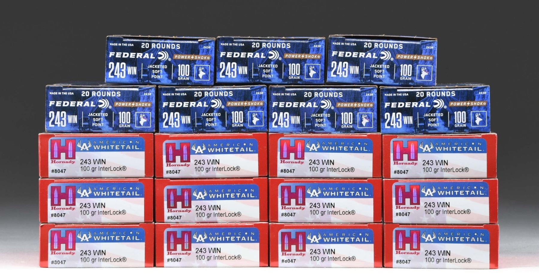 1.) FEDERAL Power Shok. 7 boxes of 20. 100gr. Jacketed soft point. 2.) HORNADY American Whitetail. 12 boxes of 20. 100 gr. InterLock. CONDITION: boxes may show very light handling wear. Ammo appears clean and serviceable. (02-23788/RW). AMMO. $300-500.