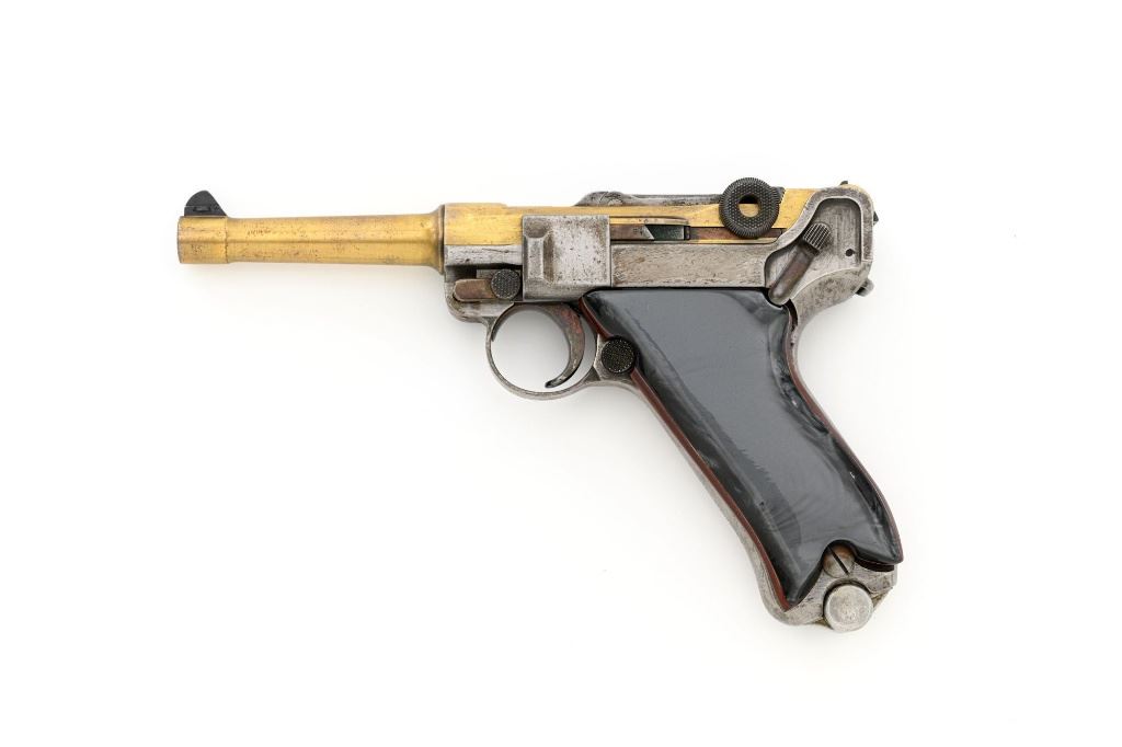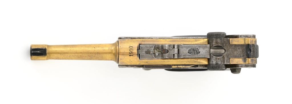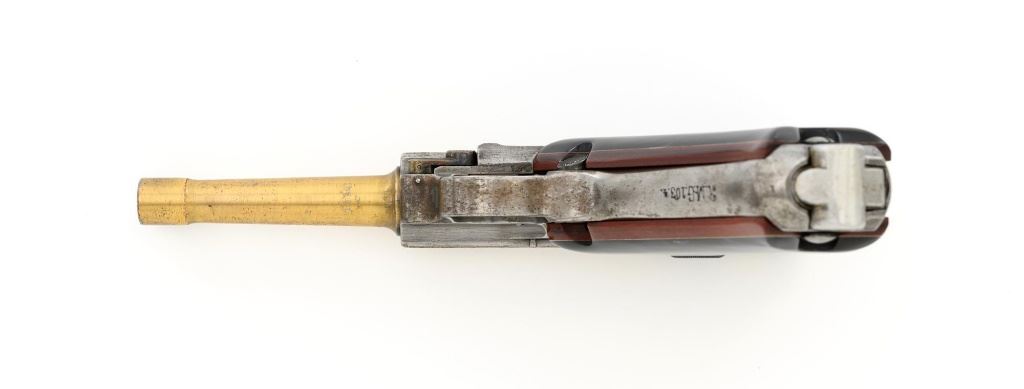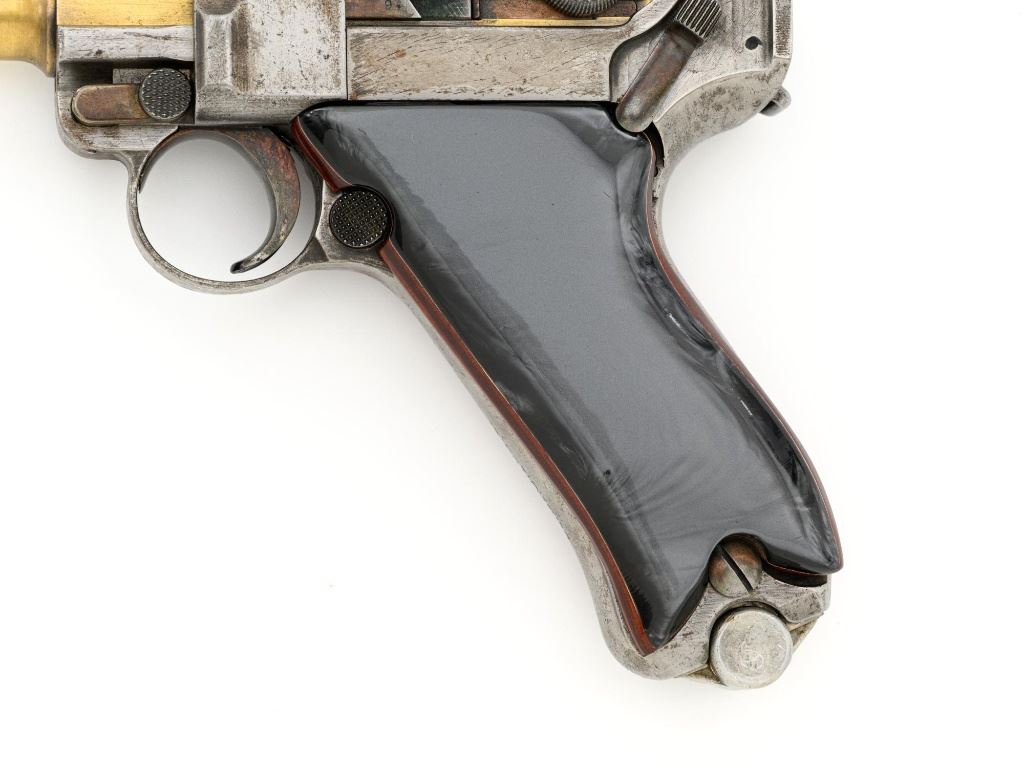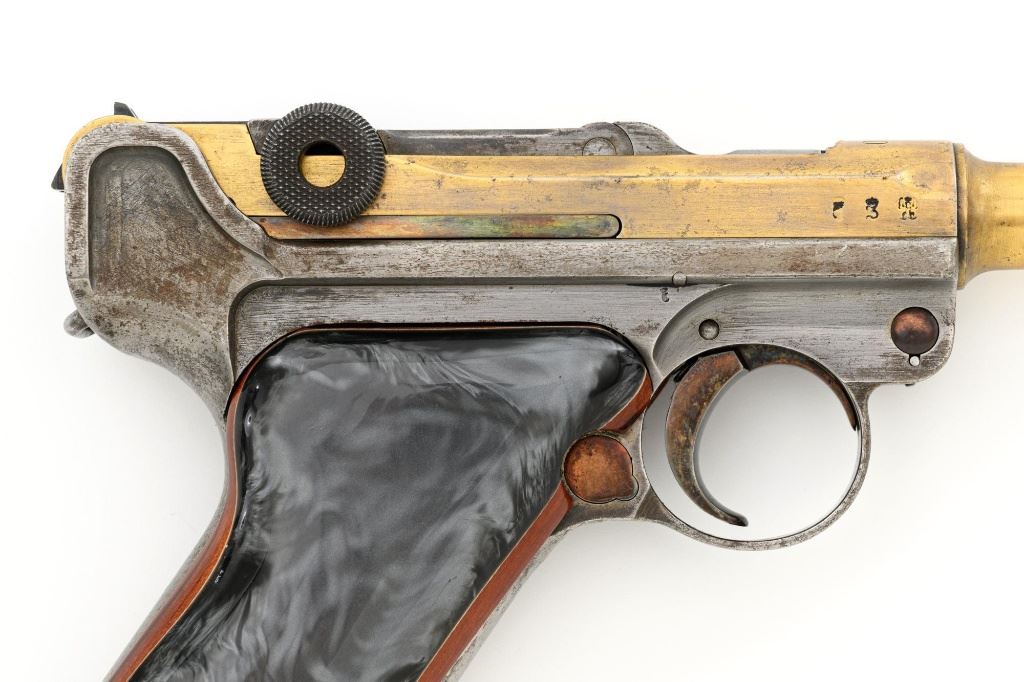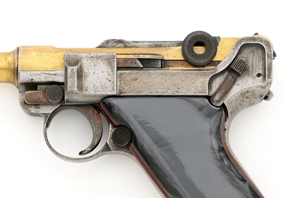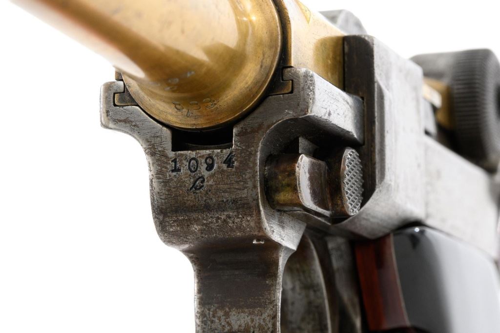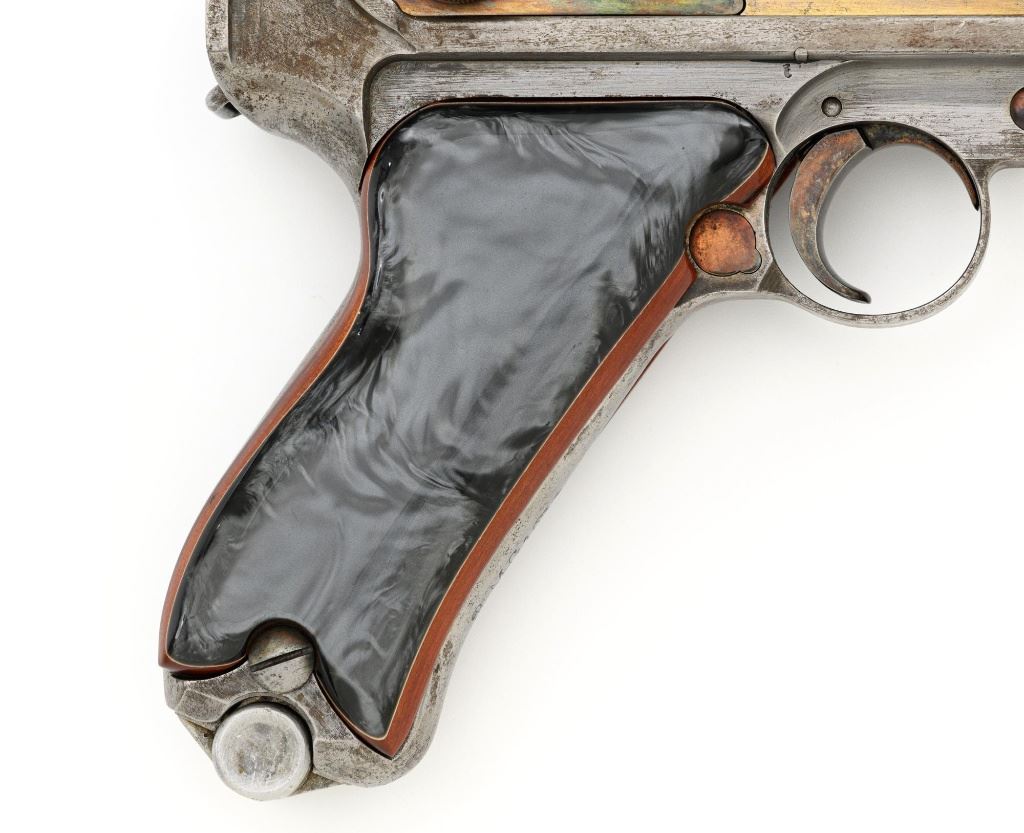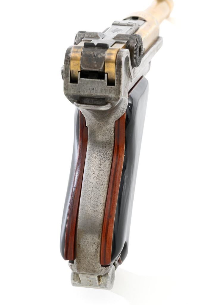 1910 Dated Unit Marked DWM P.08 Luger Semi-Automatic Pistol, #1094c, 9mm cal., 4" barrel, bright frame, gold colored barrel and receiver, replacement wood backed gray marbled composite grips, inverted-"V" front sight, fixed rear sight with small "V"-notched groove, no stock lug or grip safety. Includes one unnumbed aluminum based magazine. Base has had the serial numbered removed, only the "d" suffix is visible, with "+" and "(eagle/24?)" below. Pistol is marked "DWM" on toggle with "1910" date on top of chamber. Right side of receiver with two "(crown)/script letter" military proofs and test fire proof mark. Front grip strap is unit marked "R.M.G. 103.4" (Machine Gun Regiment). Parts with visible numbers are matching, (excluding the magazine). Condition is good, frame and toggle having been cleaned to bare gray metal, with scattered spots of darkening and some light rust patina. Approx. 85% of the applied gold colored finish remains on the barrel and receiver. Small parts have been refinished and now have an iridescent appearance. Factory lettering and proof marks are legible.Grips are excellent. Action and hold open function properly. Bore shows general mild etching and frosting; rifling is about good overall. Est.: $600-$900. (C&R/PPT)