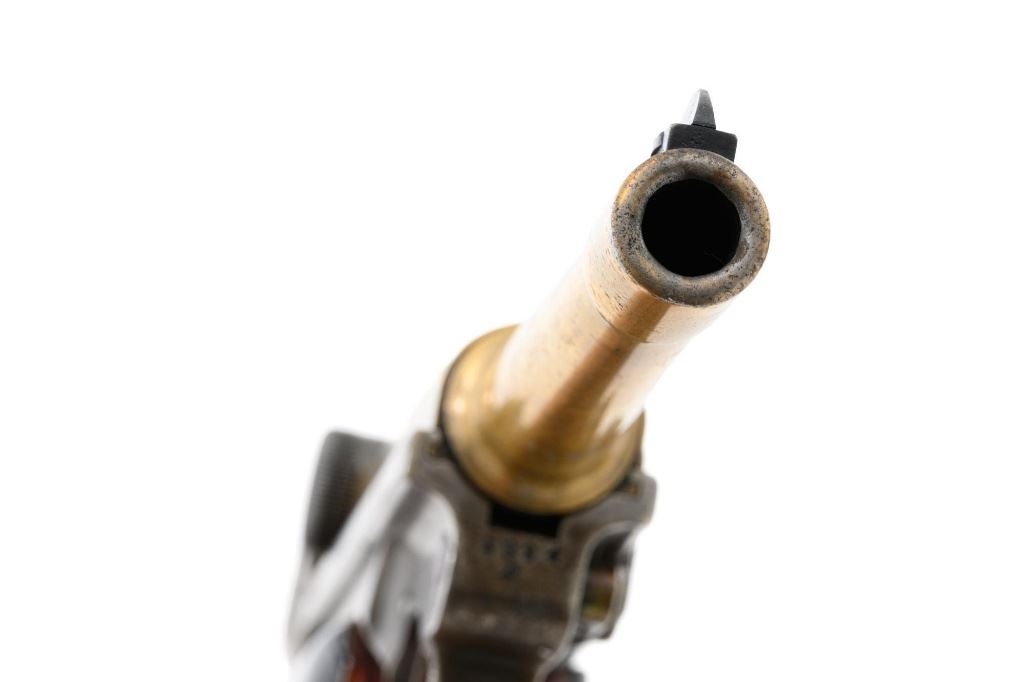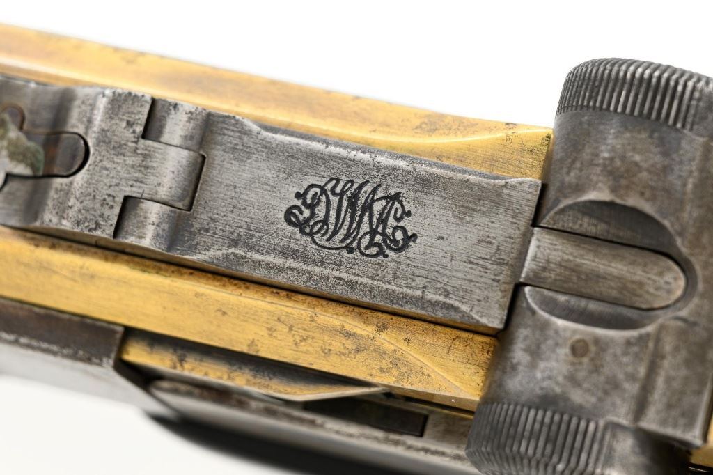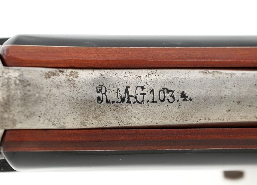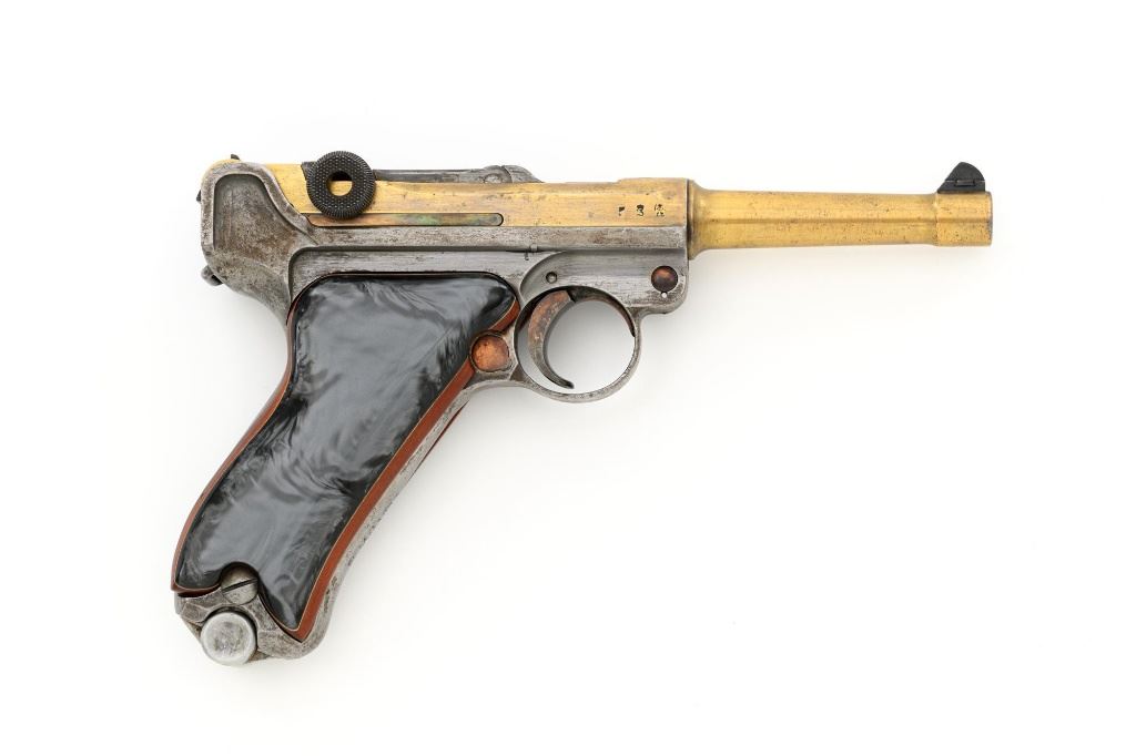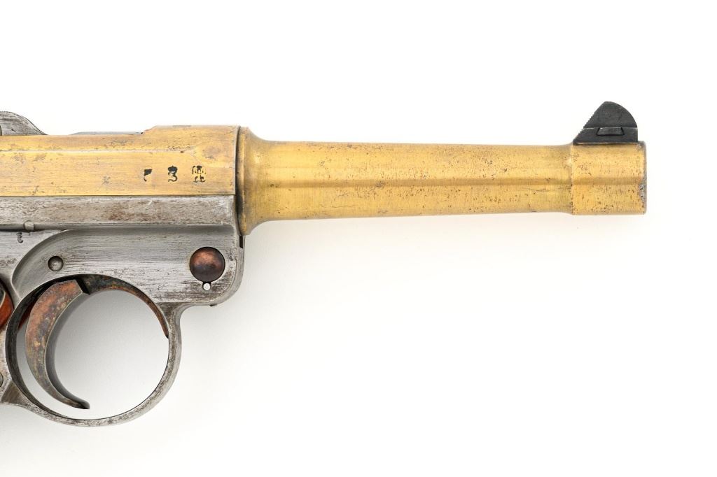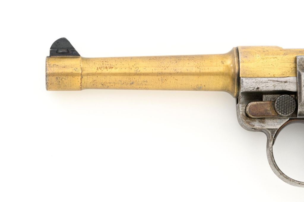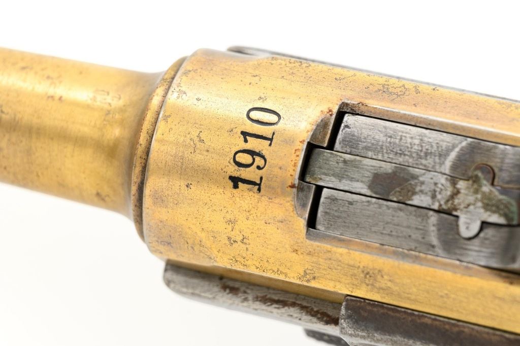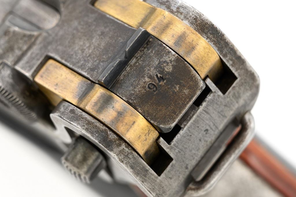 1910 Dated Unit Marked DWM P.08 Luger Semi-Automatic Pistol, #1094c, 9mm cal., 4" barrel, bright frame, gold colored barrel and receiver, replacement wood backed gray marbled composite grips, inverted-"V" front sight, fixed rear sight with small "V"-notched groove, no stock lug or grip safety. Includes one unnumbed aluminum based magazine. Base has had the serial numbered removed, only the "d" suffix is visible, with "+" and "(eagle/24?)" below. Pistol is marked "DWM" on toggle with "1910" date on top of chamber. Right side of receiver with two "(crown)/script letter" military proofs and test fire proof mark. Front grip strap is unit marked "R.M.G. 103.4" (Machine Gun Regiment). Parts with visible numbers are matching, (excluding the magazine). Condition is good, frame and toggle having been cleaned to bare gray metal, with scattered spots of darkening and some light rust patina. Approx. 85% of the applied gold colored finish remains on the barrel and receiver. Small parts have been refinished and now have an iridescent appearance. Factory lettering and proof marks are legible.Grips are excellent. Action and hold open function properly. Bore shows general mild etching and frosting; rifling is about good overall. Est.: $600-$900. (C&R/PPT)