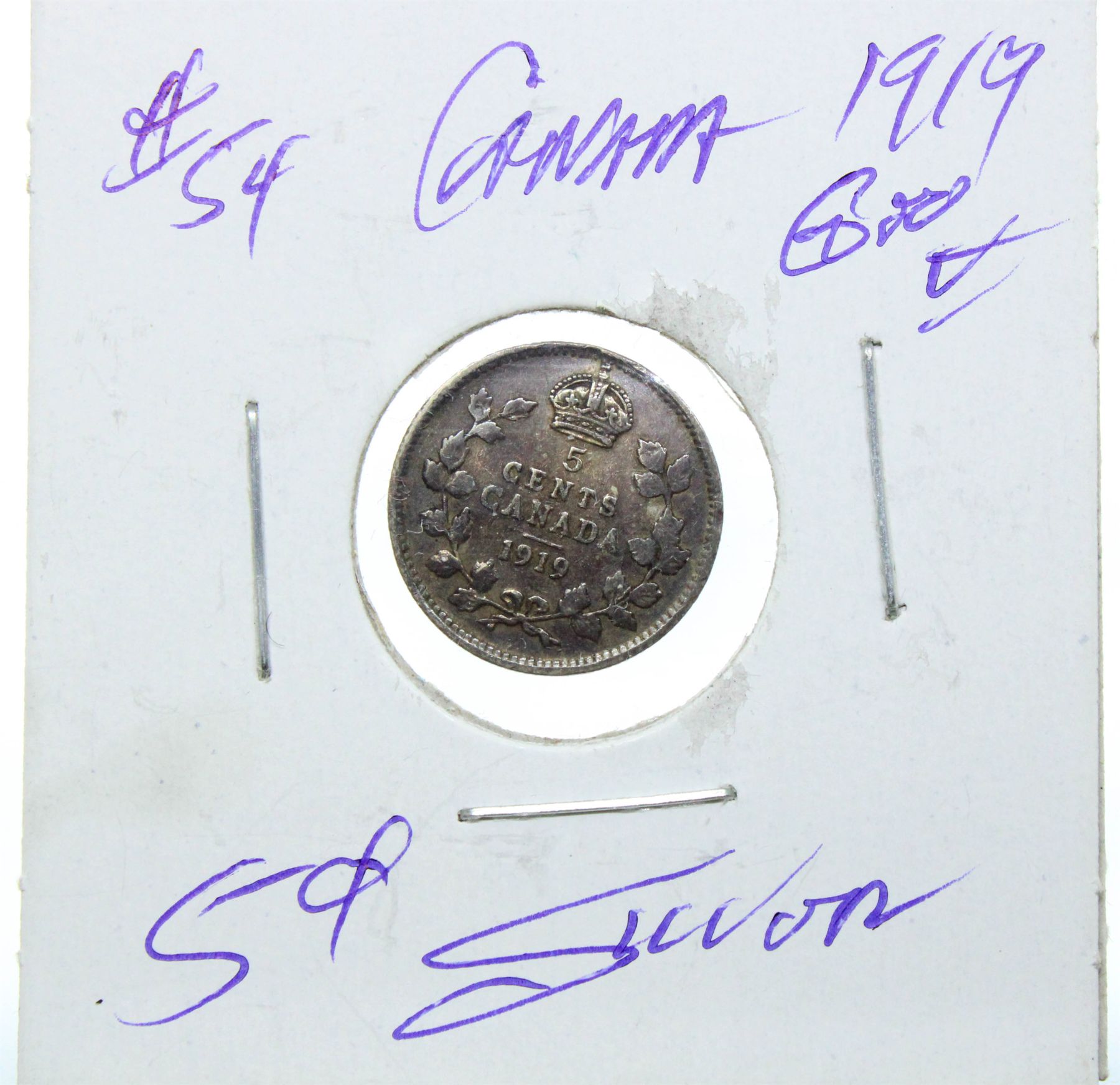 1919 CANADIAN SILVER NICKEL 5 CENT COIN