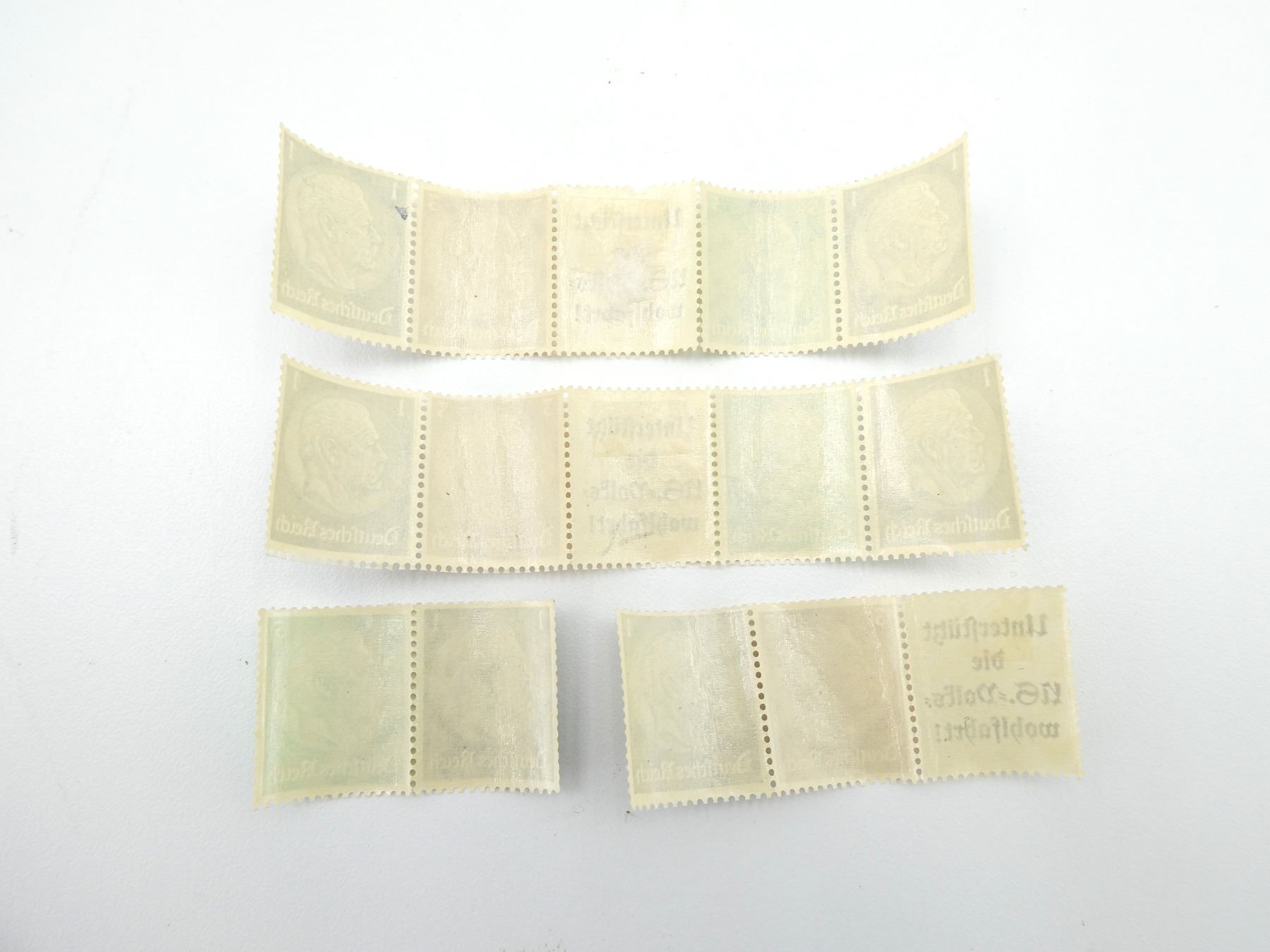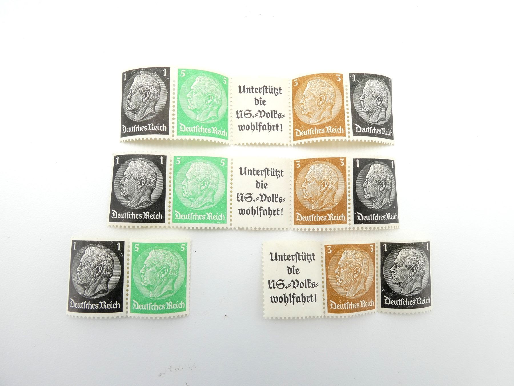 LOT INCLUDES; (3) STRIPS OF STAMPS, ONE STRIP IS SPLIT INTO TWO PIECES, VARIOUS DENOMINATIONS ON STAMPS, STAMP DEPICTS GERMAN PRESIDENT PAUL VON HINDENBURG WITH "DEUTSCHES REICH", MIDDLE OF STRIP MARKED: "UNTERSTUTZT DIE US.-VOLKS-WOHLFAHRT! (SUPPORT THE US.-PEOPLE'S-WELFARE!)". SEE PHOTOS.