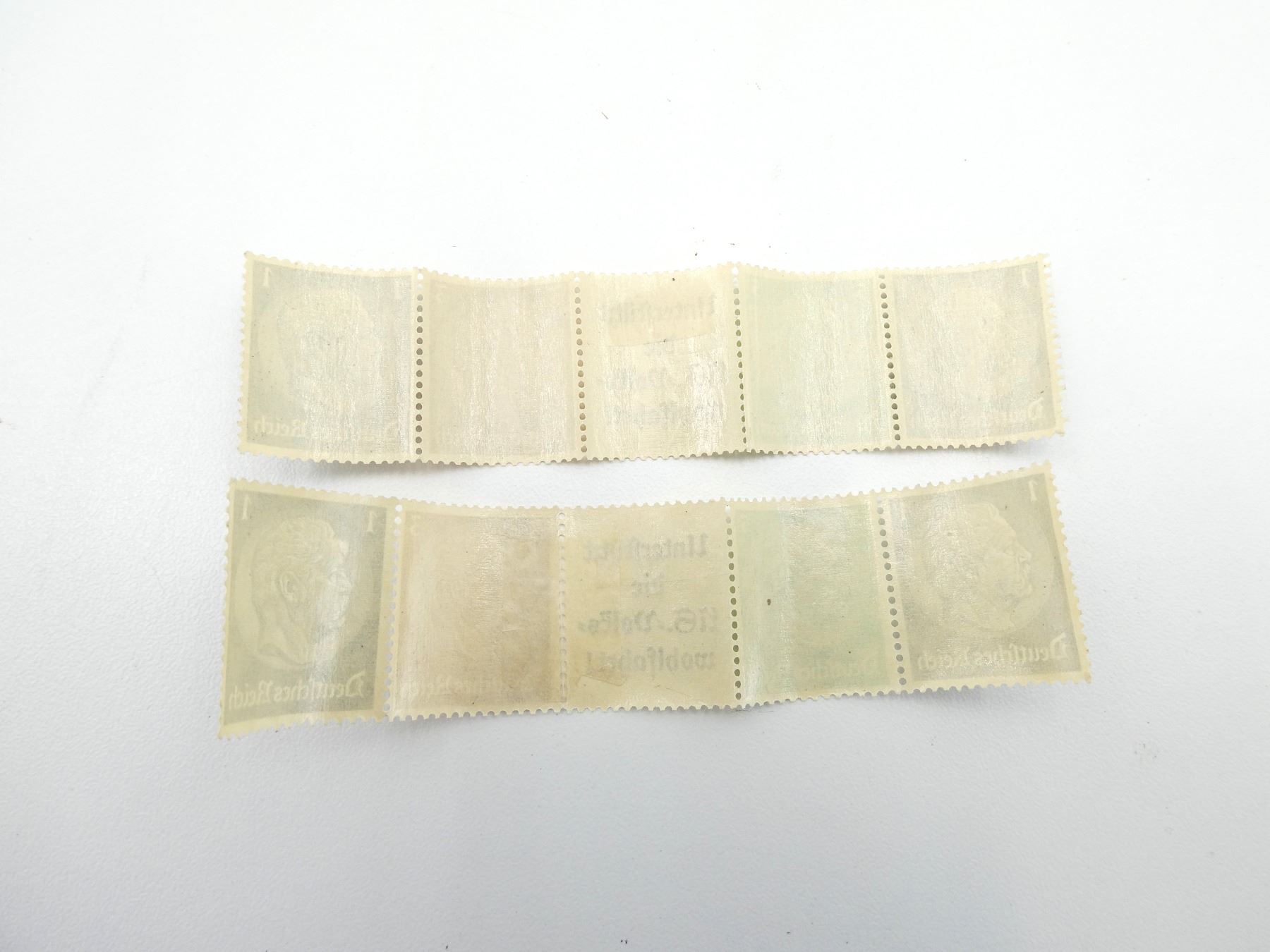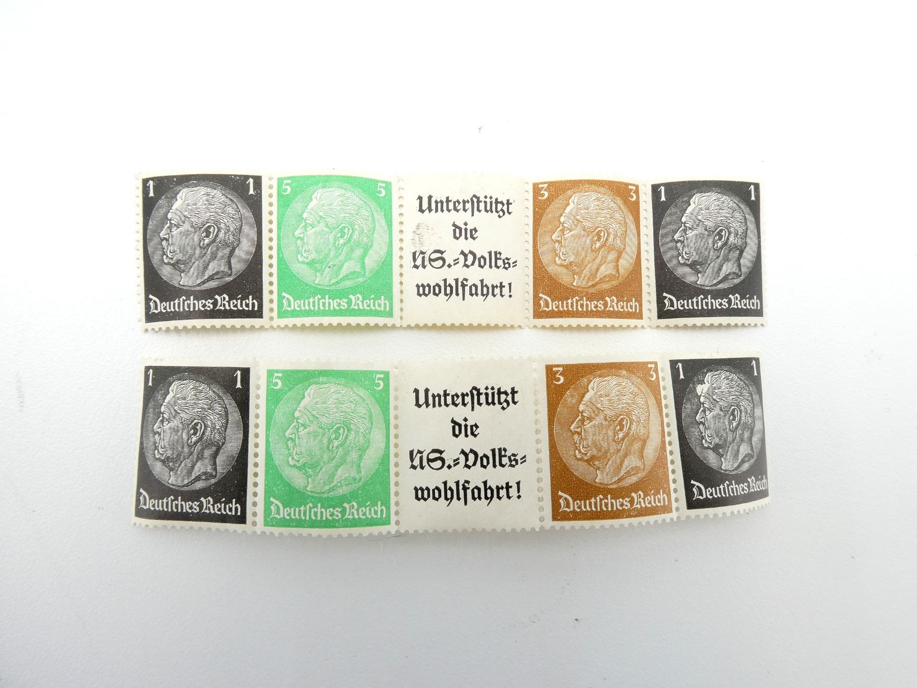 LOT INCLUDES; (2) STRIPS OF STAMPS, VARIOUS DENOMINATIONS ON STAMPS, STAMP DEPICTS GERMAN PRESIDENT PAUL VON HINDENBURG WITH "DEUTSCHES REICH", MIDDLE OF STRIP MARKED: "UNTERSTUTZT DIE US.-VOLKS-WOHLFAHRT! (SUPPORT THE US.-PEOPLE'S-WELFARE!)". SEE PHOTOS.