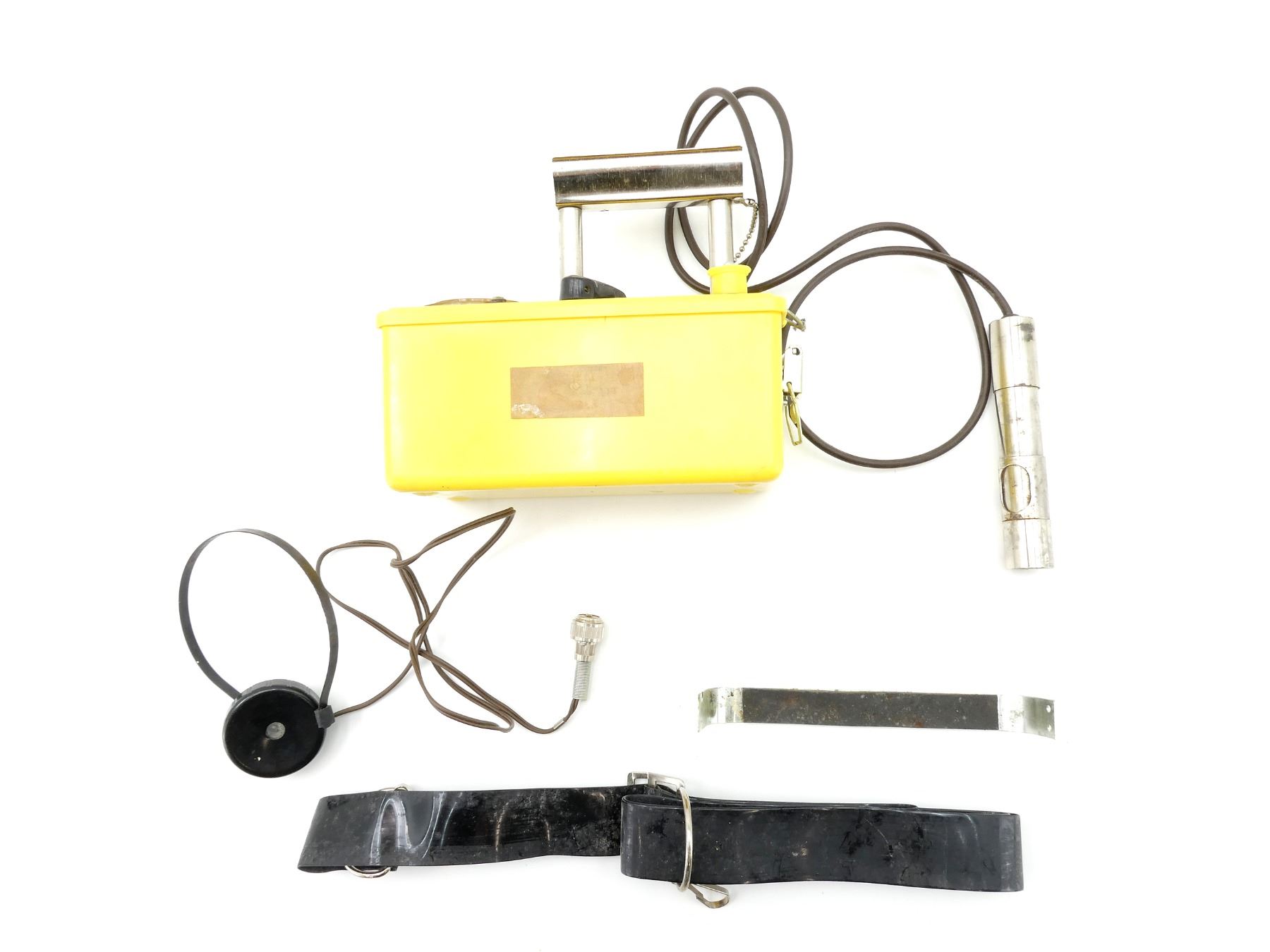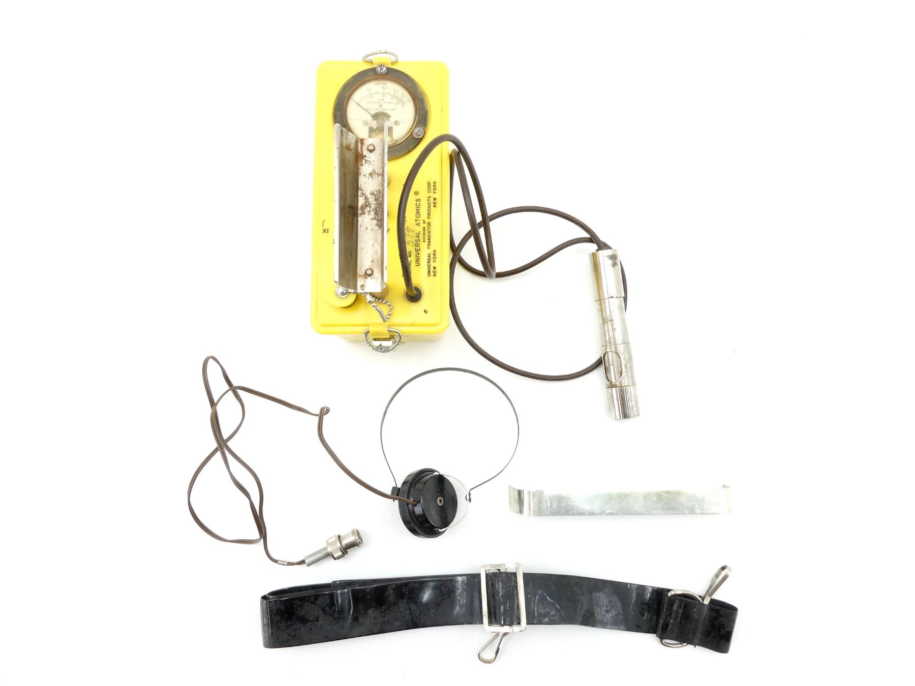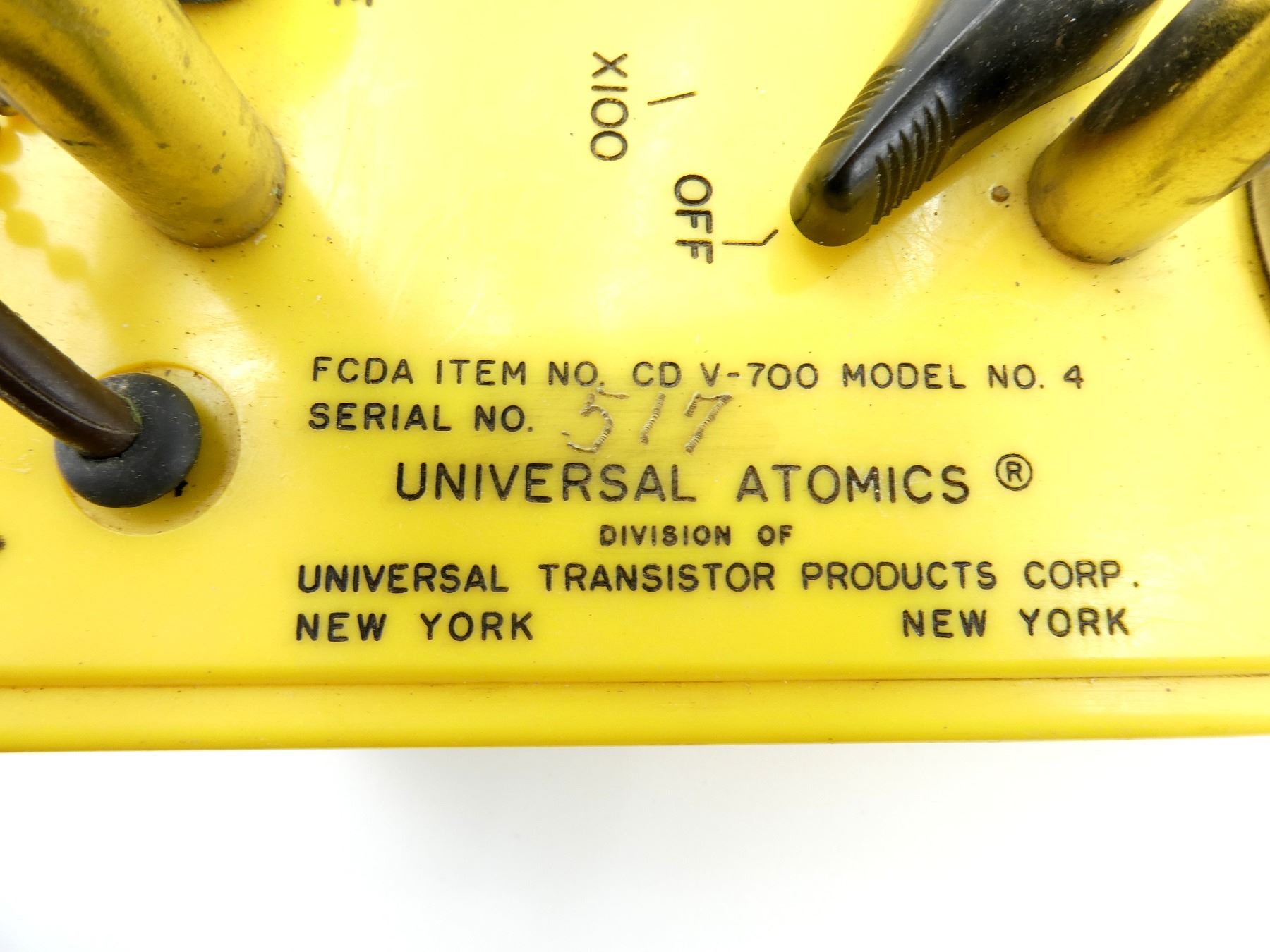 (1) GEIGER COUNTER WITH PROBE, HEADSET & CARRY STRAP, GAUGE ON LID OF CASE, CONTROL SWITCH ON LID, CONNECTOR FOR HEADSET ON LID, METAL CARRY HANDLE WHICH THE PROBE SITS FOR STORAGE, PARTIAL CANADIAN CIVIL DEFENSE STICKER ON THE SIDE, LID MARKED: "FCDA ITEM NO. CD V-700 MODEL NO. 4, SERIAL NO. 517, UNIVERSAL ATOMICS" ETC., CALIBRATED FEB / 81, APPROX. 8.5" X 4" X 7". SEE PHOTOS.
