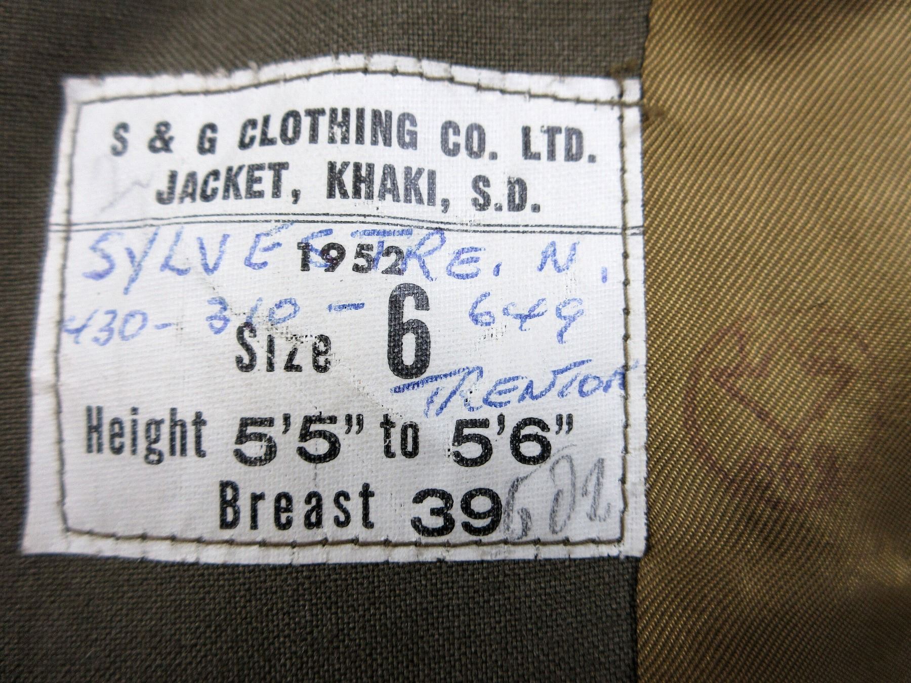 LOT INCLUDES; (1) KHAKI TUNIC, MARKED: "S & G CLOTHING CO. LTD., JACKETM KHAKI, S.D., 1952, SIZE 6, HEIGHT 5'5" TO 5'6", BREAST 39" WITH MAPLE LEAF PROOF MARK & VARIOUS OTHER MARKINGS, CANADA WITH EAGLE SHOULDER BADGES, CORPORAL RANK CHEVRONS, RIBBON BAR (DEFENCE MEDAL, CANADIAN VOLUNTARY SERVICE MEDAL, 1939-1945 WAR MEDAL, CANADIAN FORCES' DECORATION MEDAL), BRASS QUEEN'S CROWN RCAF BUTTONS, BUTTON FRONT, WITH WAIST BELT & (1) PAIR OF KHAKI PANTS, MARKED: "TIP TOP TAILORS LIMITED, TROUSERS NO. 6, NOV. 1962, SIZE NO. 6734", WITH MAPLE LEAF PROOF MARK, ZIPPER-FLY (WORKS), WAIST APPROX. 34". SEE PHOTOS.