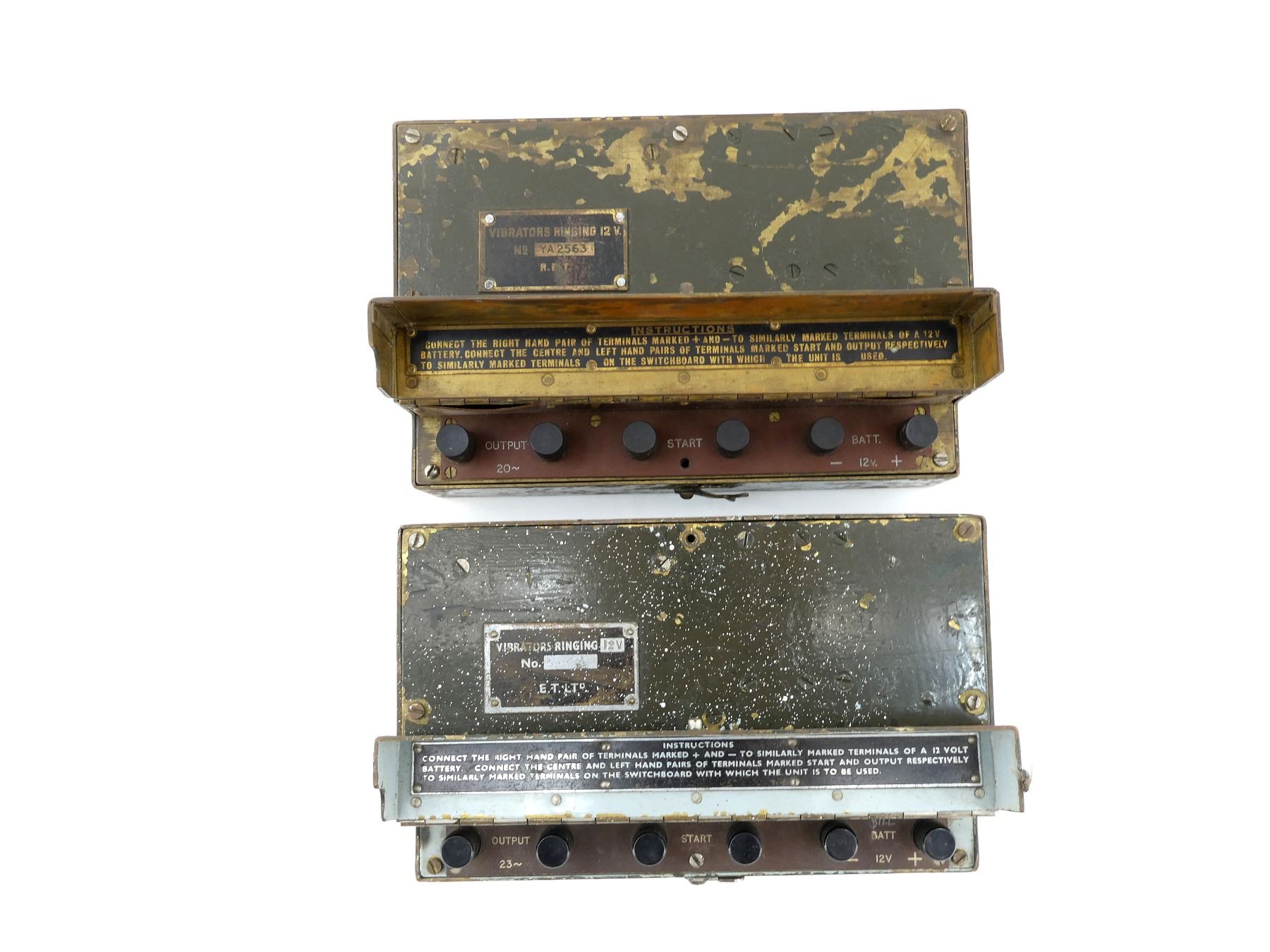 LOT INCLUDES: (1) GREEN BRASS METAL POWER SUPPLY, MARKED: "VIBRATORS RINGING 12V, NO. YA2563 R.E.T", 6 CONTROL KNOBS MARKED: "OUTPUT 20, START, BATT. 12V.", INSTRUCTIONS LABEL, APPROX. 8.75" X 5.5" X 3.25", (1) GREEN METAL POWER SUPPLY, MARKED: "VIBRATORS RINGING, E.T.LT", 6 KNOBS MARKED: "OUTPUT 23, START, BATT. 12V.", INSTRUCTIONS LABEL, APPROX. 8.75" X 5.5" X 3.25". SEE PHOTOS.