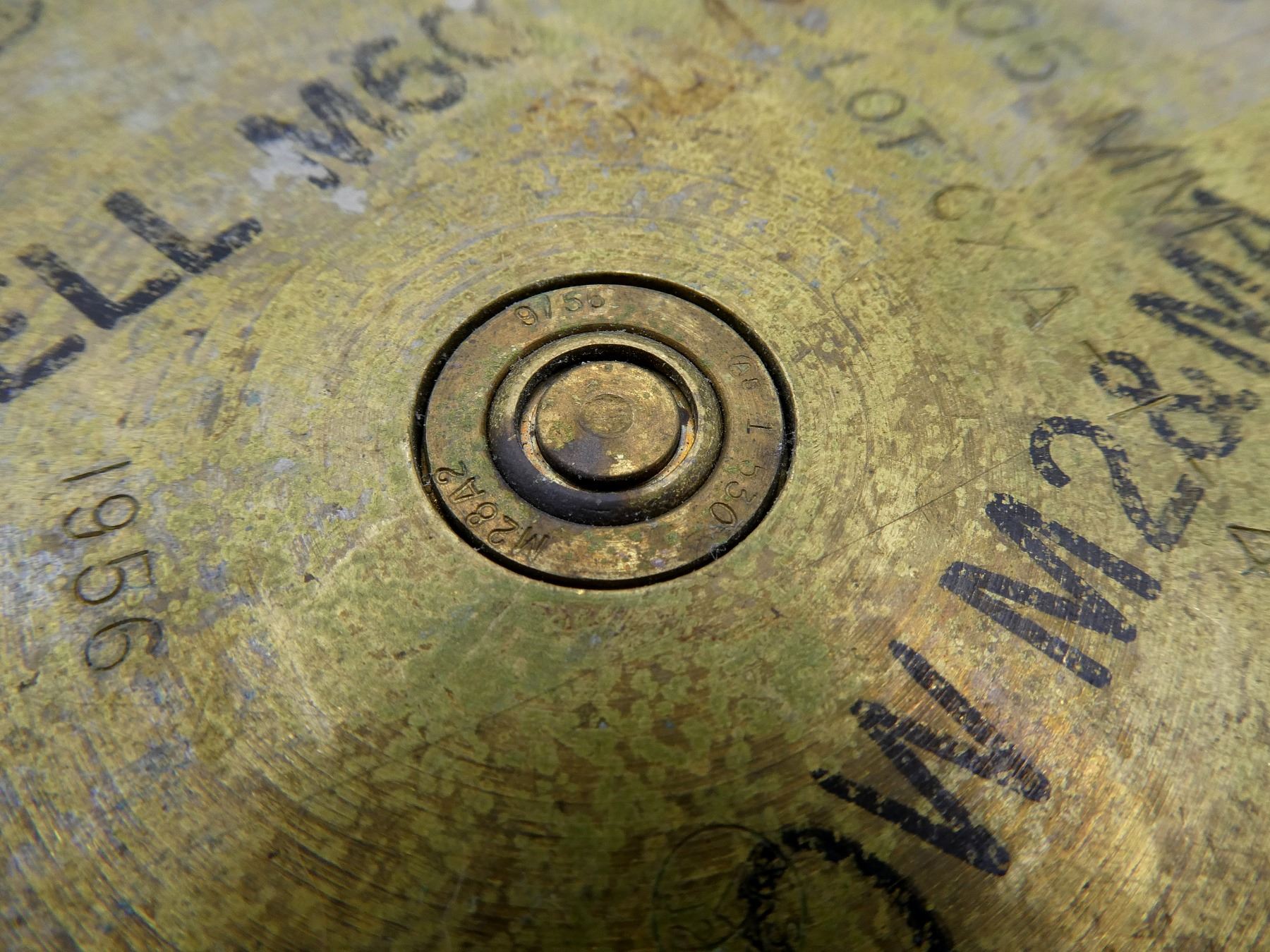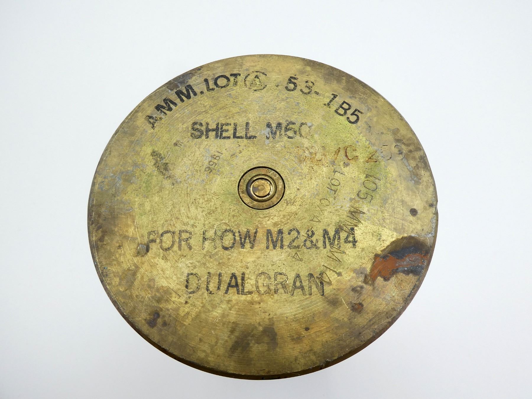 (1) CANADIAN BRASS SHELL CASING, PRIMER INTACT, MARKED: "AMM. LOT-53-1B5, SHELL M60, FOR HOW M2&M4 DUAL GRAN, 1956", VARIOUS FAINT / UN-CLEAR MARKINGS, APPROX. DIA. 4.25", APPROX. OAL 14.5". SEE PHOTOS.