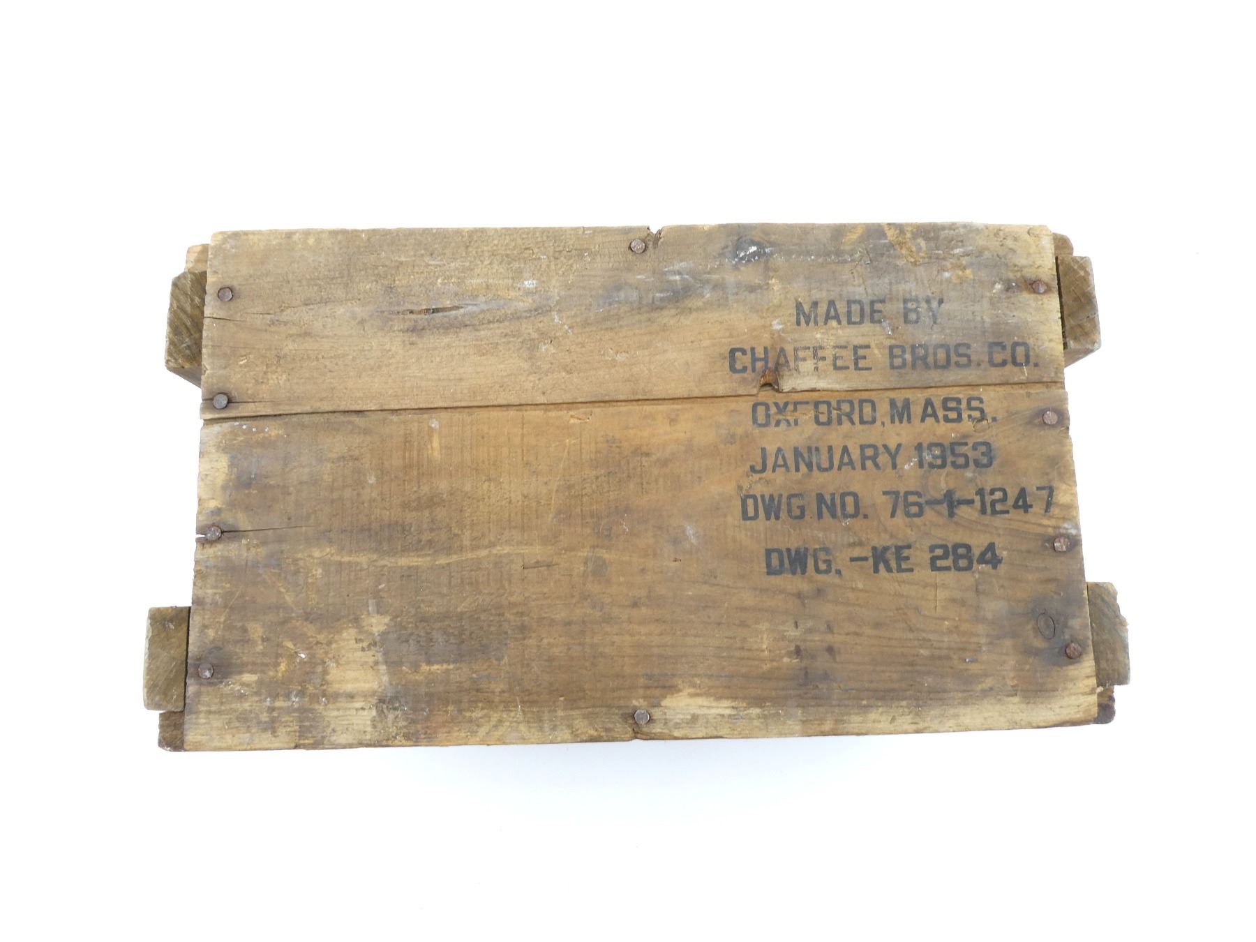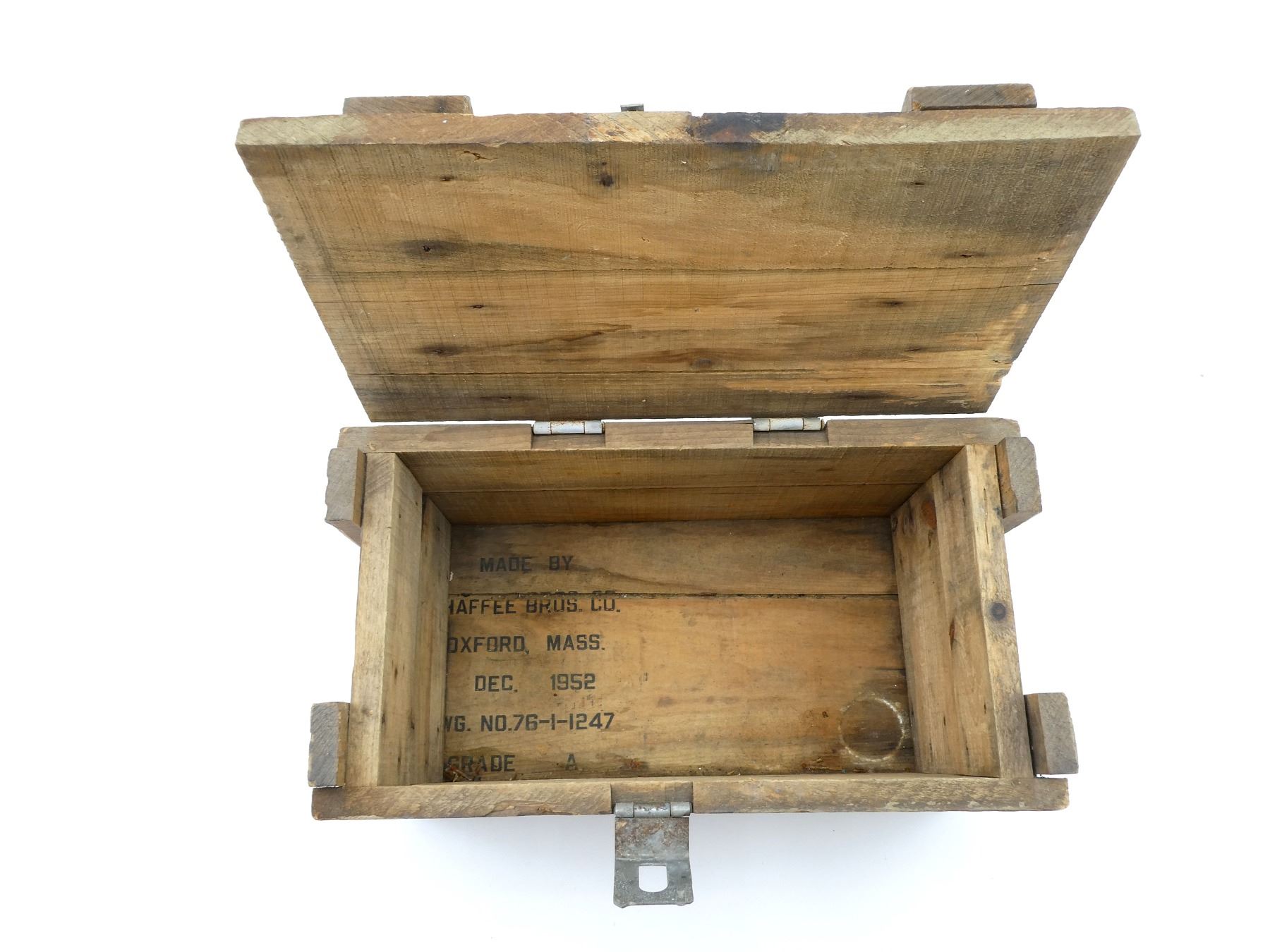 (1) WOODEN AMMO CRATE, INSIDE BOTTOM MARKED: "MADE BY, HAFFEE BROS. CO., OXFORD MASS., DEC. 1952" ETC., VARIOUS OTHER MARKINGS, METAL HINGES / LATCH, ROPE CARRY HANDLE, APPROX. 17.75" X 9.75" X 10.5". SEE PHOTOS.