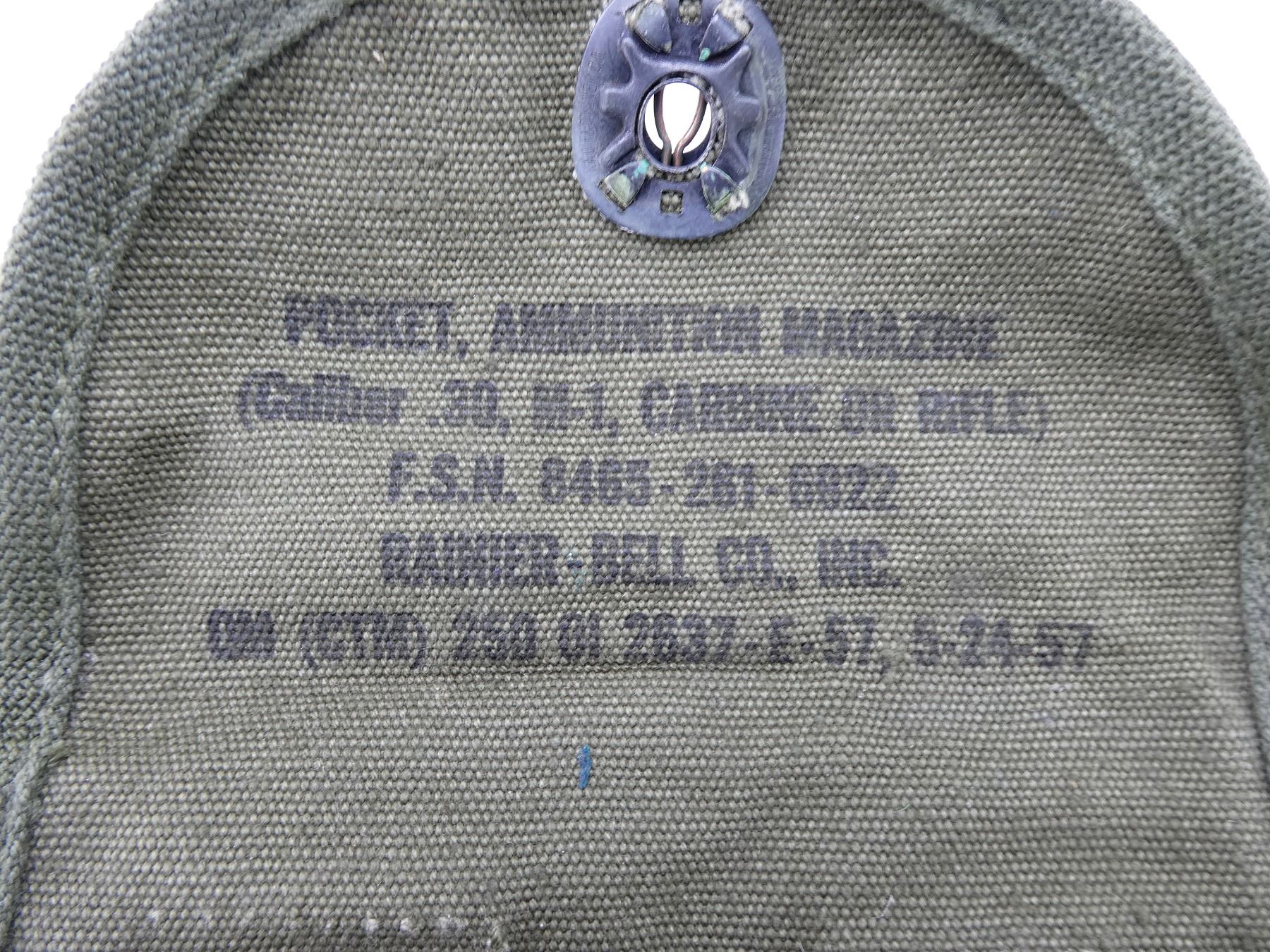 (1) GREEN CANVAS DOUBLE-POCKET .30 CAL. M1 CARBINE MAG POUCH, MARKED: "US", "POCKET, AMMUNITION MAGAZINE, (CALIBER .30, M-1, CARBINE OR RIFLE), F.S.N. 8465-261-6822, RAINER-BELL CO., INC., QM (CTM) 250 01 2637-E-57, 5-24-57". SEE PHOTOS.