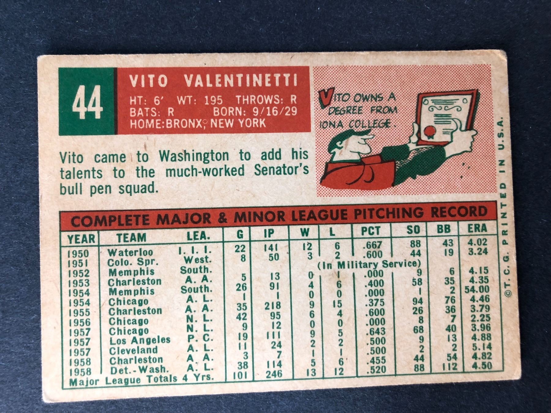 1959 Topps - Vito Valentinetti - Senators 44
