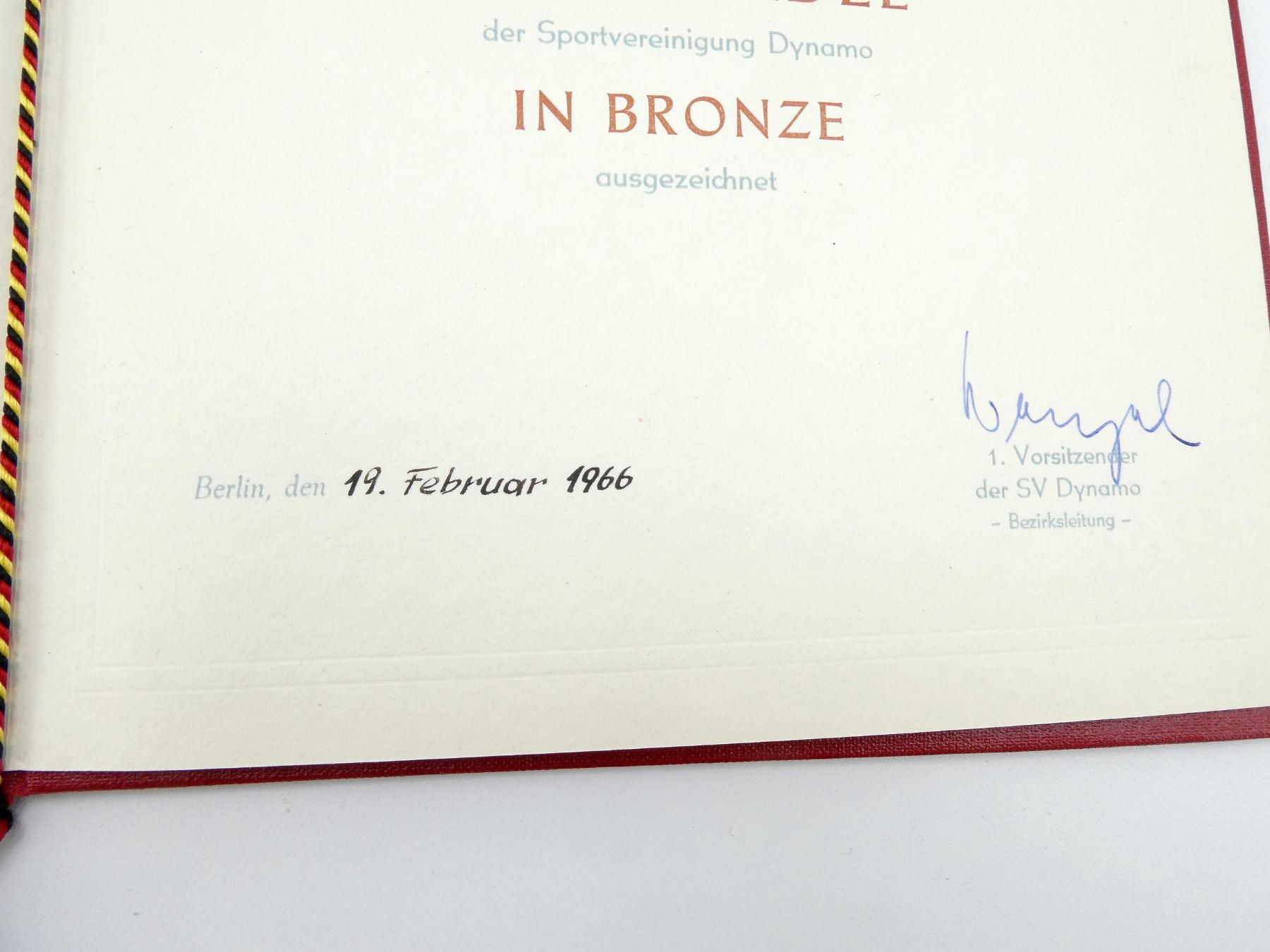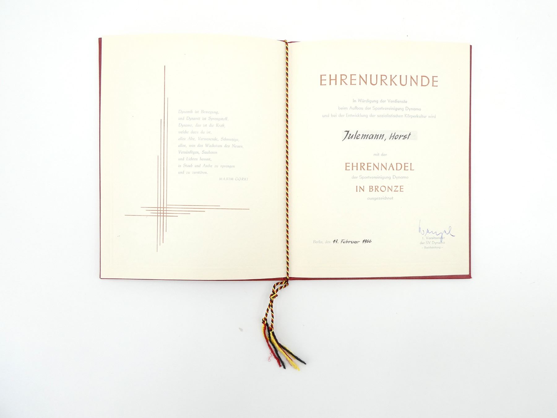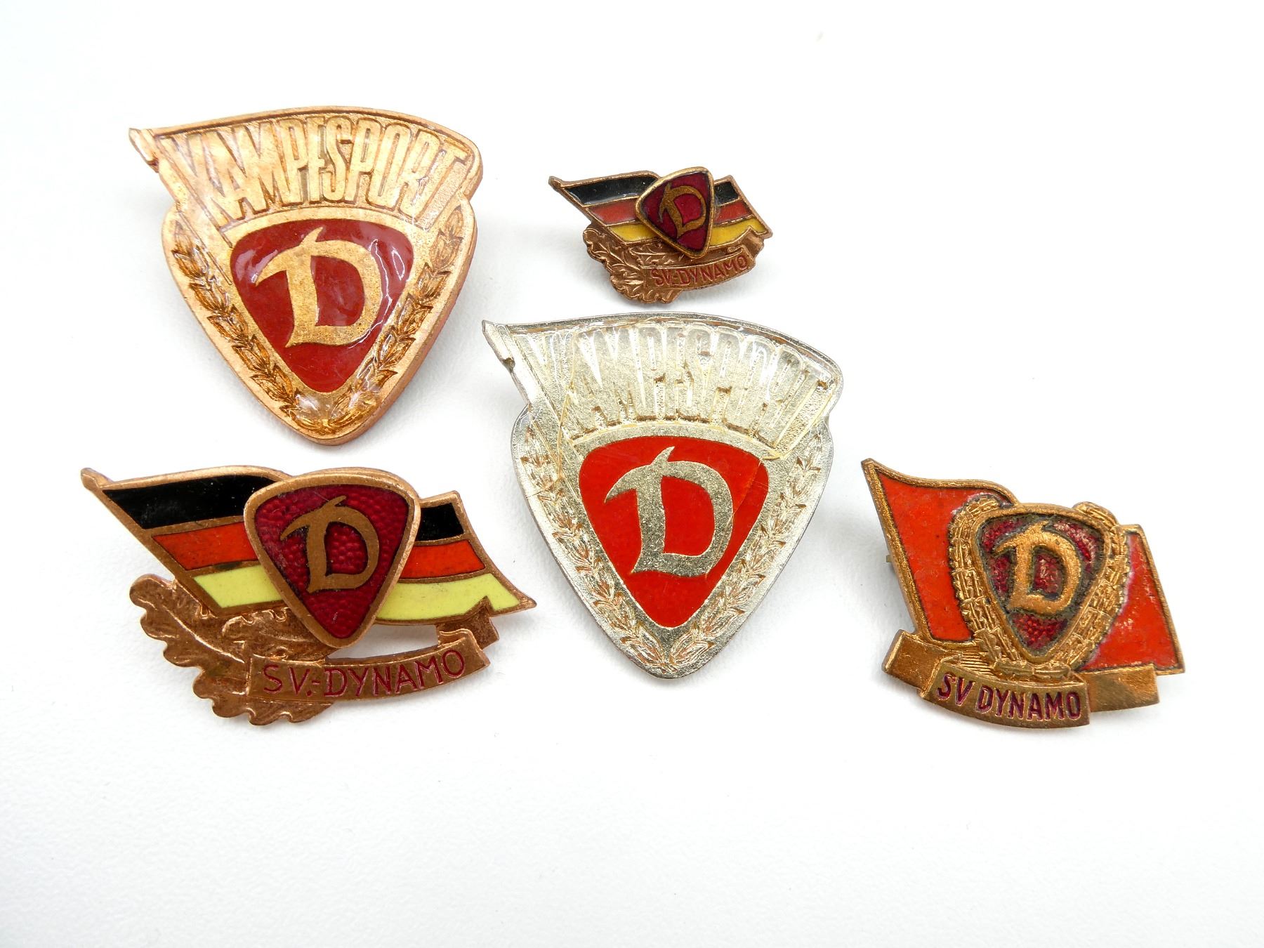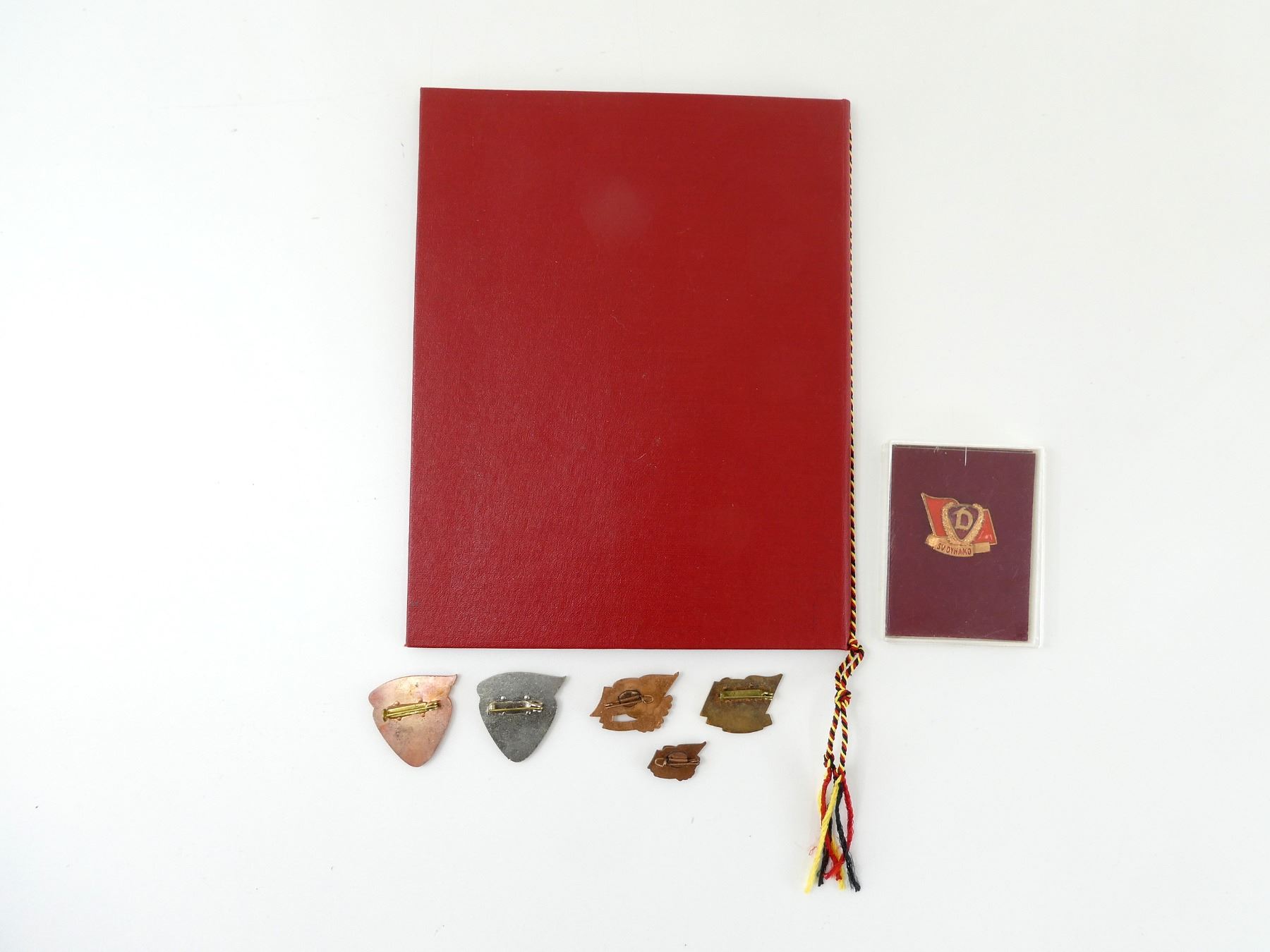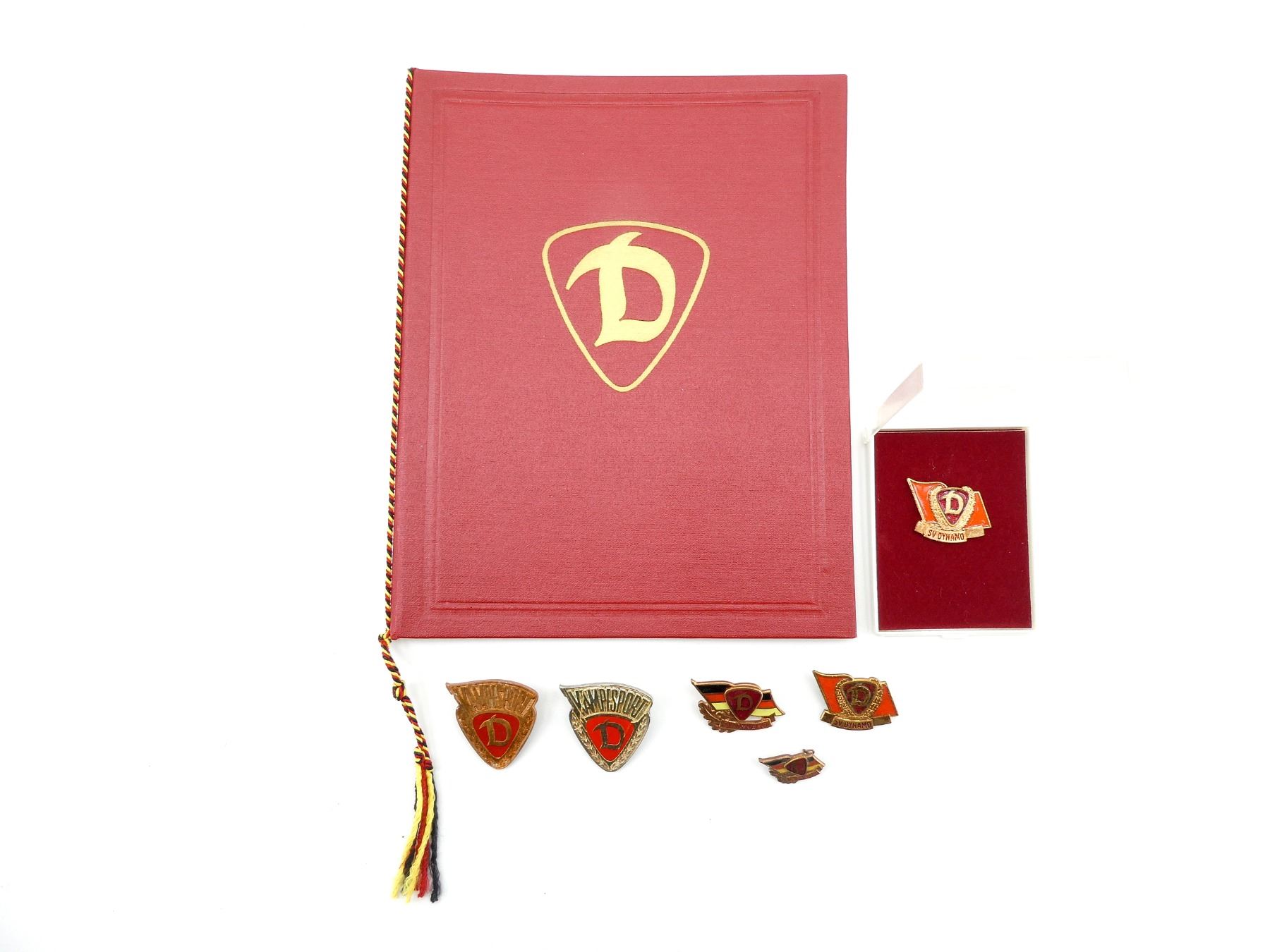 LOT INCLUDES; (1) DYNAMO SPORTS ASSOCIATION PIN IN BRONZE WITH NAMED CERTIFICATE OF HONOR, CERTIFICATE NAME TO: "JULEMANN, HORST", RED LEATHER BOUND AND (5) DYNAMO SPORTS ASSOCIATION PINS, VARIOUS SIZES, BRONZE / SILVER COLOURED, SOME WITH GERMAN FLAG BEHIND THE "D" SYMBOL, ENAMELED FRONTS, PIN BACKINGS INTACT, NO VISIBLE MAKER'S MARKS. SEE PHOTOS.