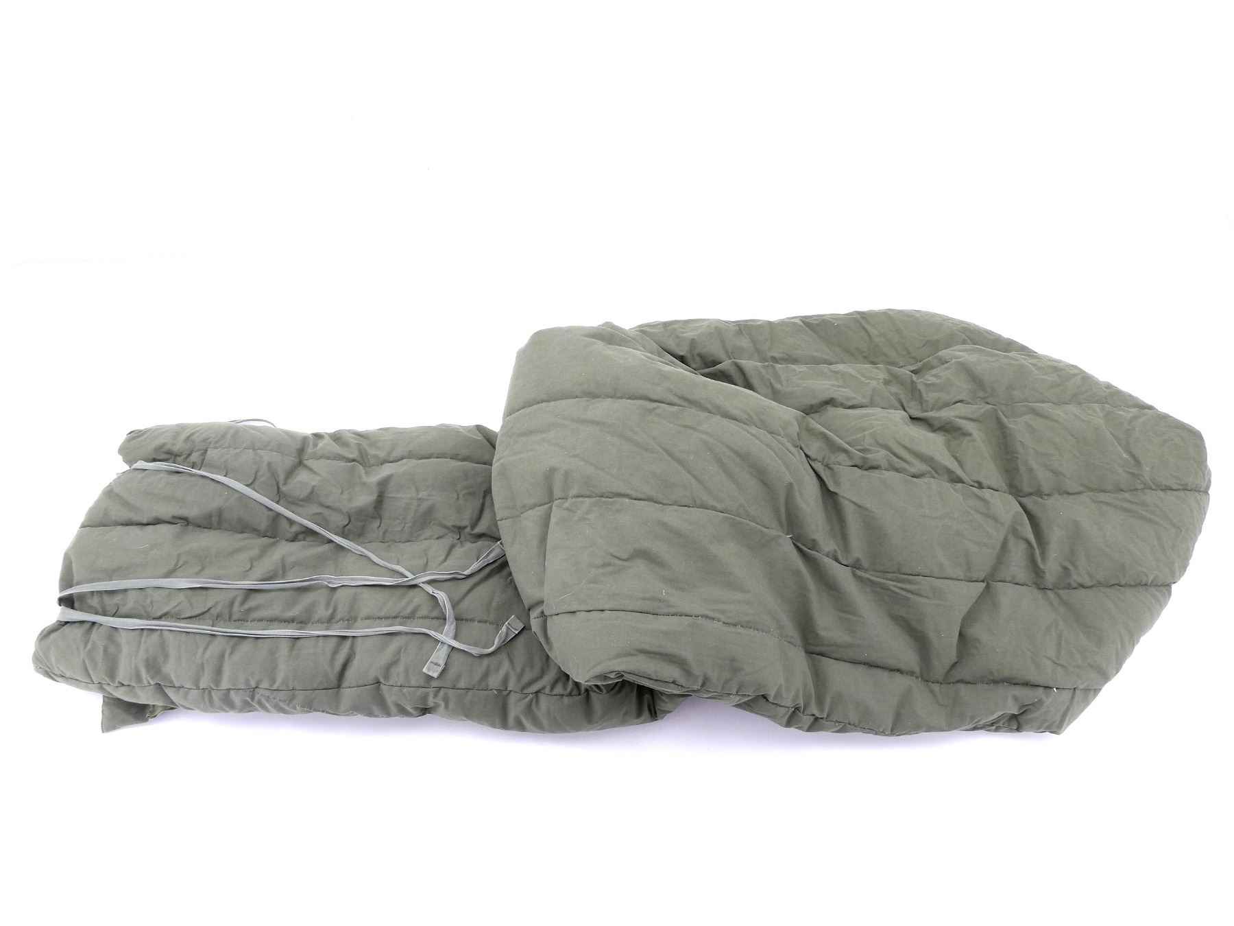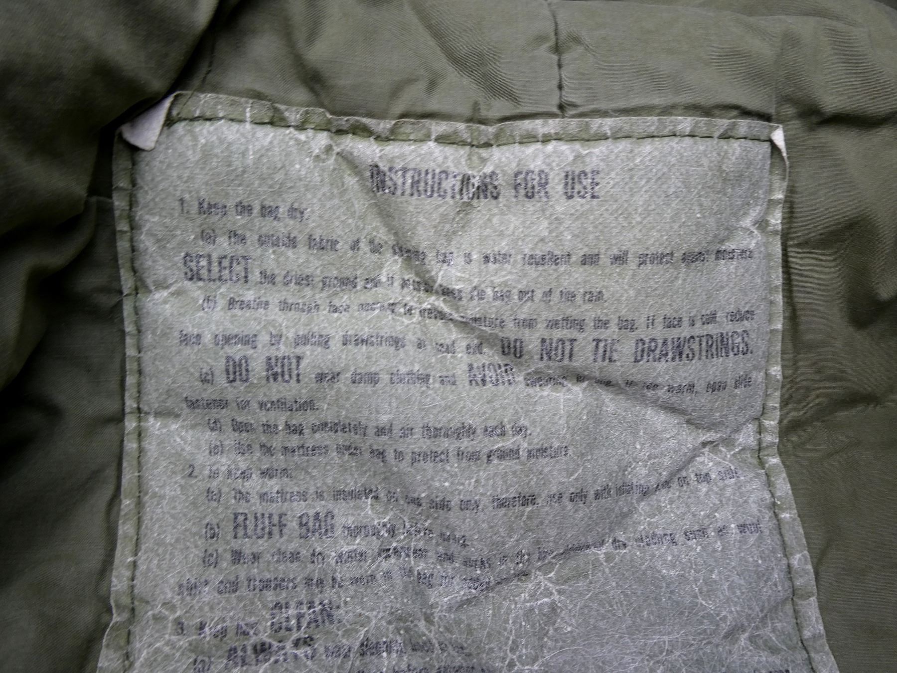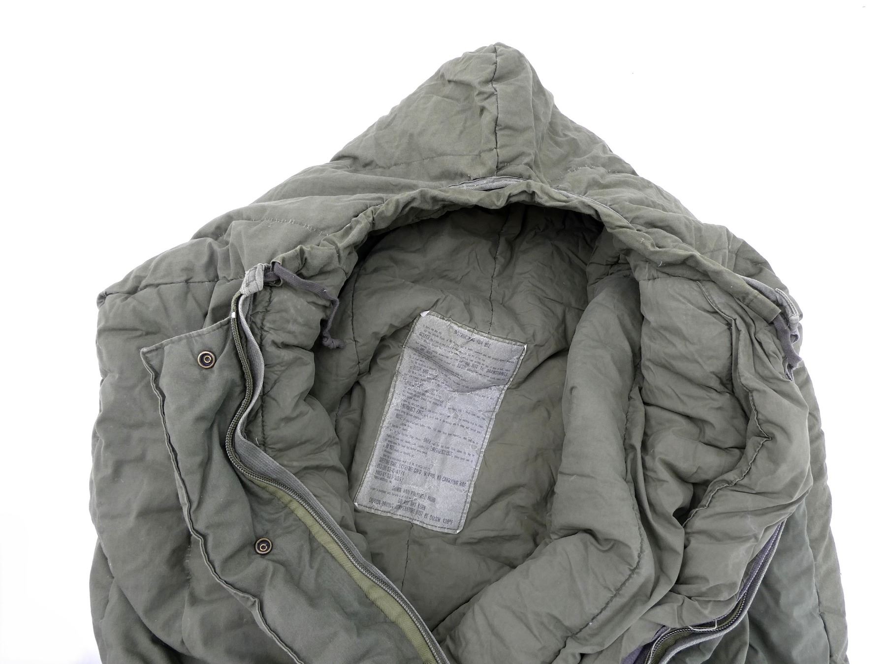 (1) GREEN CANVAS / CLOTH SLEEPING BAG, WATER REPELLANT EXTERIOR, DOWN / POLYESTER FILLED, ZIPPERED (WORKS), MARKED: "SLEEPING BAG, EXTREME COLD, W/HOOD, W/O CARRYING BAG, DLA100-83-C-4174, 8465-01-033-8057" ETC. WITH INSTRUCTIONS FOR USE / MAINTENANCE, SHOWS AGE / WEAR, APPROX. 86" X 30". SEE PHOTOS.