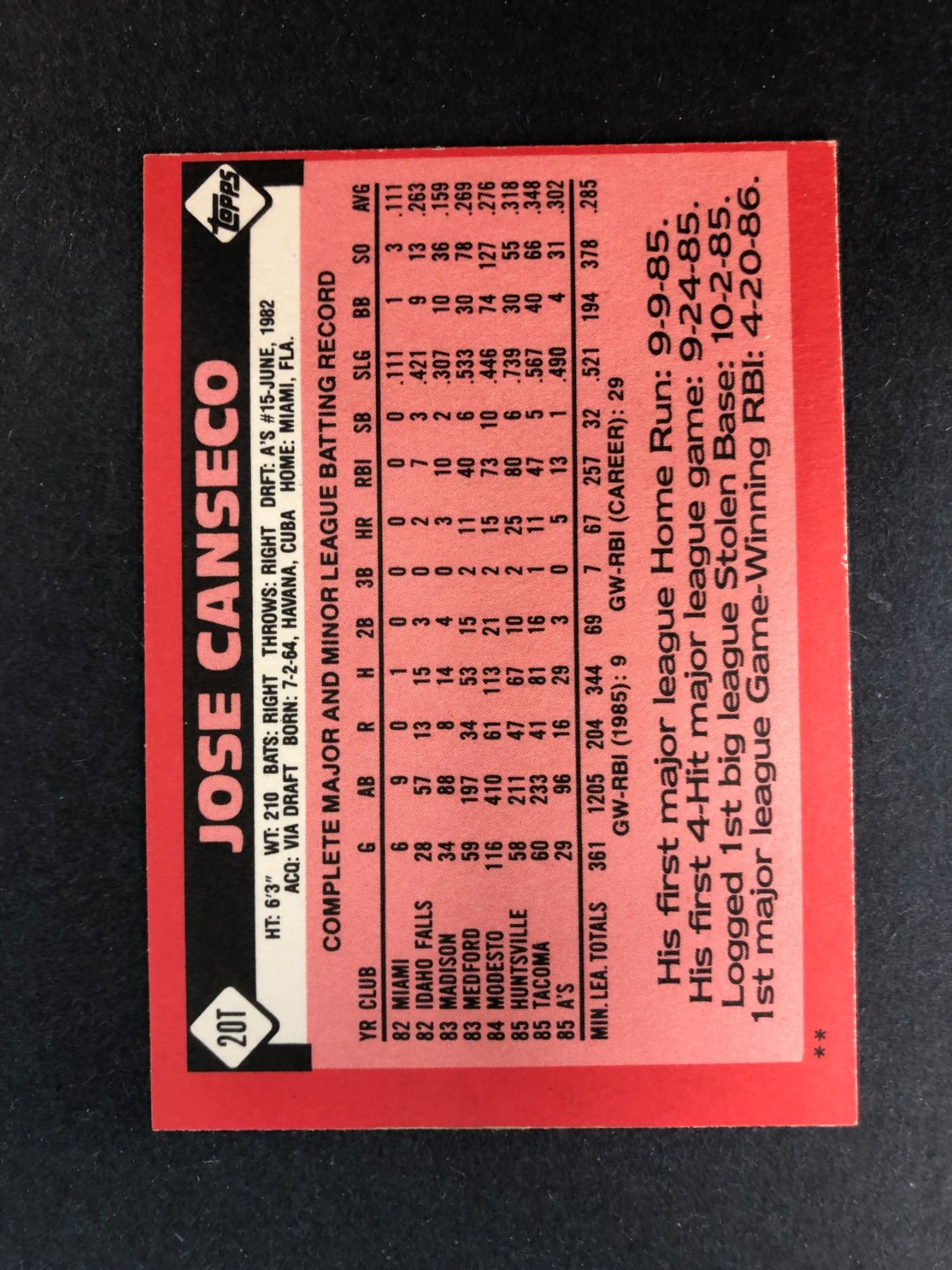 1986 Topps traded Jose Canseco - 20T