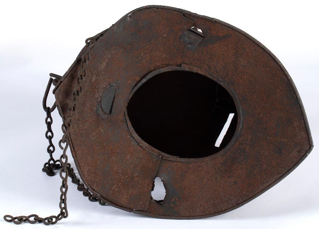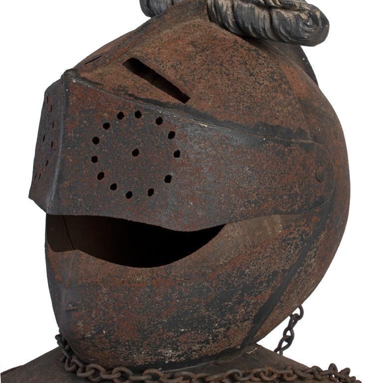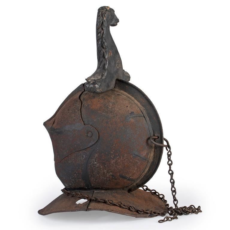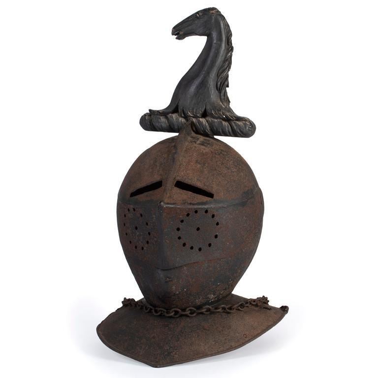 A Victorian close helmet most probably from a knight’s funerary achievement.The low comb skull with an attached visor pierced with breaths. Wide gorget plates. The helm surmounted by a finely carved figure head of a knight’s destrier in dark wood, the head beautifully executed by a master carver. The helmet patinated overall. The knight’s horse head in fine original condition.