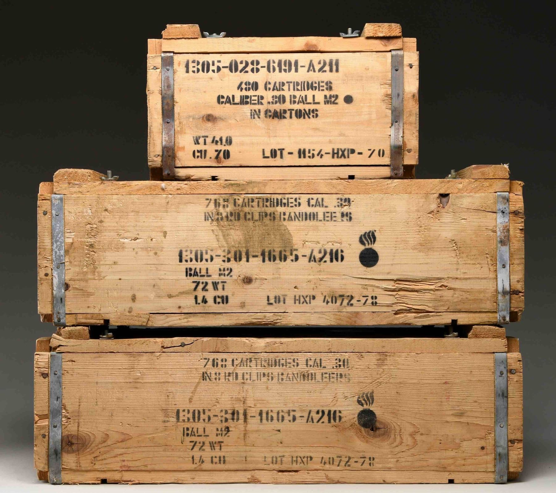 AMMUNITION. Ammunition produced in Greece & packed in three wooden crates. Crate markings include "HXP" indicating Greek manufacture. Crate labeling indicates ammunition purchased through CMP. Two crates each contain 768 rds. loaded on stripper clips w/ bandoliers. One crate contains 480 rds. in cartons. All ammunition is in sealed green "spam cans". Brass cased. Boxer primed. 150 grain full metal jacket bullets. Bullets are 150 grain full metal jacket. CONDITION: boxes are in good condition w/ legible markings & have the usual handling wear, chipping & staining. (02-24270-14/RW). AMMO. $900-1,200.