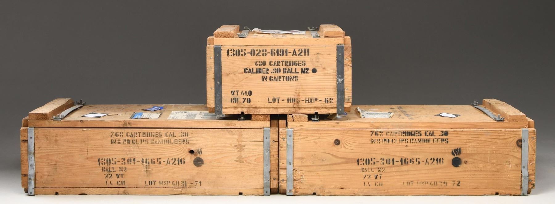 AMMUNITION. Ammunition produced in Greece & packed in three wooden crates. Crate markings include "HXP" indicating Greek manufacture. Crate labeling indicates ammunition purchased through CMP. Two crates each contain 768 rds. loaded on stripper clips w/ bandoliers. One crate contains 480 rds. in cartons. All ammunition is in sealed green "spam cans". Brass cased. Boxer primed. 150 grain full metal jacket bullets. Bullets are 150 grain full metal jacket. CONDITION: boxes are in good condition w/ legible markings & have the usual handling wear, chipping & staining. (02-24270-15/RW). AMMO. $900-1,200.