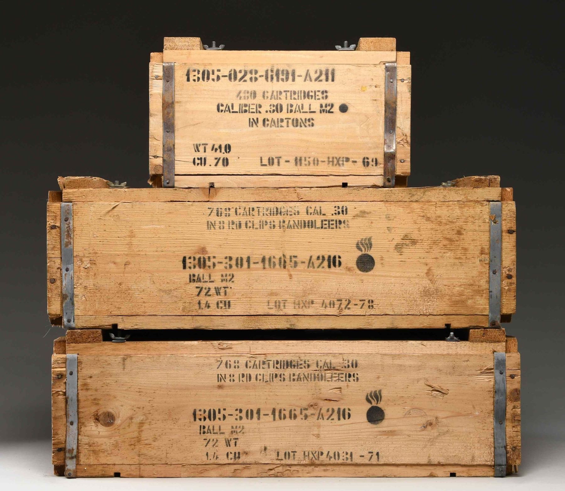 AMMUNITION. Ammunition produced in Greece & packed in three wooden crates. Crate markings include "HXP" indicating Greek manufacture. Crate labeling indicates ammunition purchased through CMP. Two crates each contain 768 rds. loaded on stripper clips w/ bandoliers. One crate contains 480 rds. in cartons. All ammunition is in sealed green "spam cans". Brass cased. Boxer primed. 150 grain full metal jacket bullets. Bullets are 150 grain full metal jacket. CONDITION: boxes are in good condition w/ legible markings & have the usual handling wear, chipping & staining. (02-24270-17/RW). AMMO. $900-1,200.