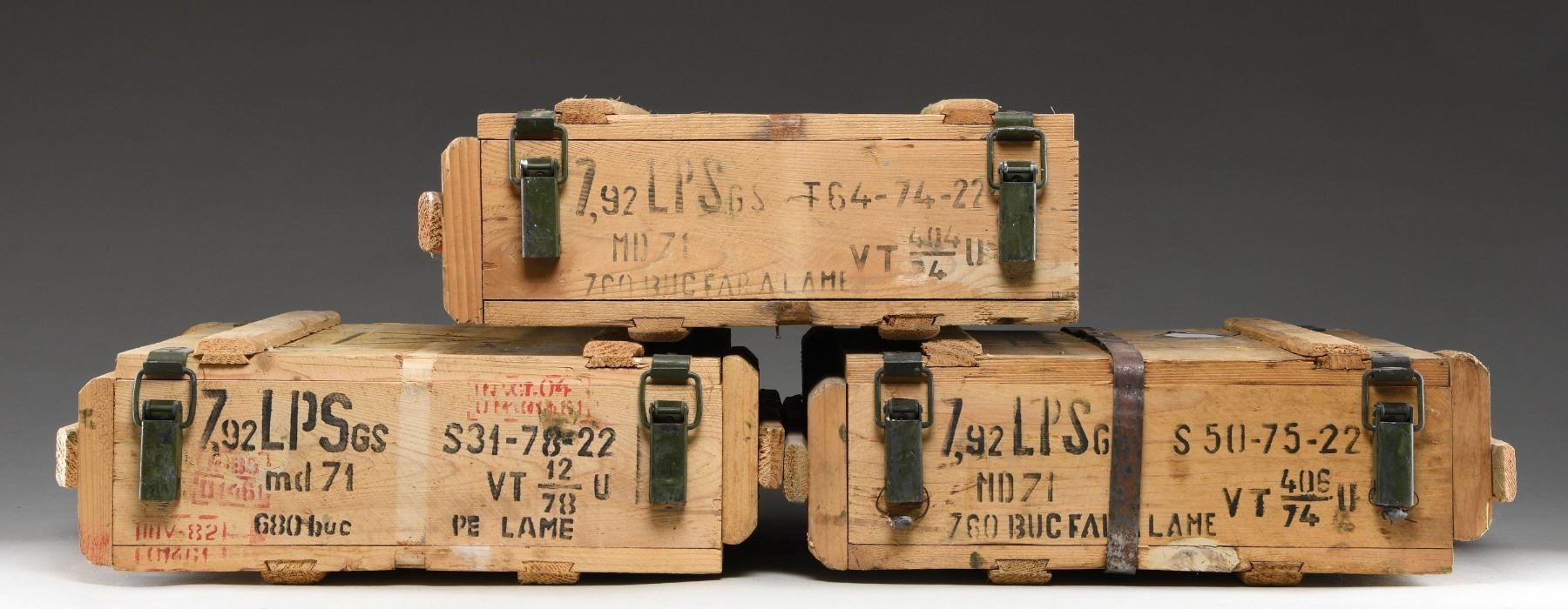Group is contained in three wooden cases, each w/ two sealed metal cans. Two of the cases have 760 rds. & are marked "FARA LAME" indicating that the ammo is not loaded on stripper clips. One case has 680 rds. & is marked "PE LAME" indicating w/ stripper clips. Cases are additionally marked "7.92 LPS GS" which is 8mm Mauser w/ a light ball steel cored bullet & a steel cased cartridge. Group includes steel "can opener". (02-24270-11/RW). AMMO. $900-1,100.