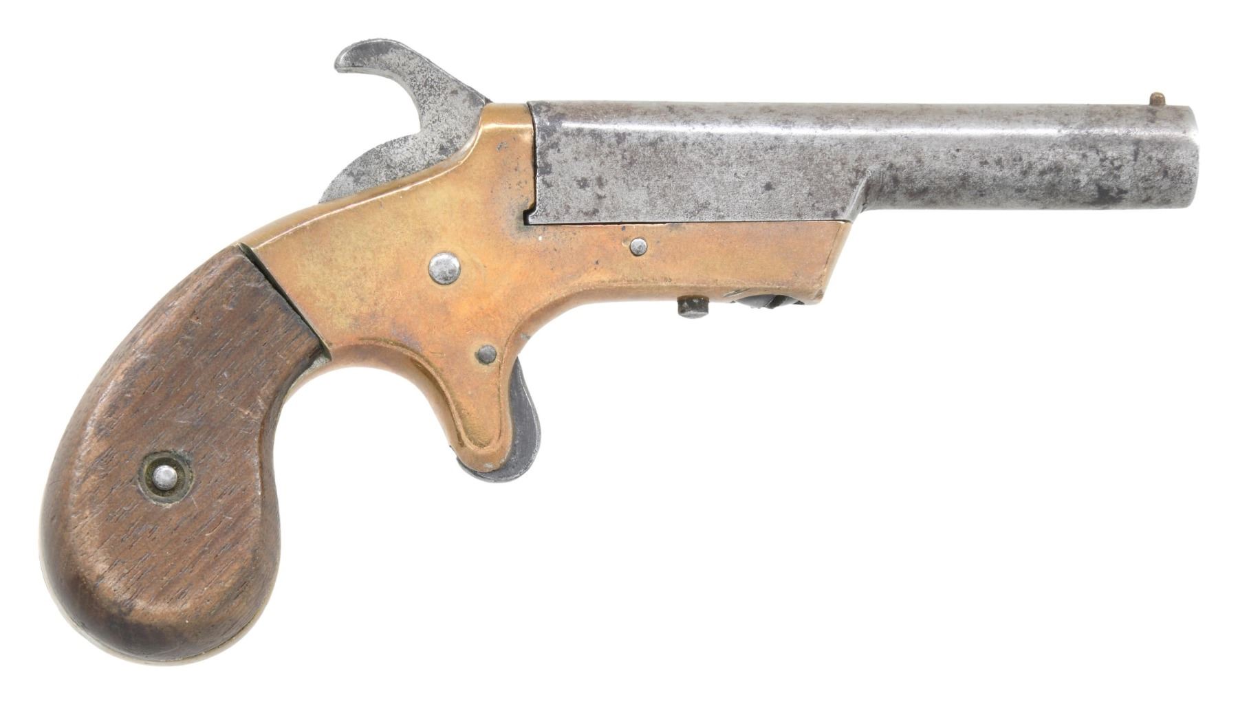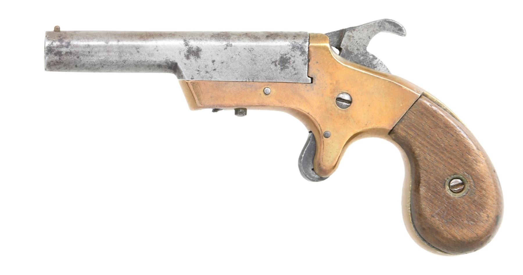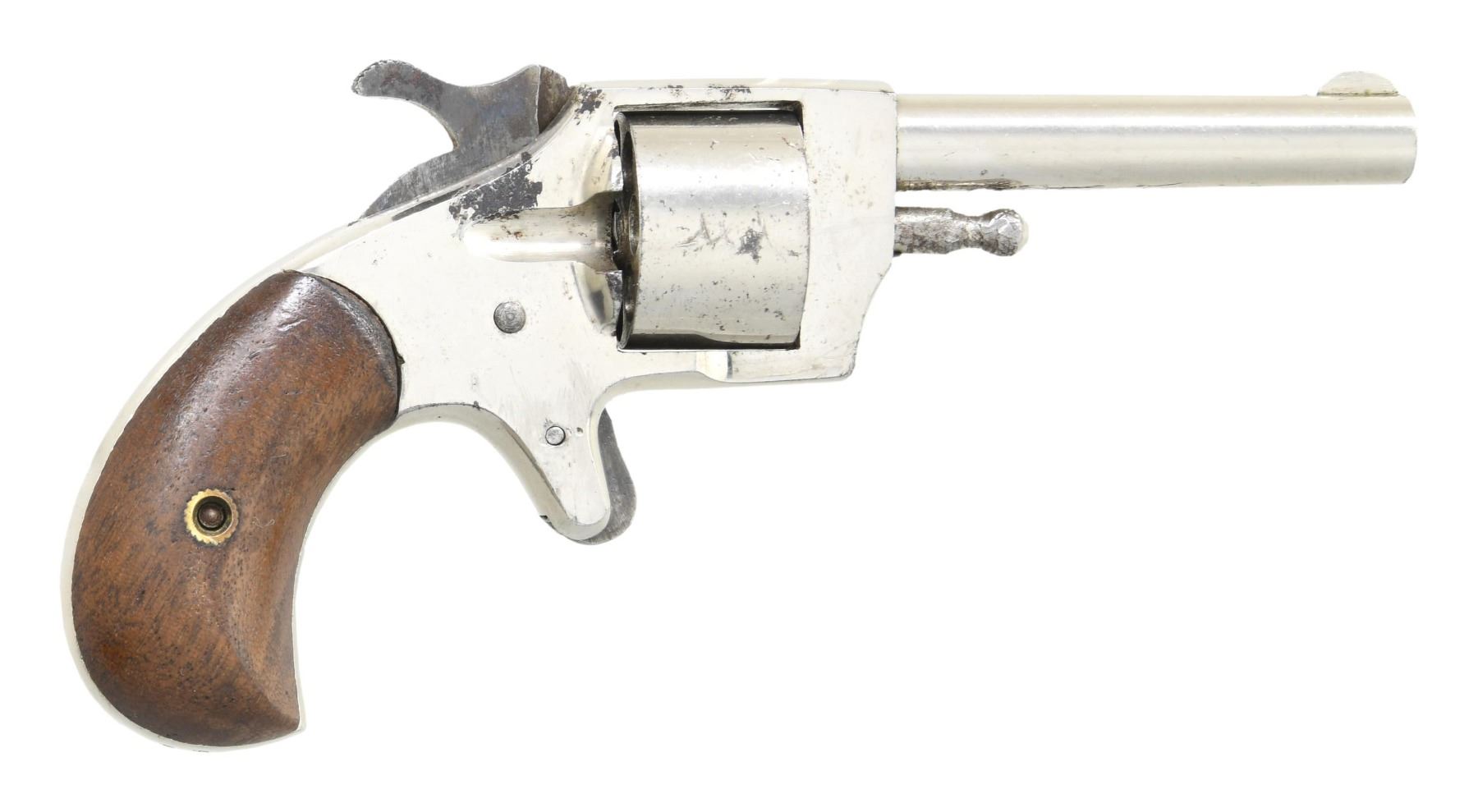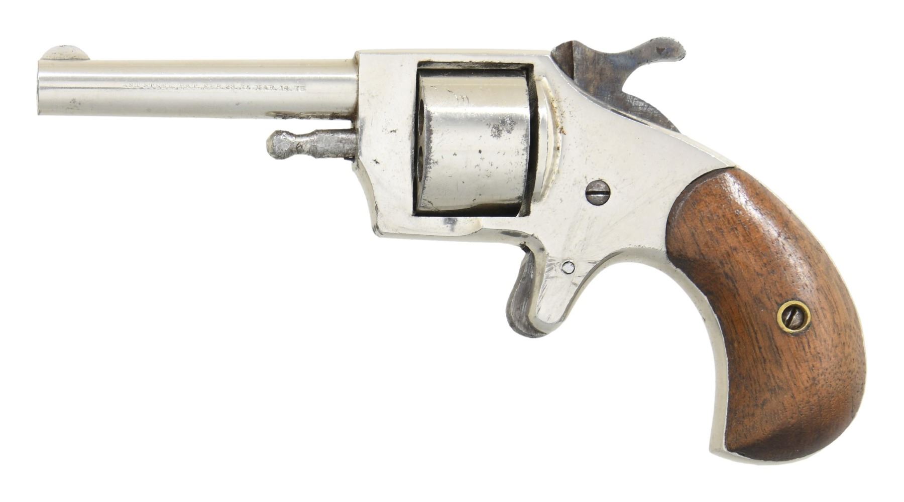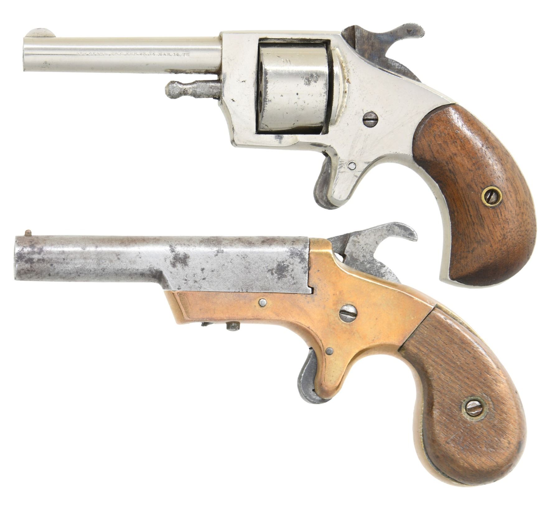 1) HOOD FIREARMS CO. ROBIN HOOD NO. 1 SA REVOLVER. Cal. 22 RF (22 Short). S# 5546. Barrel 2.5". Nickel finish. 7 Shot cyl. Bird's head walnut grips. CONDITION: good nickel finish. Fair grips. Cyl. pin shows deep marks. Poor bore with barely visible rifling. 2) HOPKINS & ALLEN POINTER SPUR TRIGGER PISTOL. Cal. 22 RF. S# K3. Pivoting matching numbered 2.75" barrel. Brass frame. 2 Piece hardwood grips. CONDTION: barrel gray patina with pitting & oxidation. Brass shows marks & patina. Fair grips. Poor bore with barely visible rifling. (01-26577 (2)/ MD). ANTIQUE. $300-400.