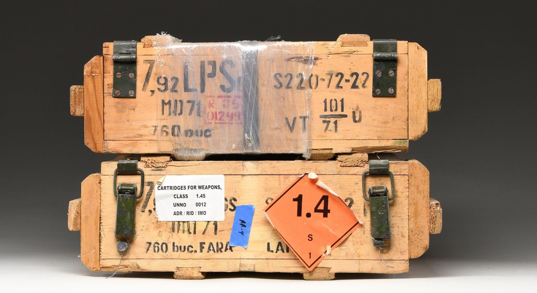 AMMO. 1,520 rds. of 150 gr., lacquered steel cased, Berdan primed, FMJ ammo. CONDITION: crates are sealed with ORMD stickers, blue tape & handling marks. (02-24857-3/MD). AMMO. $350-500.