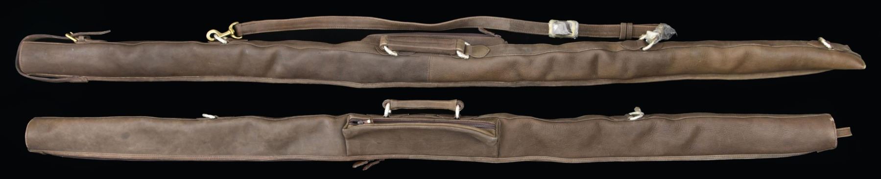 These cases measure approx. 86" in length and have a sturdy double-pull zippers throughout the entire length. The exteriors are expertly tanned buffalo hide and the interiors are lined with fleece. At the center of the outside is 12 1/2" zippered pouch for tools and accessories. Hardware is heavy metal and there is a central robust carrying handle. These heavy cases would be the ultimate in protection for your valued long bow on even the most rigorous of hunting trips or safaris. CONDITION: these cases are unused but do show some slight storage wear. PROVENANCE: from the renowned collection of quality sporting arms from Lewis Drake together with inventory of Lewis Drake Associates. (02-23565-55/BF). $300-500.