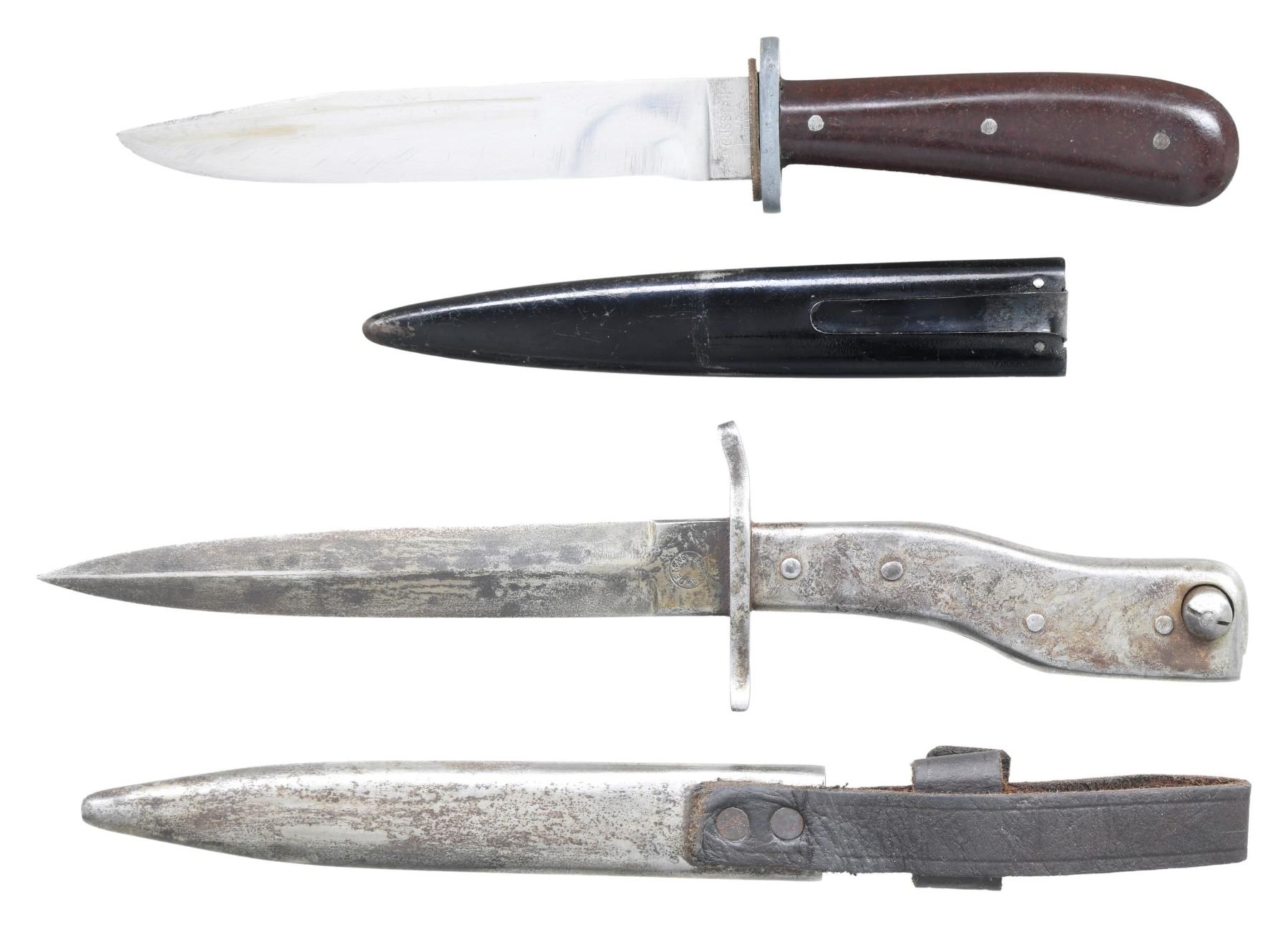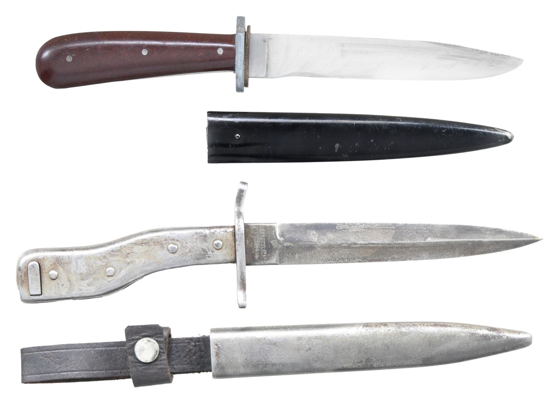 1) FIGHTING KNIFE. The overall length of this knife is10 1/2" and the blade length is 5 1/2". It has a plain blade that is marked on the ricasso "LaGUSSTAHL PUMA SOLINGEN". 2 Piece mahogany colored grip secured by 3 pins on each side. Black enameled scabbard with a spring clip forming a belt loop. CONDITION: light wear overall. 2) BAYONET. This model 1915/18 ersatz bayonet measures 11" overall and features a "crank-handle". The 6" blade has a raised medial ridge a nd is marked at the ricasso "GESETZLICH GESCHUTZT" & "DEMAG DUISBURG". Raw steel guard and off set grip with 4 attachment pins. Raw steel sheath with integral leather belt loop, CONDITION: light overall wear with minor staining. (02-24432-1/BF). $700-1000.