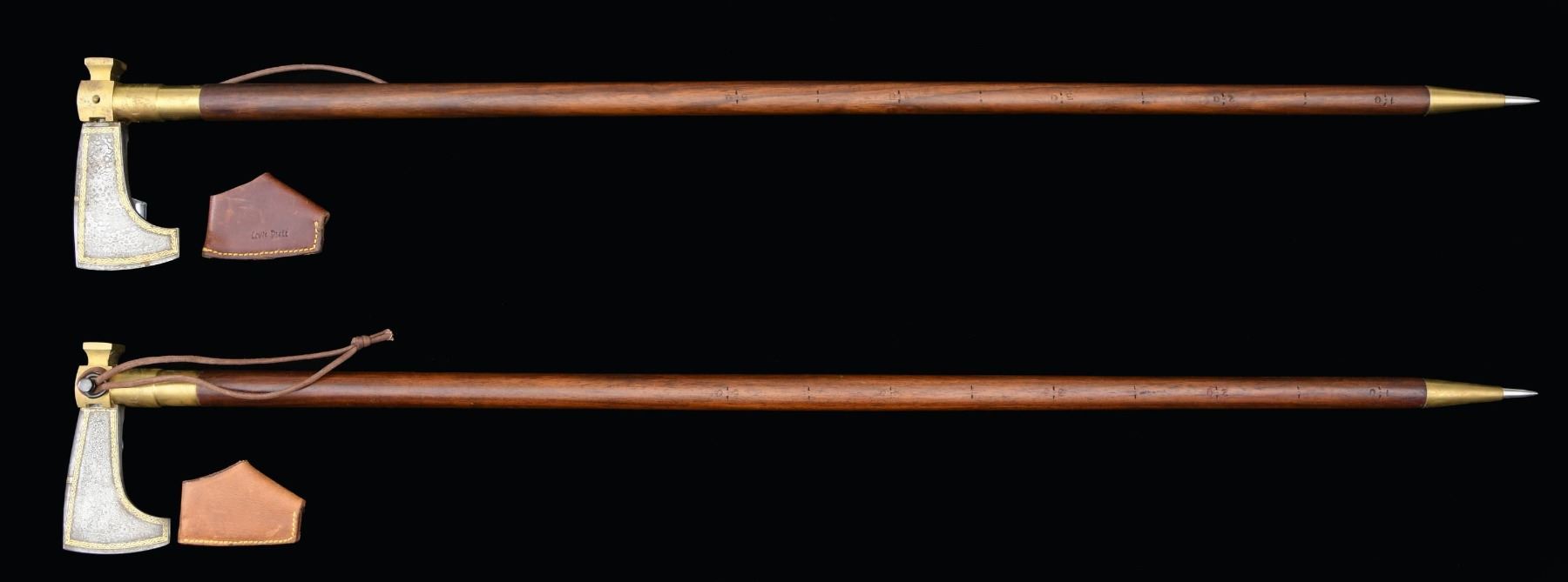 This odd tool is an exact reproduction of an original tool popular in the Eastern English colonies during the Victorian era. It is also referred to in catalogs of the 1870's as a "Planter's Axe." This version has a hand-forged Damascus steel blade, brass head, solid rosewood shaft, and brass end with a pointed steel tip. Expert craftsmen have added a luxurious gold inlay detail around both sides of the blade for a splendid appearance. The blade is quickly removable and can be rapidly placed in one of several different configurations for chopping, hoeing, pruning, weeding, planting, or use simply as a walking stick after replacing the leather guard over the cutting edge. The flat brass end of the head can be used as a hammer. The shaft is marked in centimeters on one side and inches on the other and could be used to quickly measure the depth at which crops were planted. Equally at home in the hands of a woodsman, gardener, horticulturalist, camper, or hiker. This magnificent tool is always a pleasure to use or to simply admire for its functional beauty and quality. CONDITION: both axes are unused and show storage wear only. PROVENANCE: from the renowned collection of quality sporting arms from Lewis Drake together with inventory of Lewis Drake Associates. (02-23565-16/BF). $400-700.