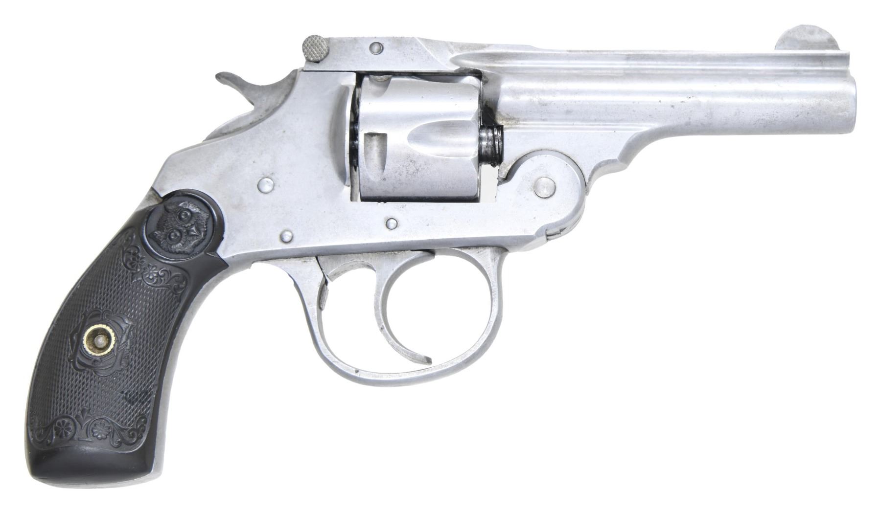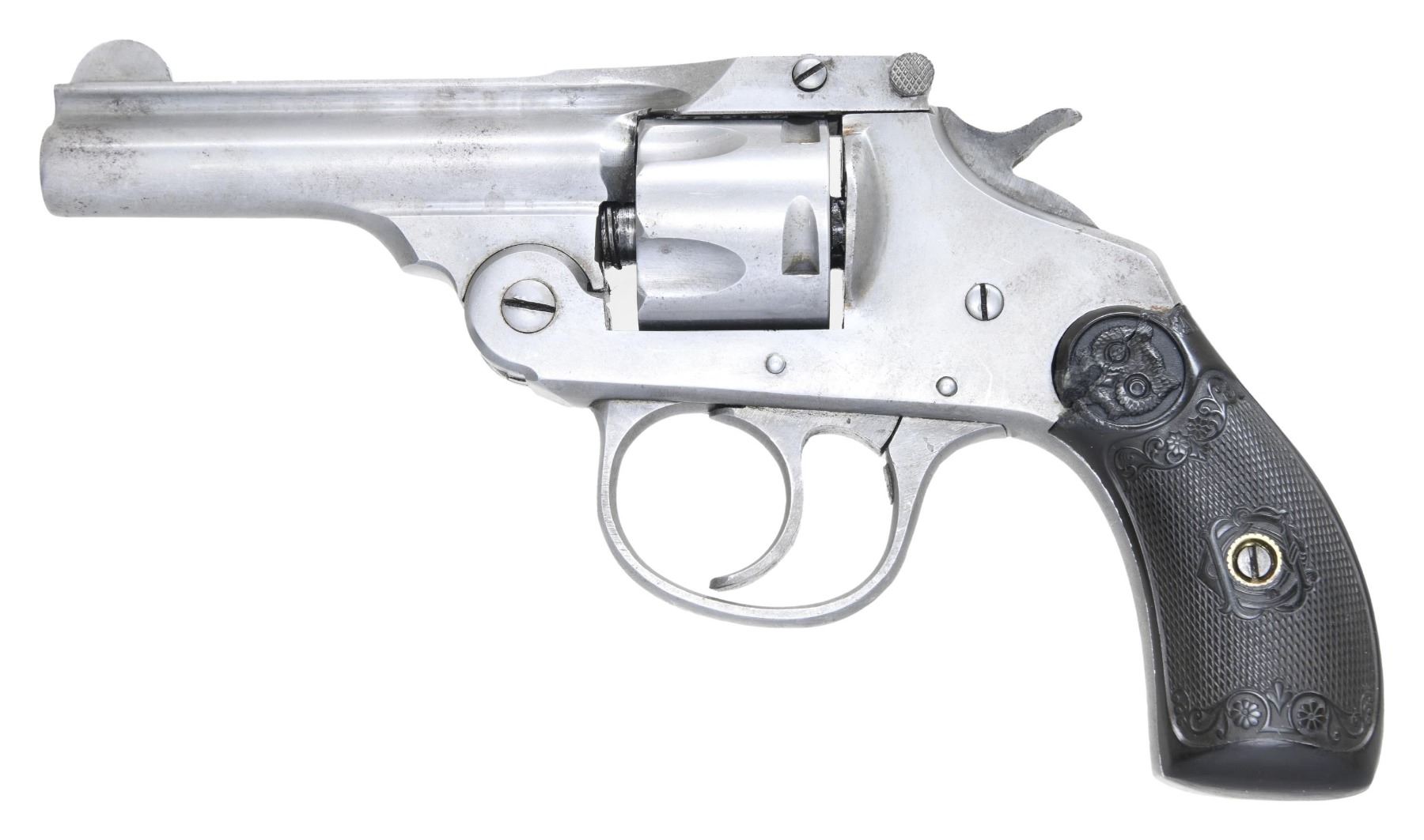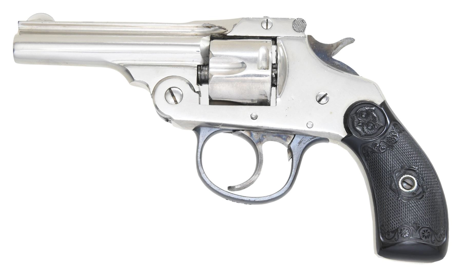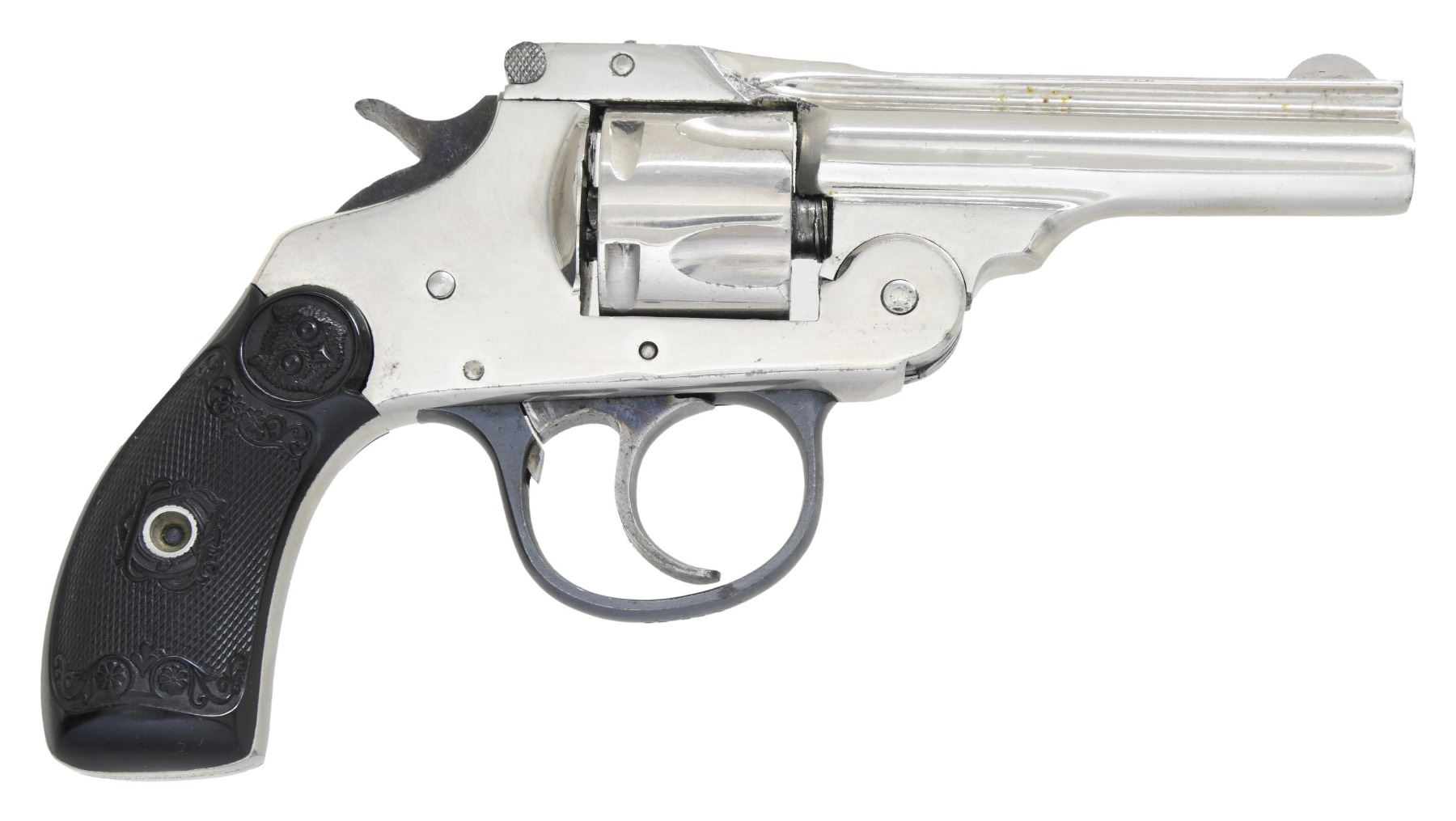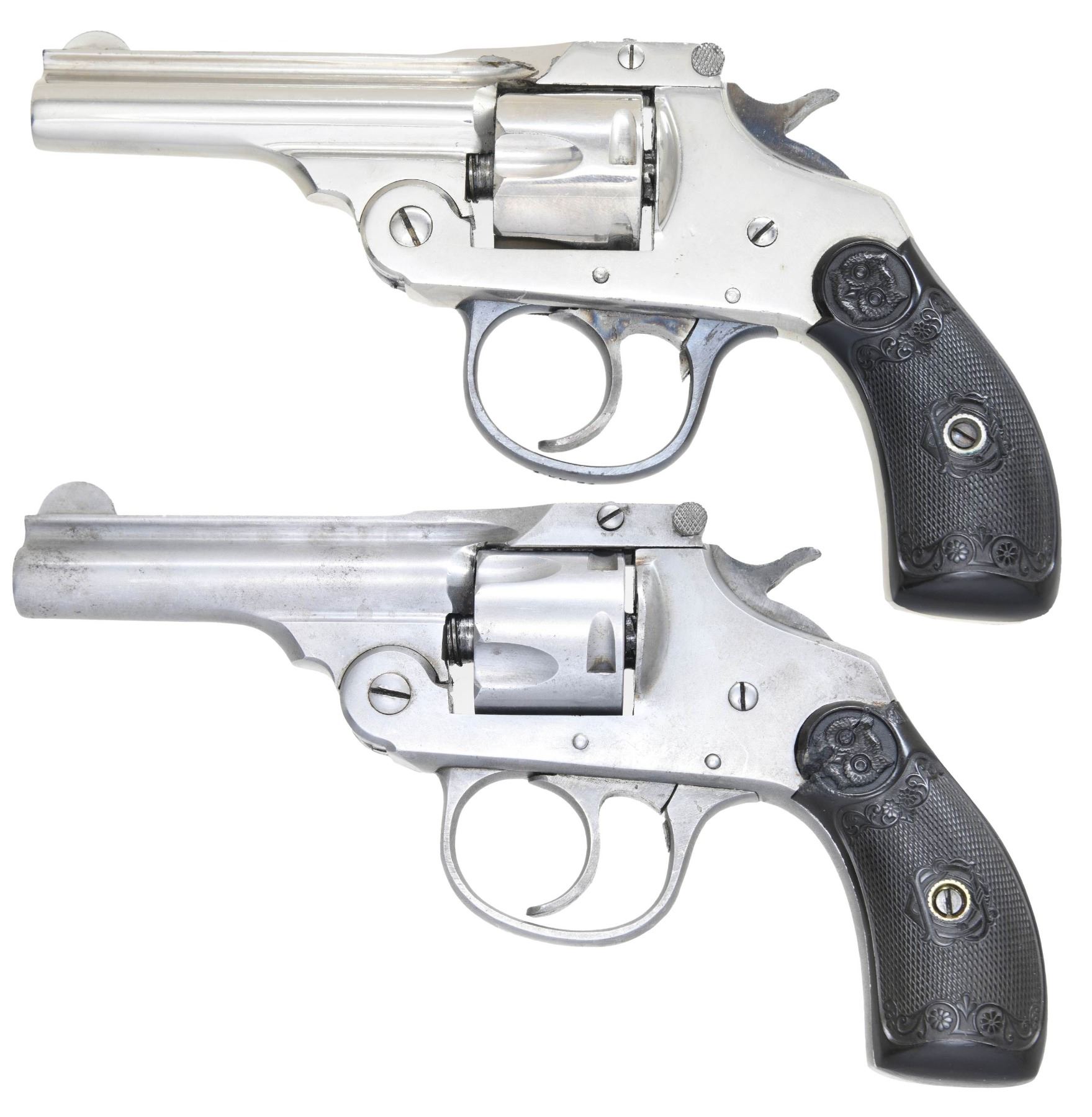REVOLVERS. ALL: Cal. 32 S&W. Bbls. 3". Fixed sights. 5 Shot fluted cyls. Two piece hard rubber grips. 1) 2ND MODEL. S# P15524 (under grips). Mfg. 1906. Nickel finish on bbl. & frame. Blued triggerguard. Case colored hammer & trigger. CONDITION: very good nickel. Very good blue & case color finish. Very good grips. Very good bore overall with large spots of pitting. (25-4114/MD). 2) 3RD MODEL. S# S49209 (under grips). CONDIITON: metal has gray cleaned appearance with little original finish; markings on butt have been obliterated. Good grips with sm. chip on left panel. Good bore with light pitting. (25-4115/MD). ALL CURIO. $300-450.