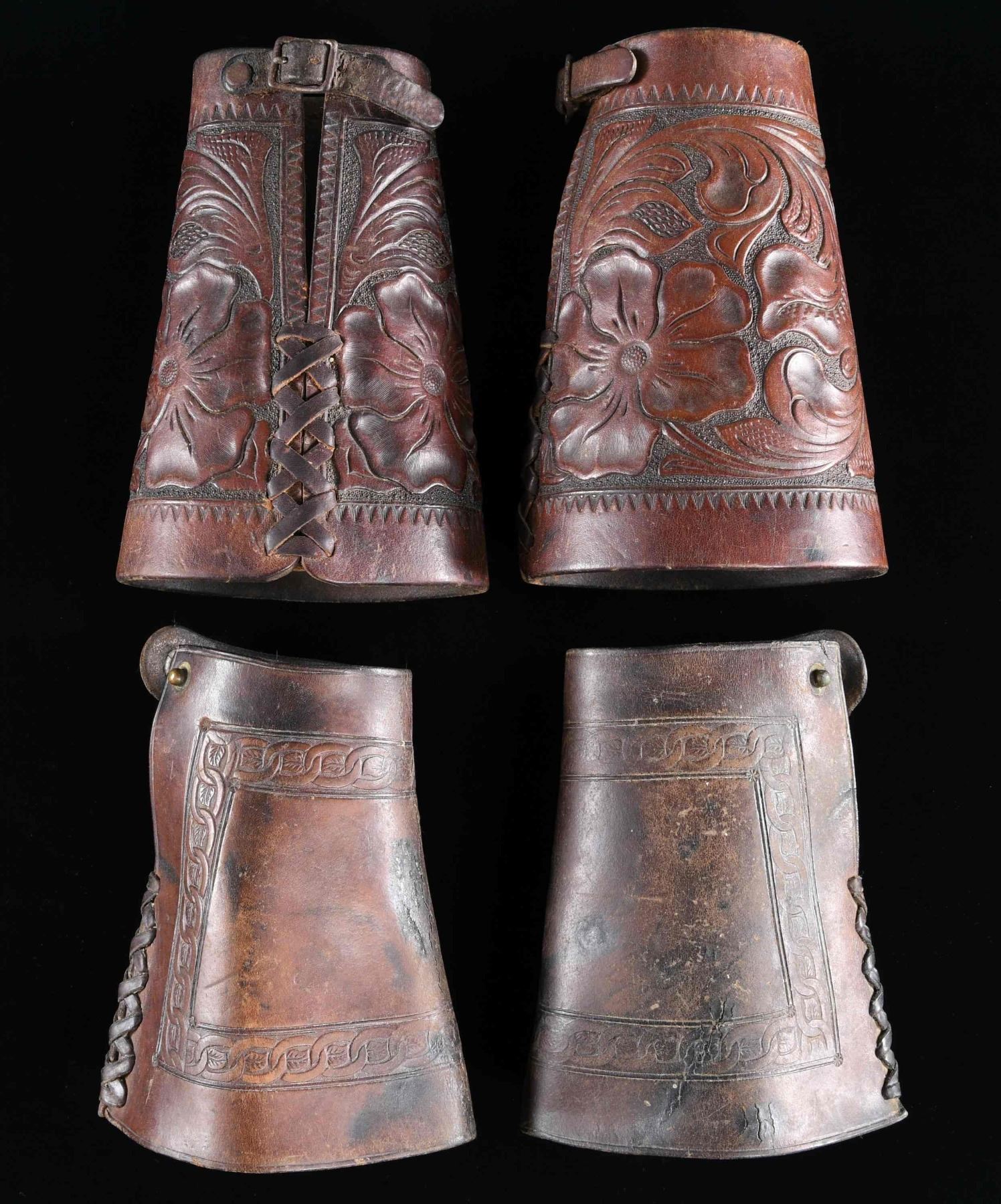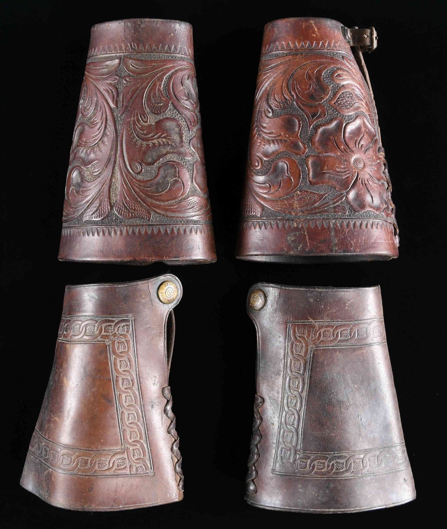 1) This pair of vintage leather cowboy cuffs has an overall tooled floral motif. The top is laced and the bottom has a buckle and strap closure. There are no markings. CONDITION: light wear. 2) This pair of vintage cuffs has a chain link design encircling the cuffs about 1" in from the edges. The tops have a lace closure and the bottoms snap. The snaps are marked "SEATTLE SADDLERY". CONDITION: light wear. (02-24563/BF). $150-300.