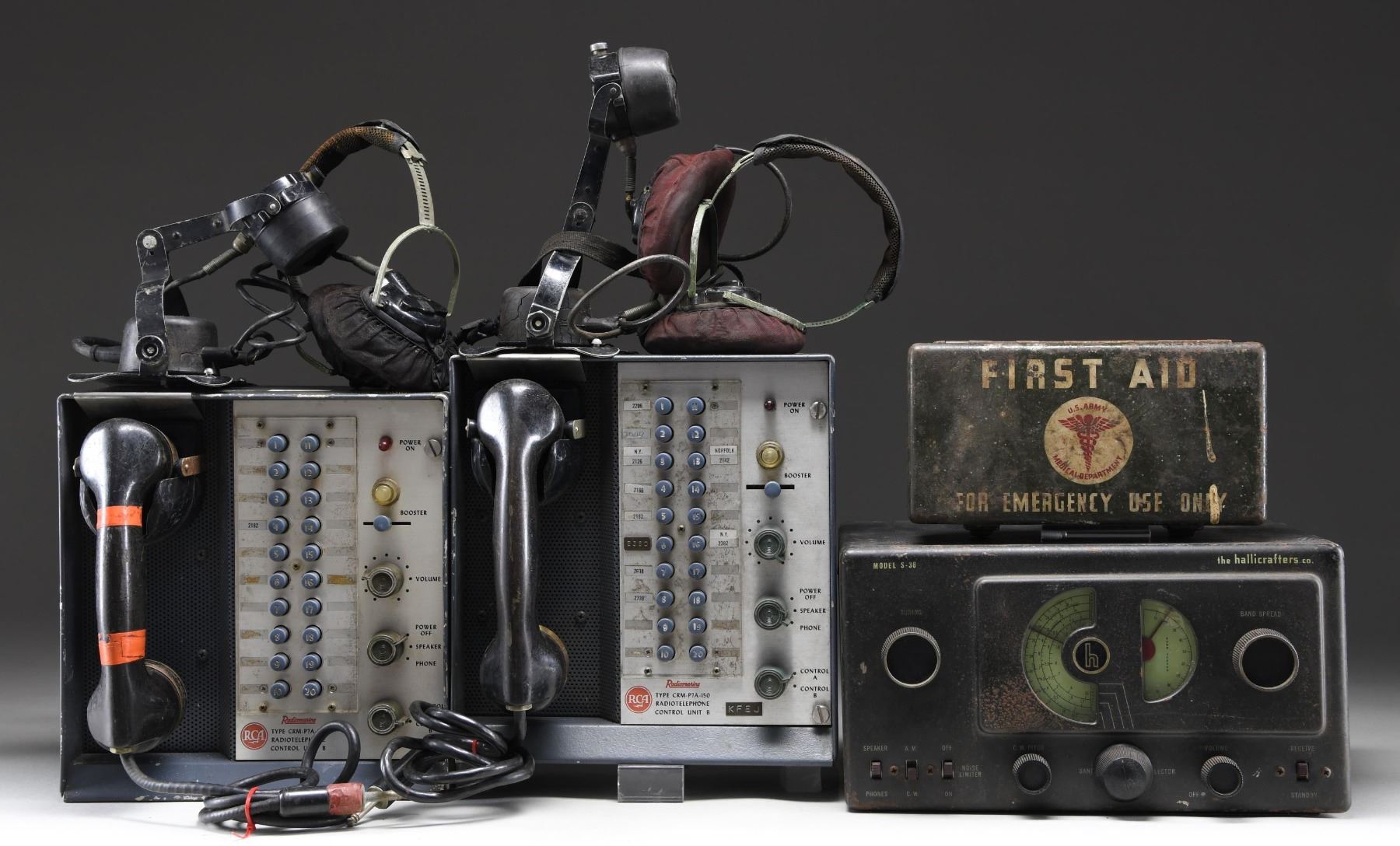 & A FIRST AID BOX. This lot includes 2 radio telephones, marked "RCA Radiomarine TYPE CRM-P7A-150 RADIOTELEPHONE CONTROL UNIT B". Each unit has 20 push-button selectors, three dials, and a booster slide adjustment. The units measure roughly 11" x 10 1/2" and are complete with an associated handset. / 1 Radio receiver, marked "the hallicrafters co. MODEL S-38". This receiver is dark green in color and is complete with associated knobs and switches. / 2 Headsets and mic sets with long plugin phone cords. / 1 First aid kit in dark green with "FIRST AID FOR EMERGENCY USE ONLY U.S. ARMY (caduceus) MEDICAL DEPARTMENT". This kit has no contents. CONDITION: radio telephones seem complete with moderate wear. Functionality has not been determined. Radio receiver shows light to moderate wear overall but appears complete. This receiver has not been tested to see if it works. Headsets/handsets show light to moderate wear. First aid kit box shows wear with a few paint spatters. (02-23763/BF). $250-500.