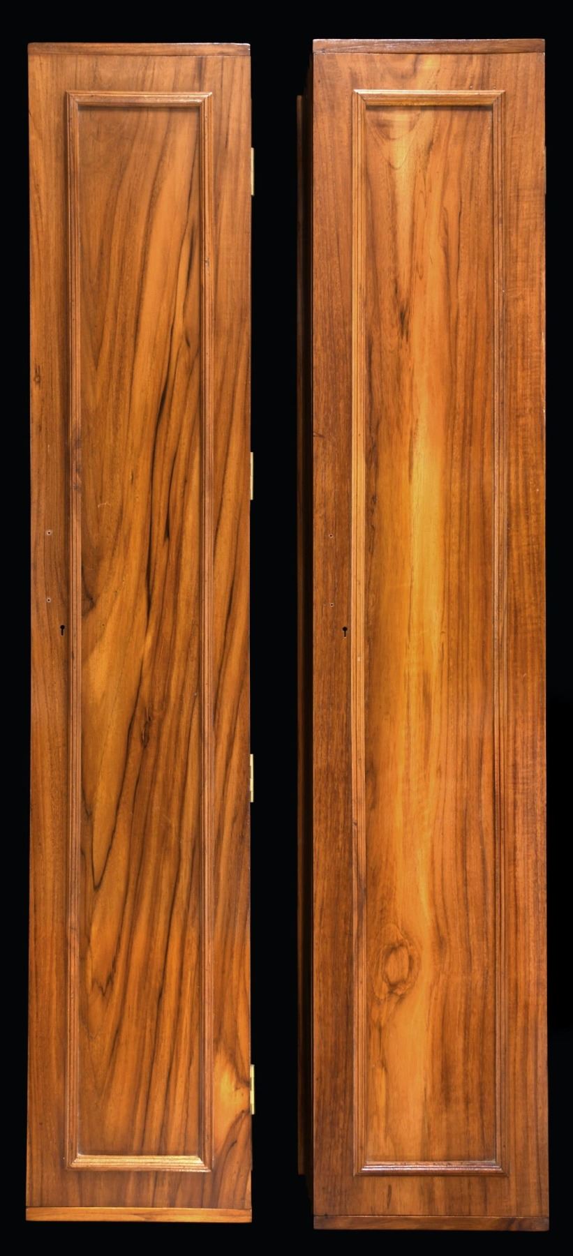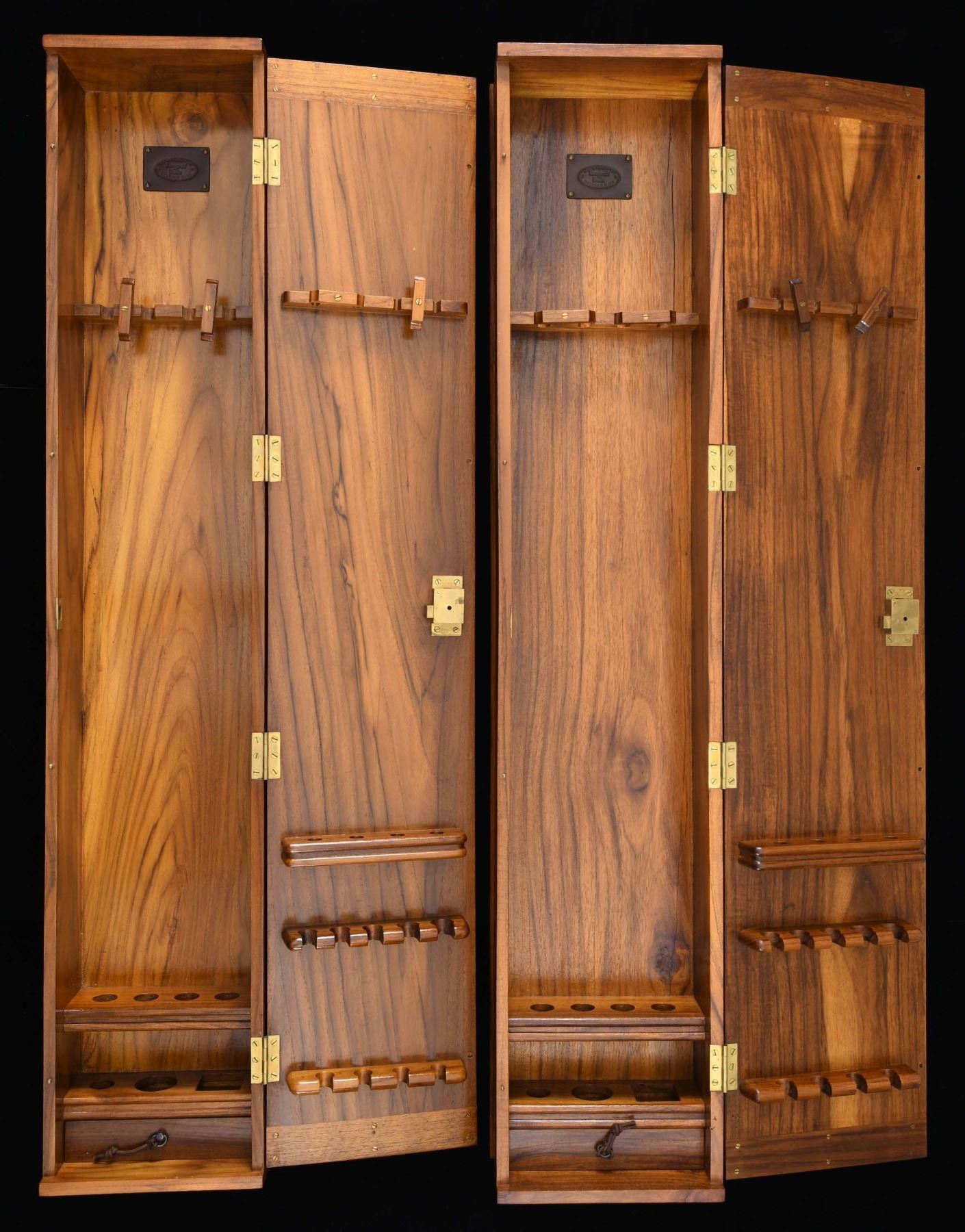 CABINETS. Each one of these cabinets measures approx. 48" long x 9" wide x 5" deep. Each cabinet has a door with 4 solid brass hinges and a brass lock that can be mounted to the door of the cabinet. The interiors of the cabinets have a variety of holders for all manner of gun cleaning implements. There are spaces for oils, greases, solvents, and other necessities for cleaning guns. There is an impressed leather label on the interior of each case that reads "HANDCRAFTED Roosevelt and Drake BUFFALO HIDE". Each cabinet has 2 very heavy brass brackets on the reverse for mounting to the wall. CONDITION: both cabinets are unused but do show scattered storage wear. PROVENANCE: from the renowned collection of quality sporting arms from Lewis Drake together with inventory of Lewis Drake Associates. (02-23565-19/BF). $400-800.