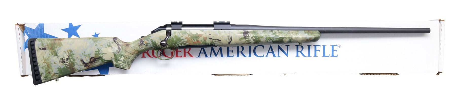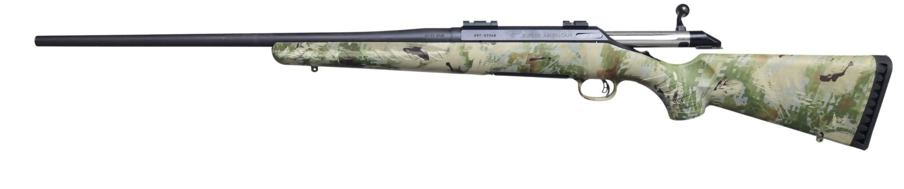 2) WOLF CAMO. Cal. 30-06. S# 697-03348. Shipped 2007 as Model 06948. Bbl. 22". Matte black finish. 2 Piece Weaver style rail. Go Wild Camo pattern synthetic stock. MAGS: 2-5 Rds. UNATTACHED ACCESSORIES: Leupold Back Country Picatinny rail for Ruger American long action. Matching box. CONDITION: Near excellent overall. The bore is bright with strong rifling. (24-3231/MD). ALL MODERN. $600-800.