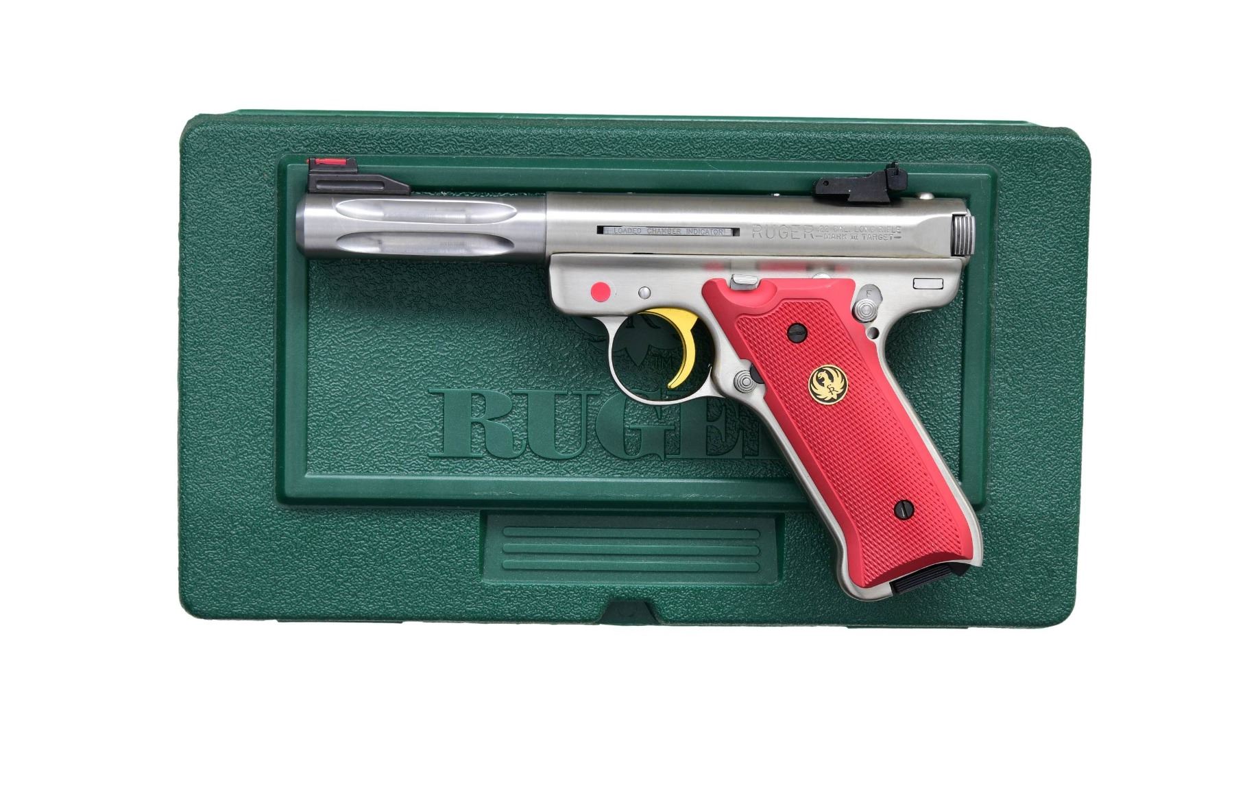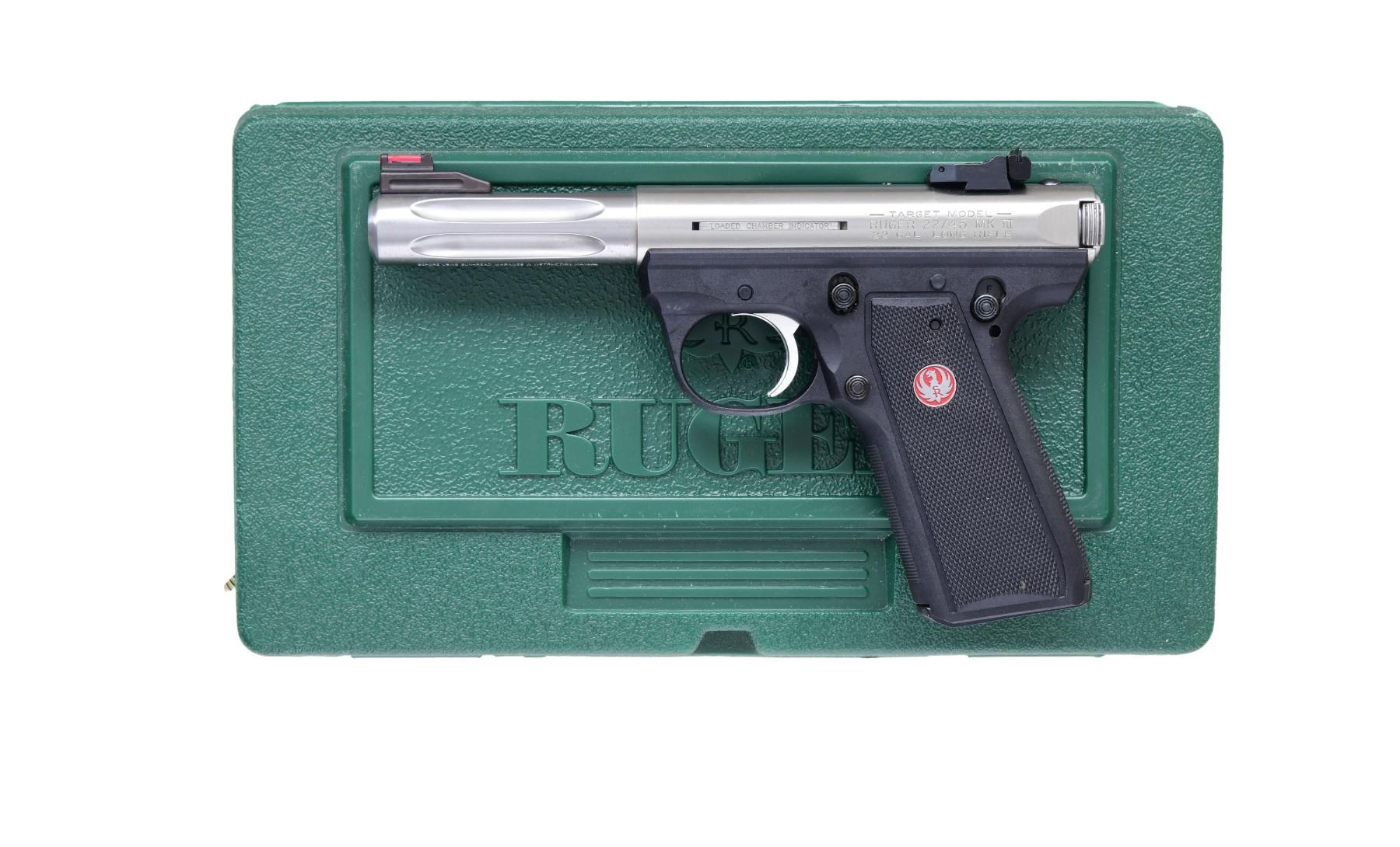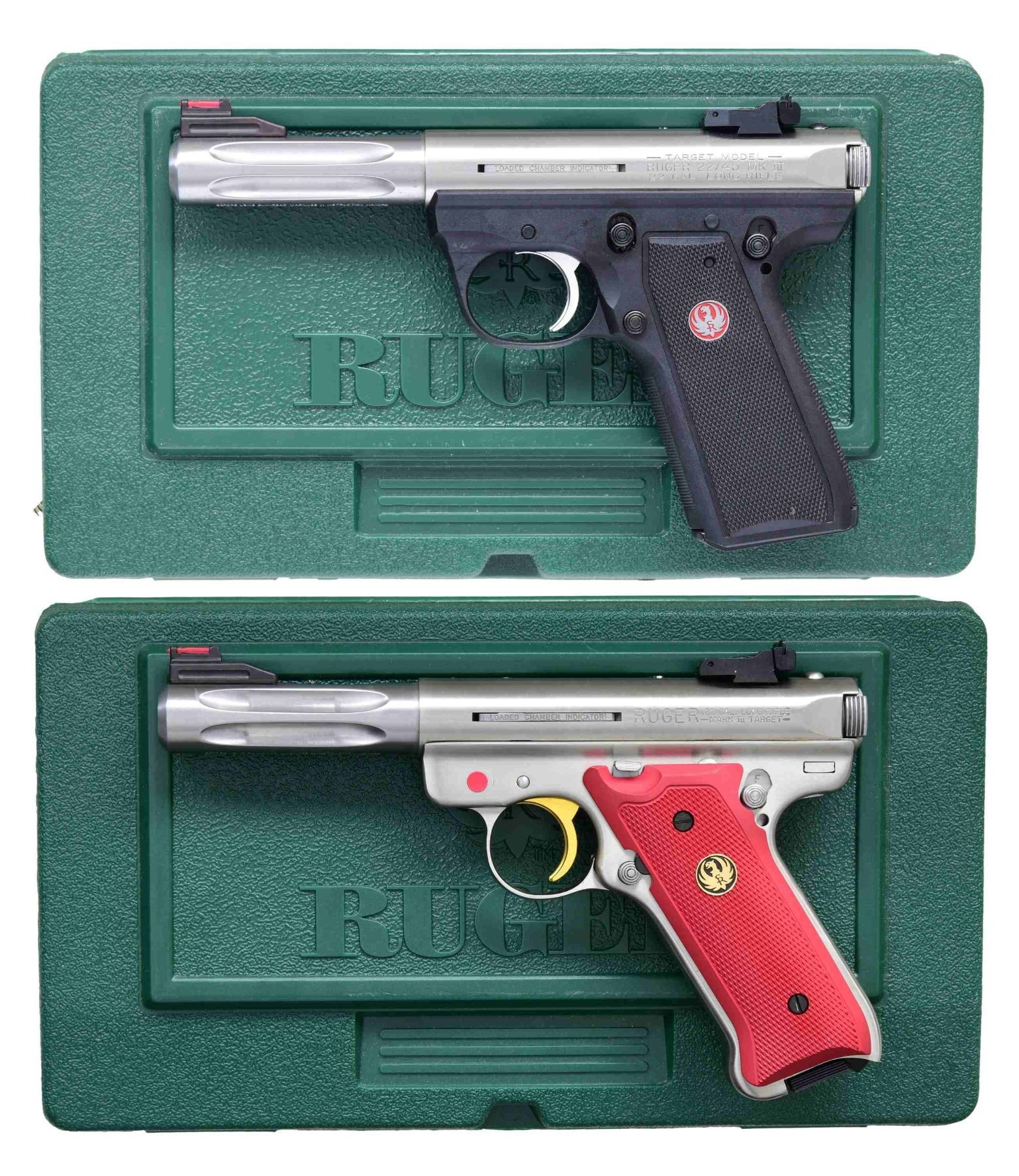 MATCHING FACTORY BOXES. ALL: Cal. 22 LR. Stainless finish 4.5" fluted barrel. Hi-Viz sights. MAGS: each pistol has 2-10 rd mags. UNATTACHED ACCESSORIES: each pistol has Factory box w/ paperwork & accessories. CONDITION: both pistols appear near excellent overall including bores. 1) MODEL 10121. S# 270-08310. Mfg. 2006 as Catalog No. KP45MKIII. Black polymer frame & checkered black synthetic grips with red Ruger medallion. (24-2924/MD). 2) MODEL 10129. S# EB-00634. Mfg. 2008 as Catalog No. KMKIII45HEB. Stainless steel frame w/ red checkered grips with Ruger medallions. (24-3458/MD). ALL MODERN. $500-$800.