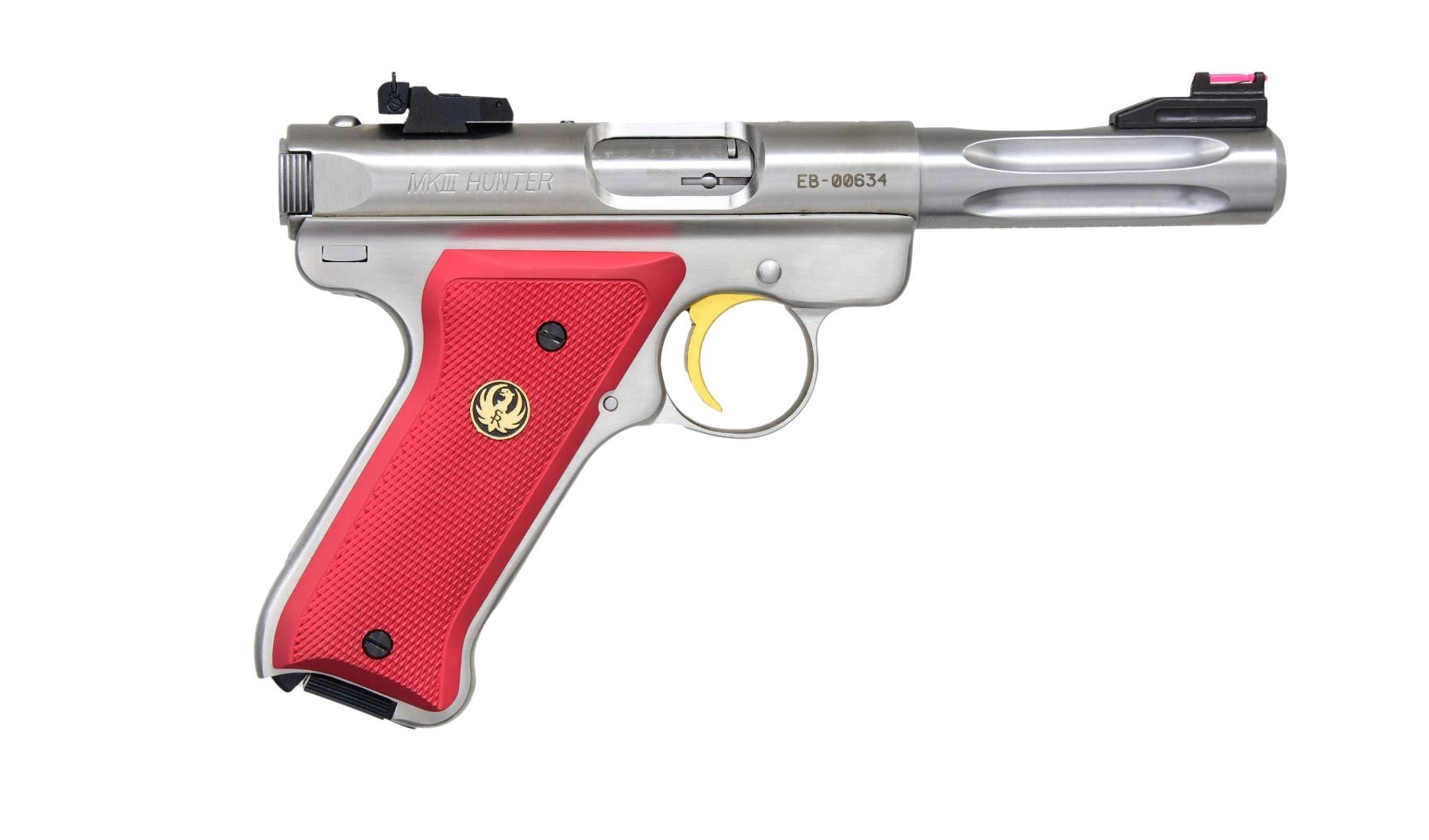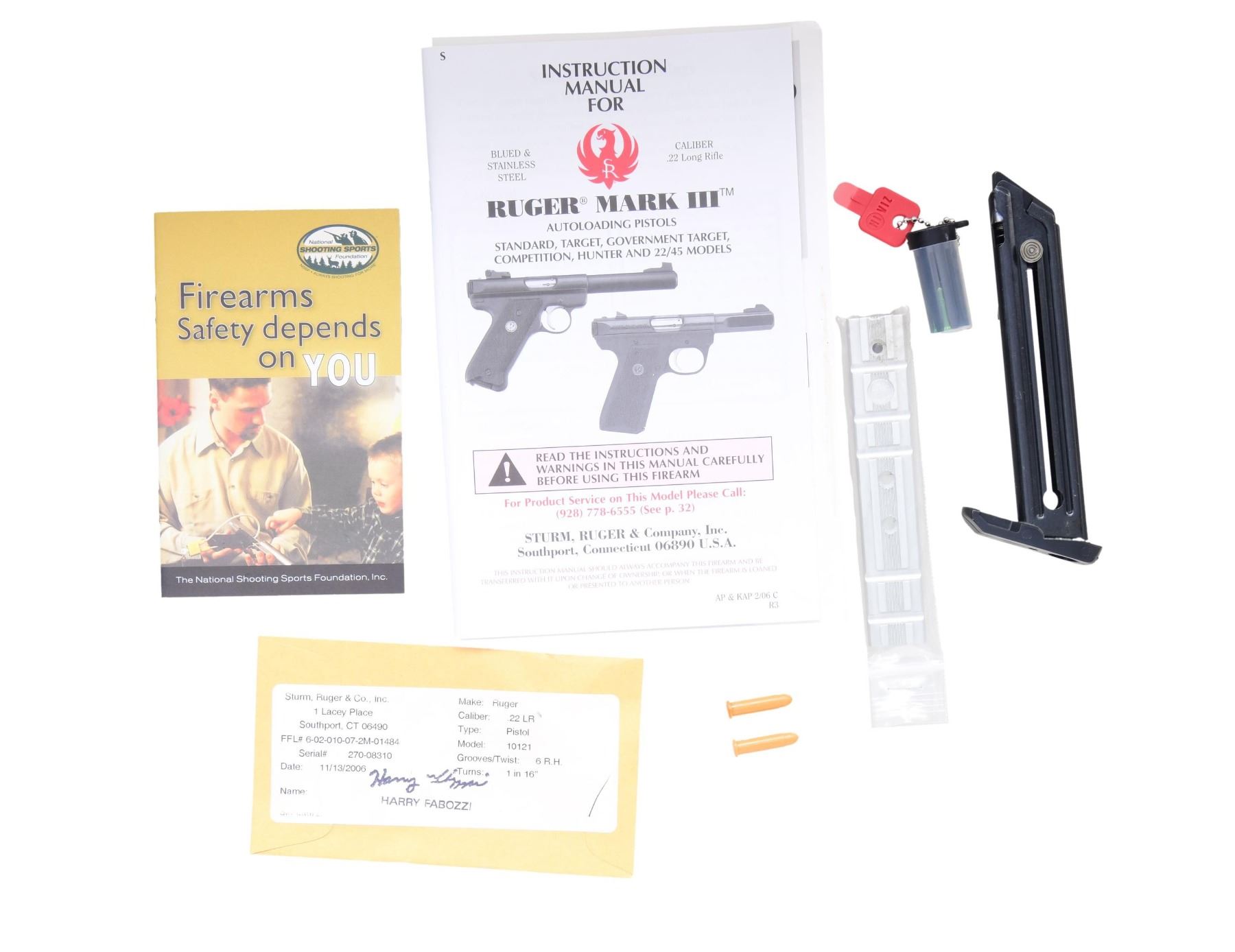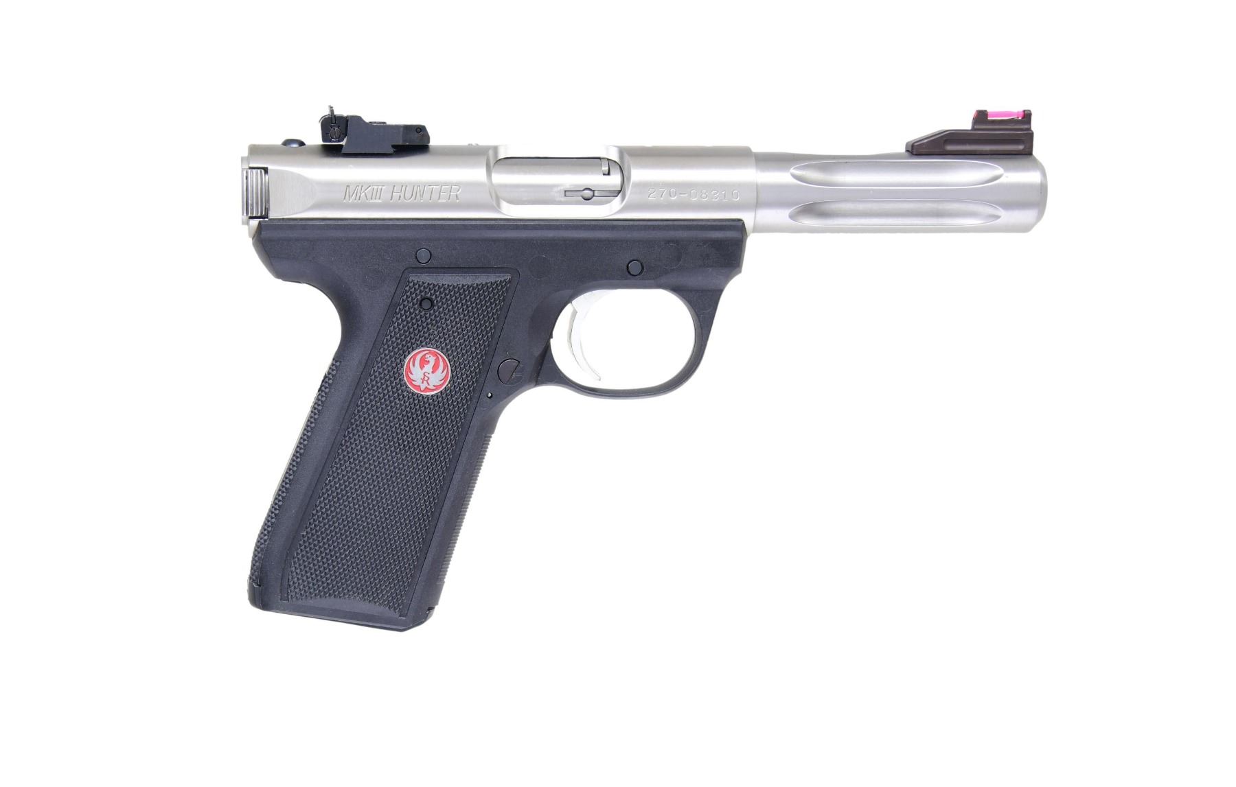 MATCHING FACTORY BOXES. ALL: Cal. 22 LR. Stainless finish 4.5" fluted barrel. Hi-Viz sights. MAGS: each pistol has 2-10 rd mags. UNATTACHED ACCESSORIES: each pistol has Factory box w/ paperwork & accessories. CONDITION: both pistols appear near excellent overall including bores. 1) MODEL 10121. S# 270-08310. Mfg. 2006 as Catalog No. KP45MKIII. Black polymer frame & checkered black synthetic grips with red Ruger medallion. (24-2924/MD). 2) MODEL 10129. S# EB-00634. Mfg. 2008 as Catalog No. KMKIII45HEB. Stainless steel frame w/ red checkered grips with Ruger medallions. (24-3458/MD). ALL MODERN. $500-$800.