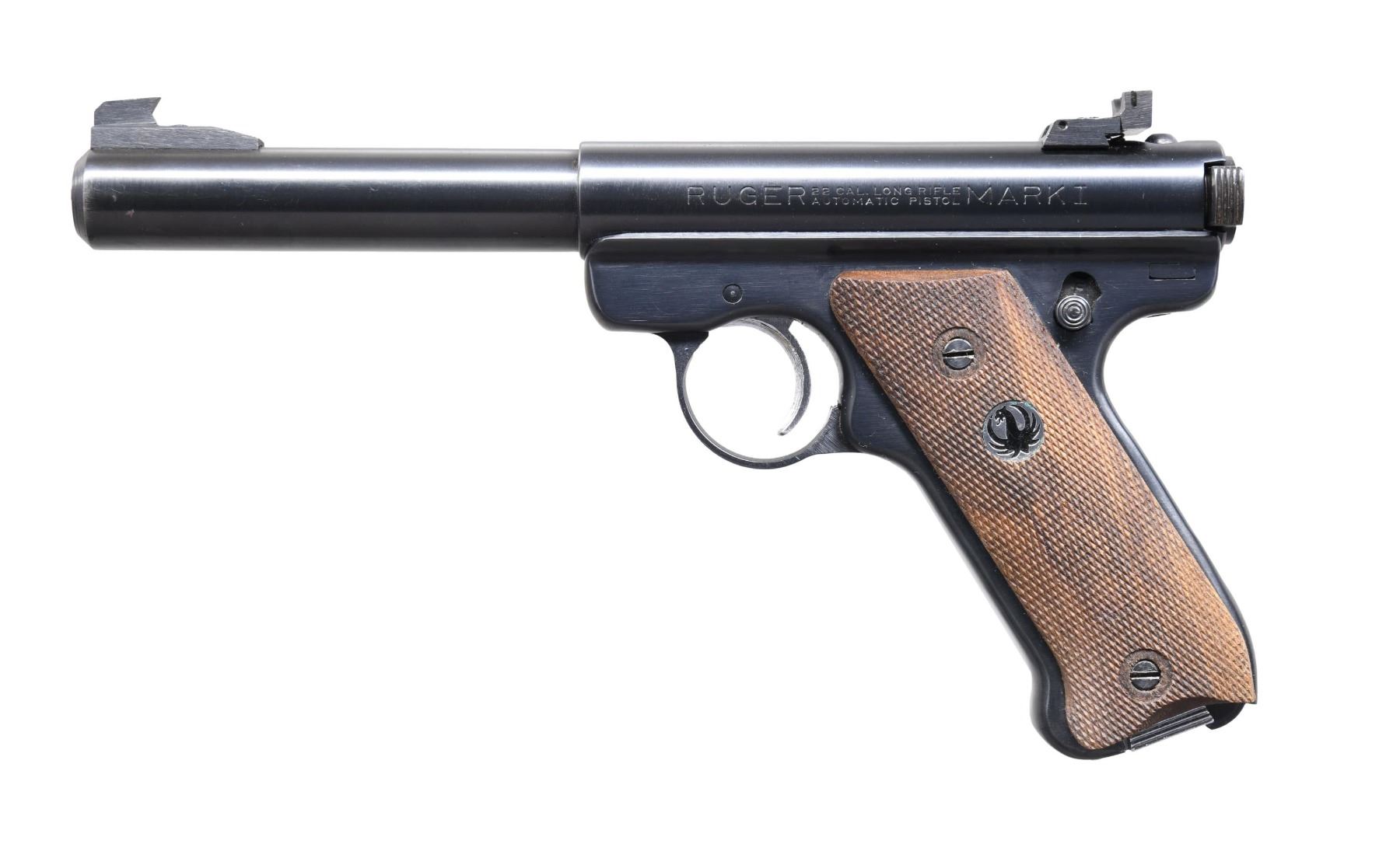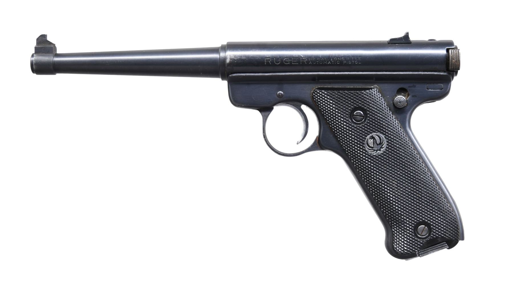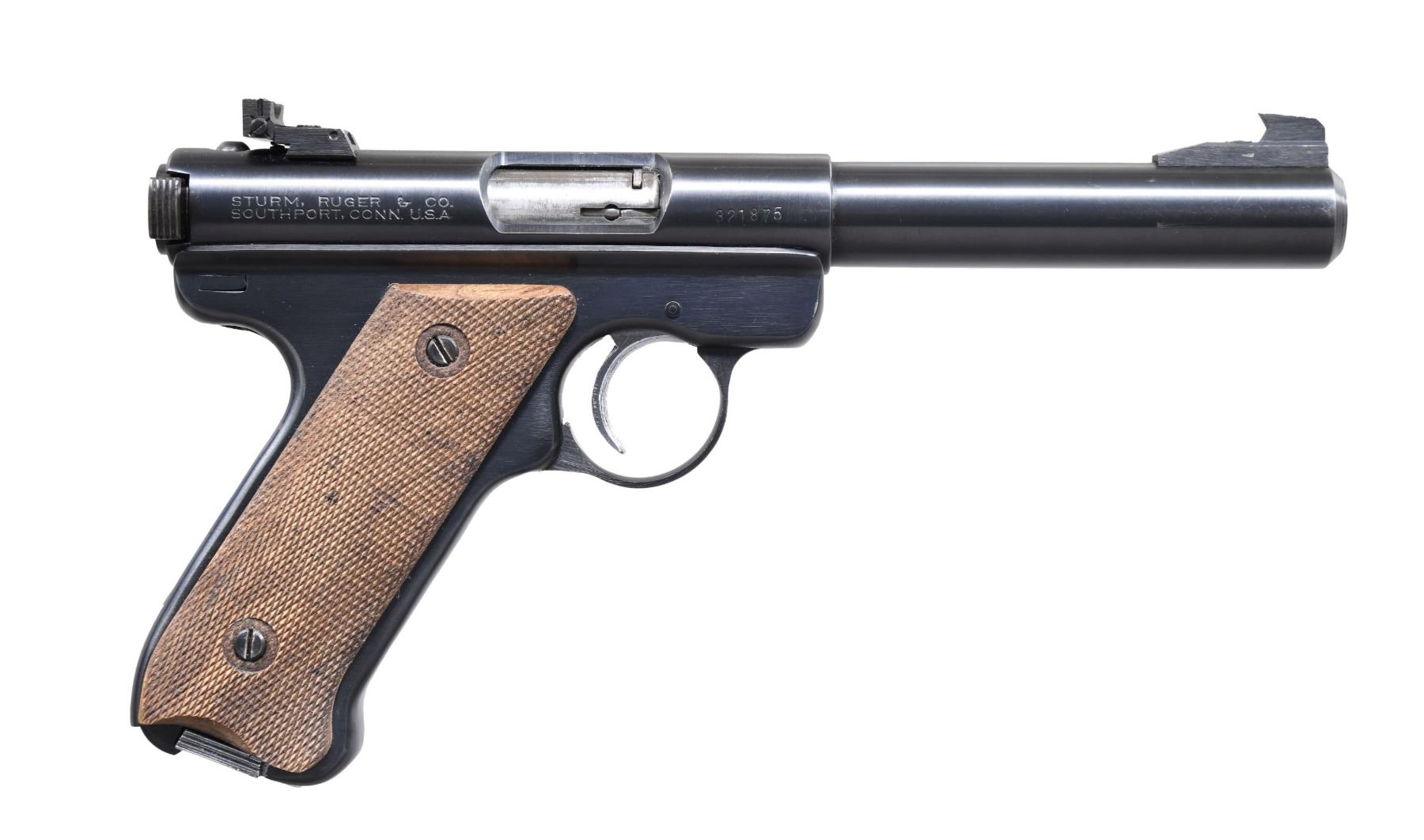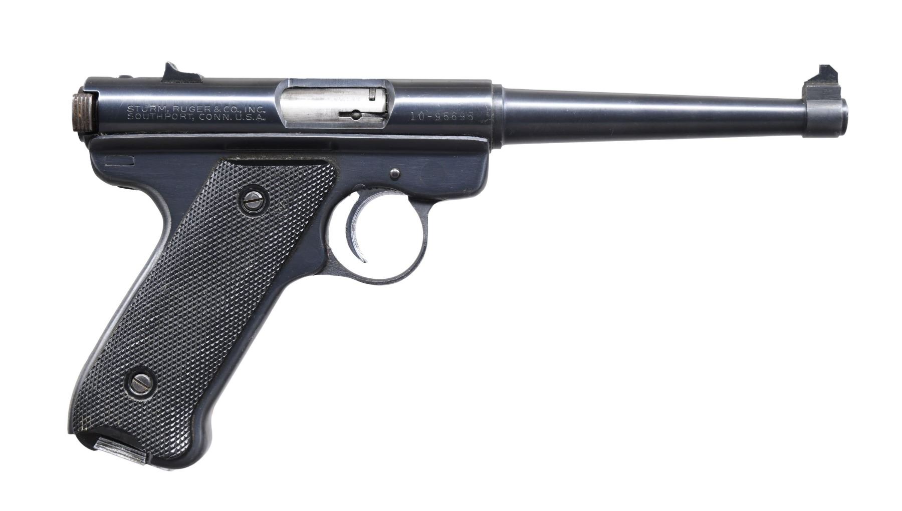 ALL: cal. 22 LR. A54 grip frames. MAGS: 1 - 9 rd. each. 1) MARK I T512. Cal. 22 LR. S# 321875 (1966). Bull 5 1/2" barrel. Target front sight & "Micro" adjustable rear sight. Walnut grips with black eagle medallion on left side. CONDITION: Very good blue with light wear. Good grips. Shiny bore. (25-2011/MD). 2) RST6 STANDARD AUTO. Cal. 22 LR. S# 10-95695 (1971). Tapered 6" barrel. Hooked blade front sight & square notch fixed rear sight. Black checkered grips with black eagle medallion on left side. CONDITION: Good blue showing marks & wear. Good grips with wear to medallion. Shiny bore. PROVENANCE: Lifelong Collection of Bill Peterken. (25-2012/MD). ALL CURIO. $300-500.