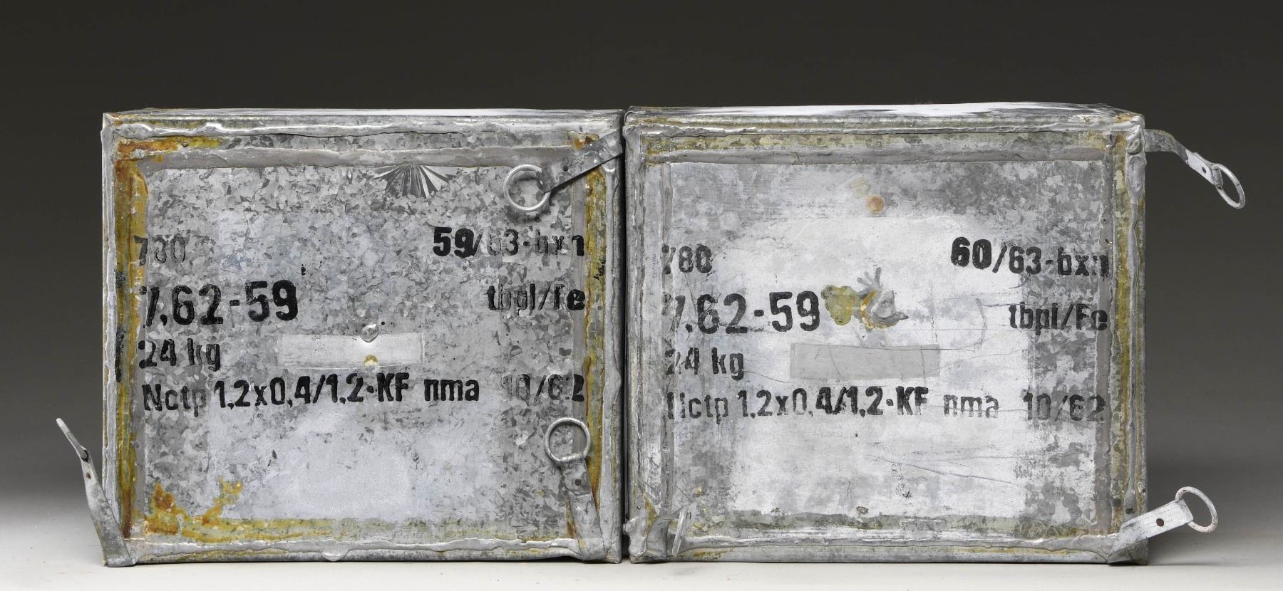 1,560 Rds. of "BXN" steel lacquer case, spitzer boat tail steel core silver tip ammo. CONDITION: cans sealed as is with blue tape & ORDM stickers on outside. (02-24585-8/MD). $500-750.