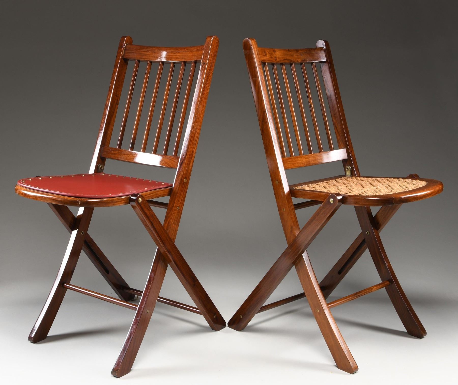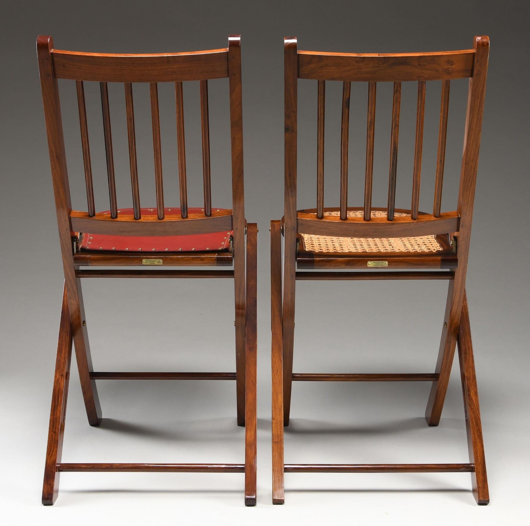 This lightweight, yet, very sturdy and comfortable chair was inspired by safari furniture observed by Lewis Drake in Bombay, India. Drake was so impressed he had them reproduced in rosewood with genuine buffalo hide seats. One example has a double cane seat rather than buffalo hide. This finely crafted chair is nearly impervious to weather and is easy to pack for your next picnic in the park, sporting event, or afternoon at the coast. The chairs measure 18" deep, 15 1/2" wide, 33" in overall height with a 17 1/2" seat height. Collapsed the chairs measure 36" x 4". CONDITION: chairs show light storage wear with a few scattered scratches. PROVENANCE: from the renowned collection of quality sporting arms from Lewis Drake together with inventory of Lewis Drake Associates. (02-23565-11/BF). $300-500.