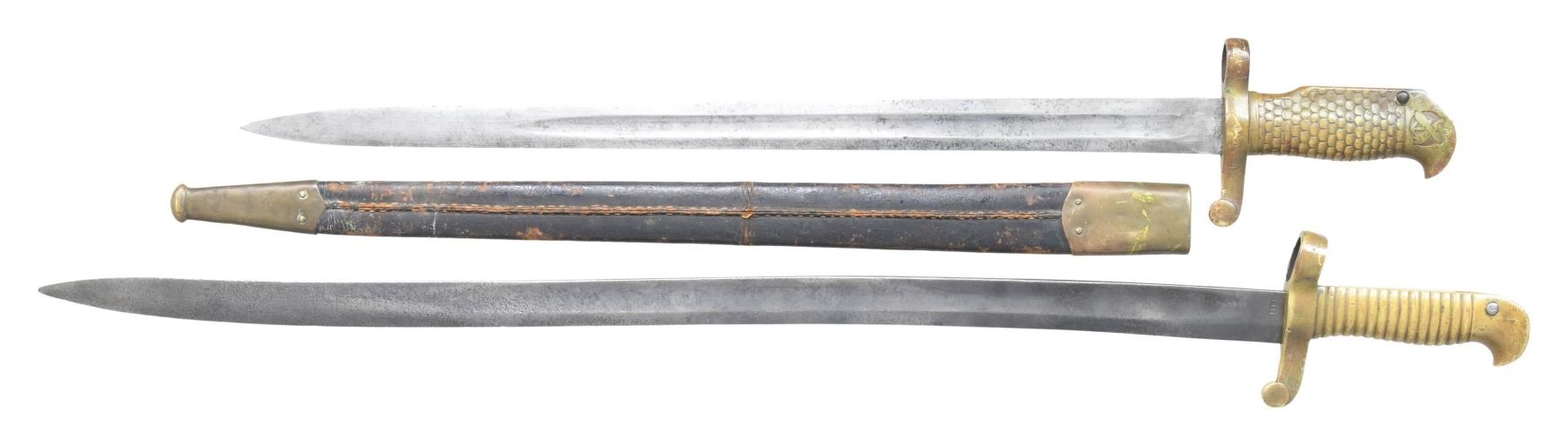 This group contains 1 / US M1841 saber bayonet by Remington Measuring 30 3/8" overall with a 25 1/2" blade. The plain blade has a single fuller and is stamped "1861" at the ricasso. The solid brass hilt is stamped "5400" on the flat. No scabbard. 1 / US M1870 Navy Rifle bayonet measuring 24 3/4" overall with a 20" blade. The plain blade had a single central fuller and is stamped on the ricasso "AMES MF'G CO. CHICOPEE MASS" & "U.S.N. G.G.S 1871". Solid brass hilt with crossed anchor & cannon at the pommel. Brass & leather scabbard. CONDITION: M1841 has average wear with a slightly bent muzzle ring. M1871 has average wear with a strong, but scuffed, scabbard that is missing its frog stud. (02-24093/BF). $300-500.