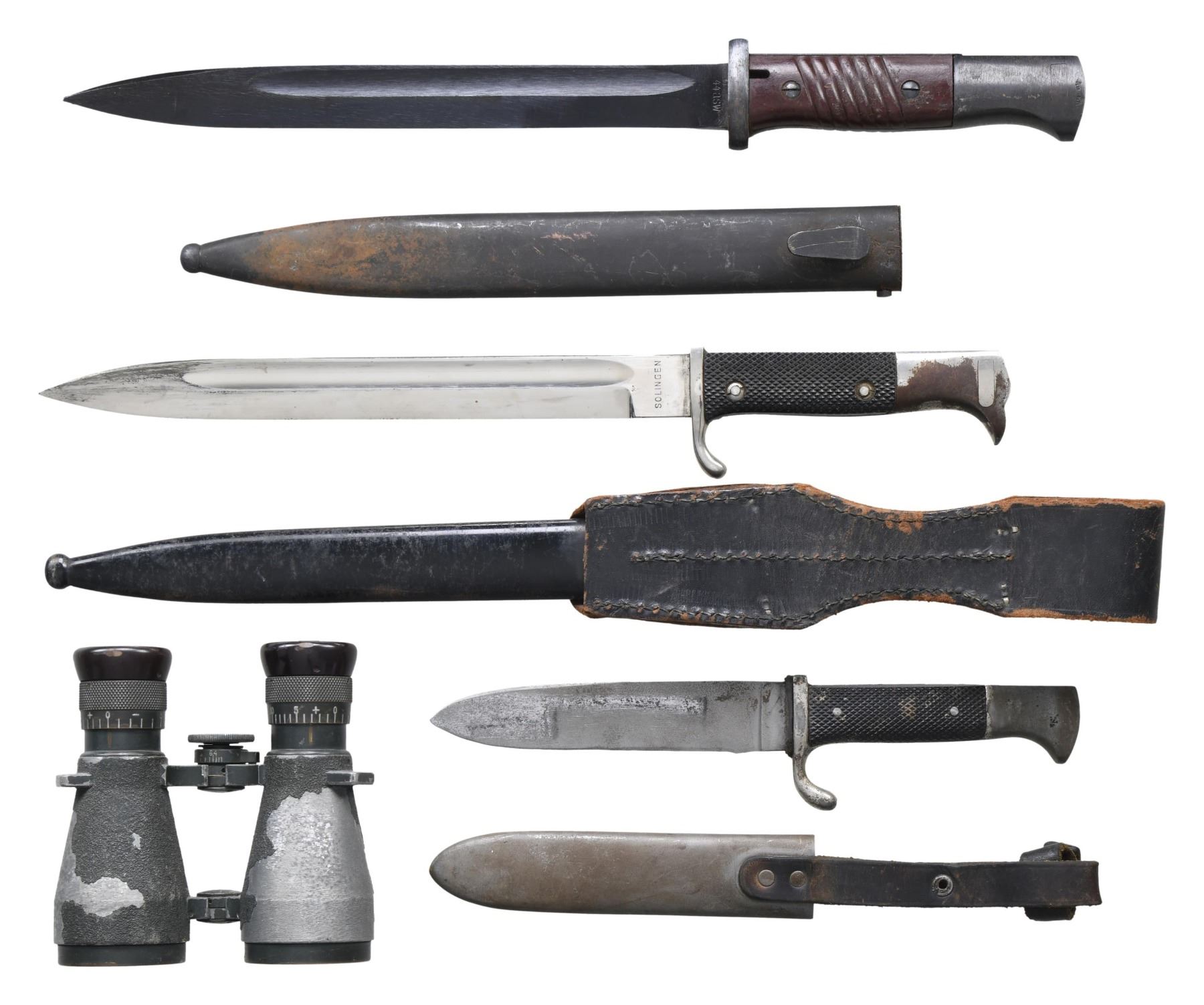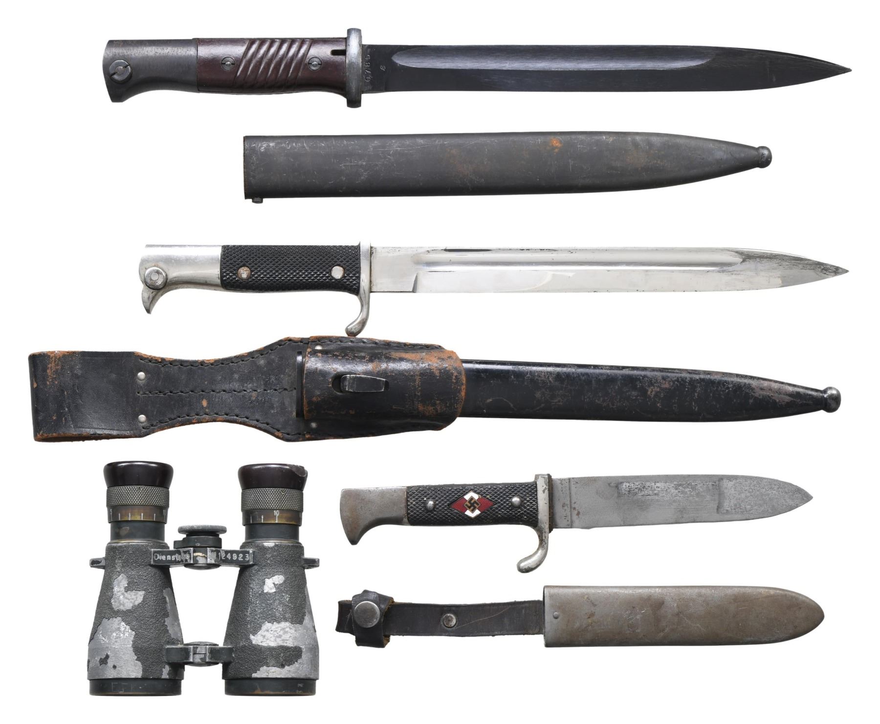 This lot includes 1 / K98 bayonet and scabbard with matching serial numbers. Blued blade with dark brown composite grips. 1 / Wehrmacht dress bayonet with a plated blade marked "SOLINGEN". Plated hilt, black enameled scabbard and black leather frog. 1 / HJ side knife with sheath. Plain unmarked blade with a plated hilt. 2 piece black composite grip with an enameled HJ diamond inset in the front grip. Iron sheath with integral leather belt loop. 1 / Pair of field binoculars with a partial gray/green finish marked "Dienstglass No. 124923" on the top. The adjustment wheel has further markings. CONDITION: bayonets show light to moderate wear. Blade of HJ knife has an oxidized finish plus the grip and sheath show moderate wear. Binoculars function but show ample wear. (02-24500-2/BF). $350-500.