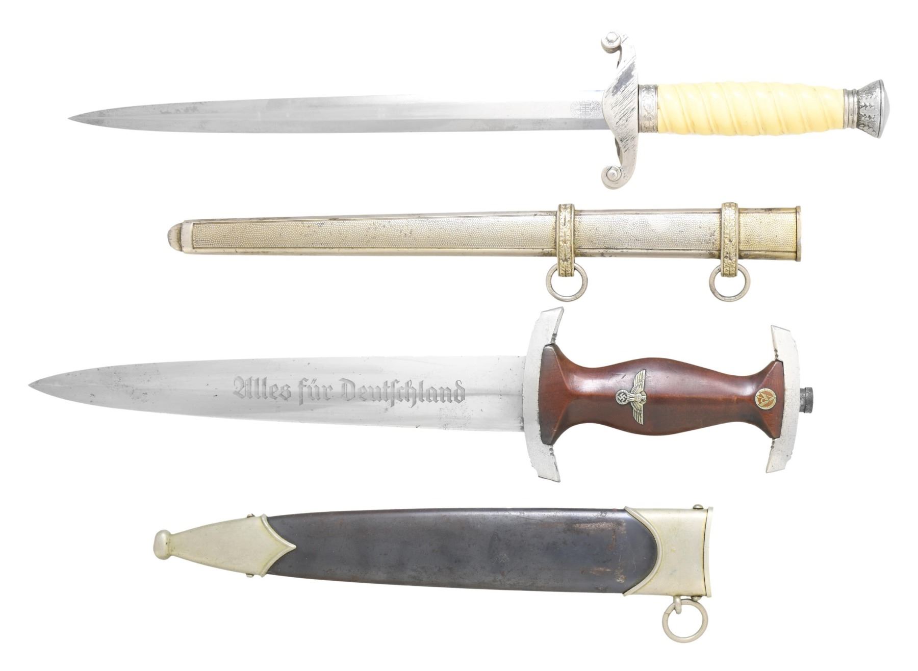 1) NSKK. A good example of an NSKK dagger measuring 14 3/4" overall with an engraved blade that reads "Alles fur Deutschland". The reverse is marked "C & R LINDER (logo) SOLINGEN-WEYER". Plated crossguard and pommel guard. Brown wood grip with eagle and enameled SA button. Black anodized scabbard with plated mounts. CONDITION: blade shows primarily scabbard wear and the hilt shows light wear. Scabbard has a nice finish showing light wear. 2) ARMY. A nice example of an Army dagger measuring 15 1/2" overall with a plain blade marked " E. & F. HORSTER (logo) SOLINGEN". Plated eagle crossguard with plated oak leaf embellished pommel and ferrule. Off white grip and a plated scabbard. CONDITION: light wear with primarily scabbard wear to the blade. Scabbard shows light wear. (02-24083/BF). $800-1200.
