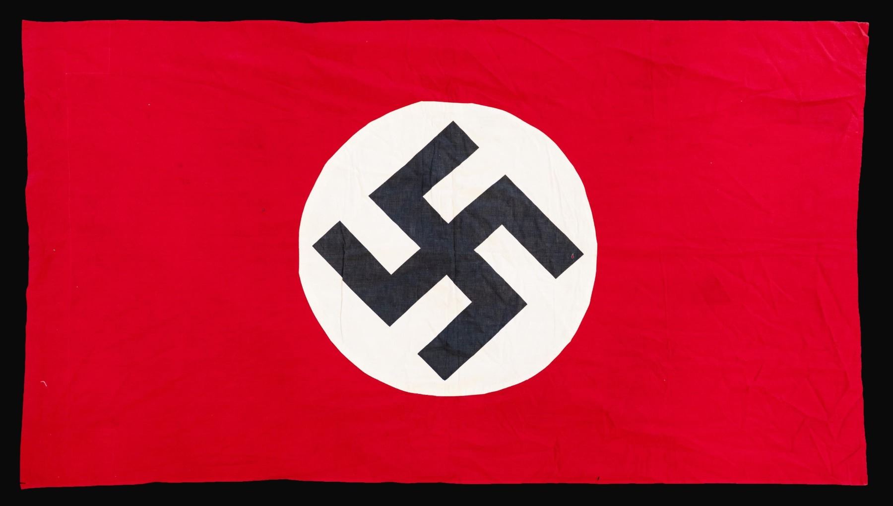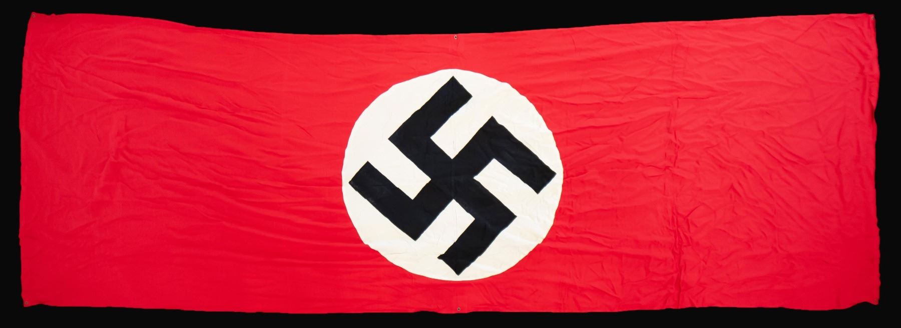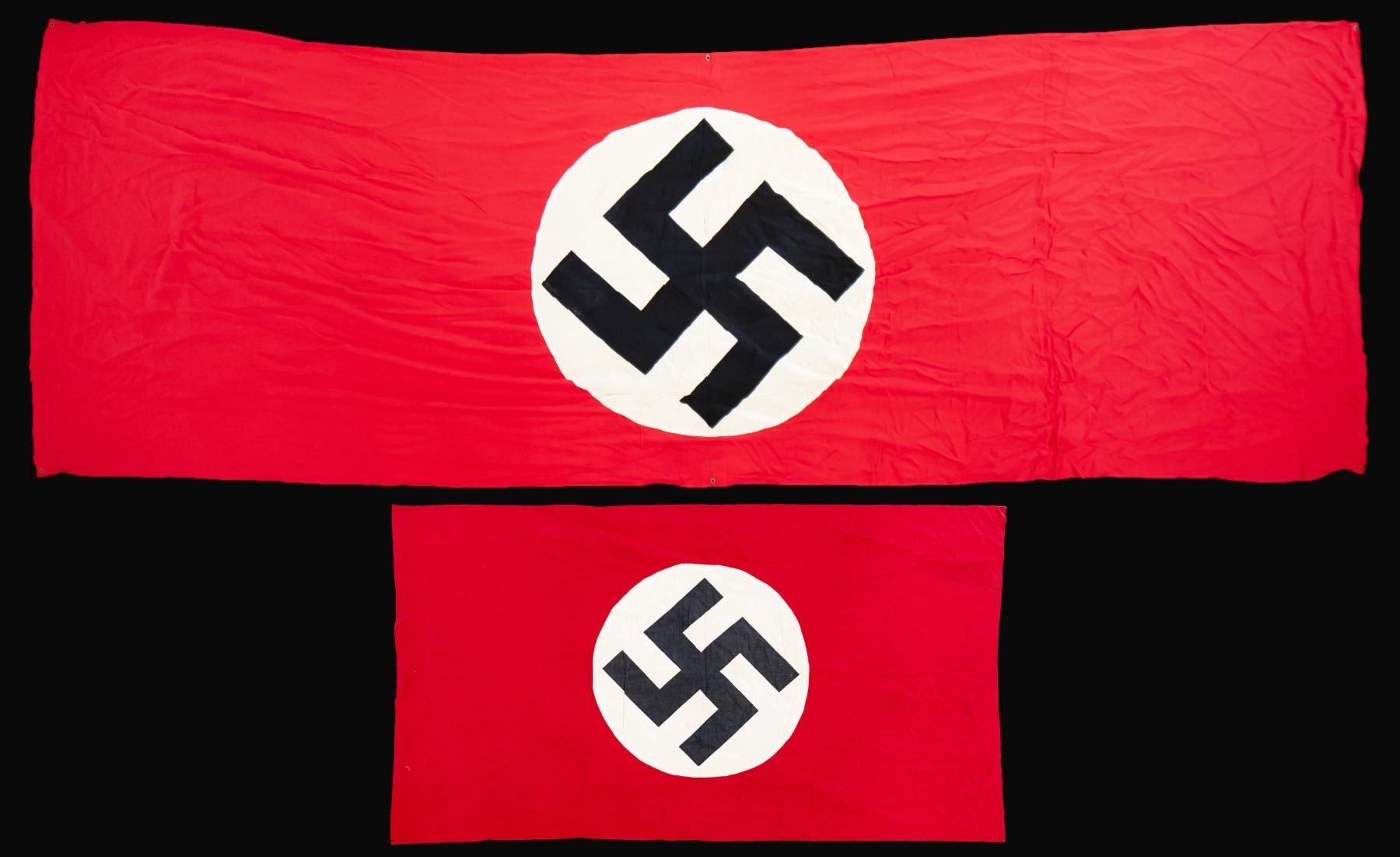 1) This flag measures approx. 74" x 40" and features a printed black party symbol on a sewn white circular disk, all on a red field. The hoist has a 3 1/2" fold-over to facilitate insertion of a pole. CONDITION: flag shows light wear overall with no notable damage. 2) A single-sided party banner measuring approx. 180" x 90". The banner features a printed black party symbol on a sewn white circular disk, all on a red field. There is a reinforced gray metal grommet at each corner of the banner and at the mid-point of the fly. CONDITION: flag show light wear overall with no notable damage or staining. (02-23860/BF). $500-700.