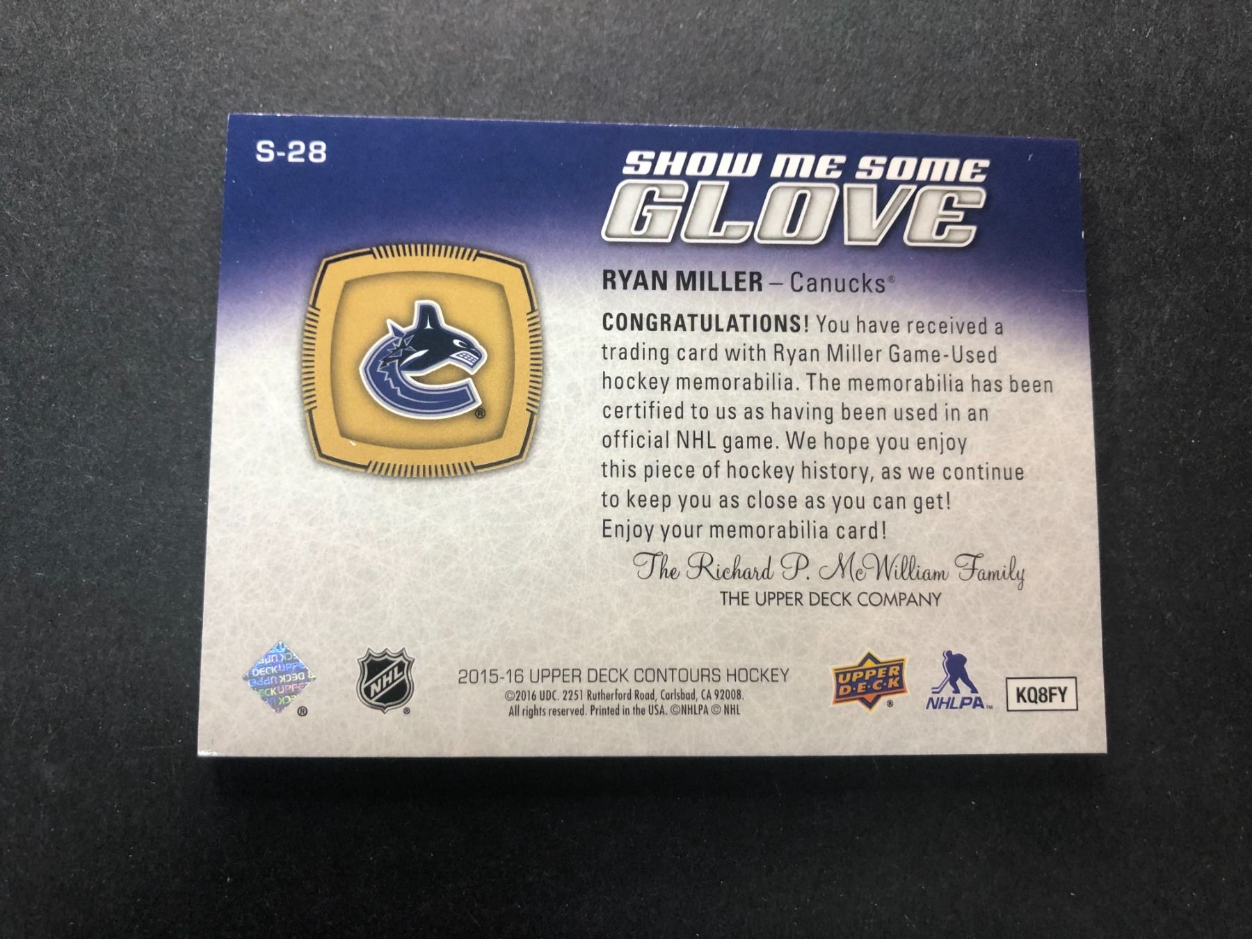 2015-2016 Upper Deck Show Me Some Glove jersey card