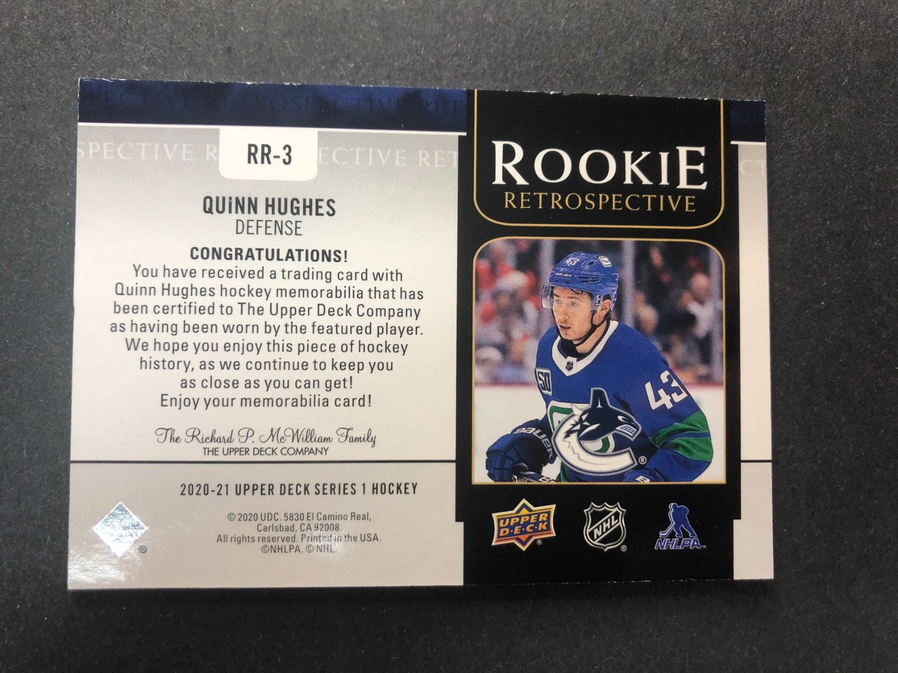 2020-21 Upper Deck Rookie Retrospective jersey card